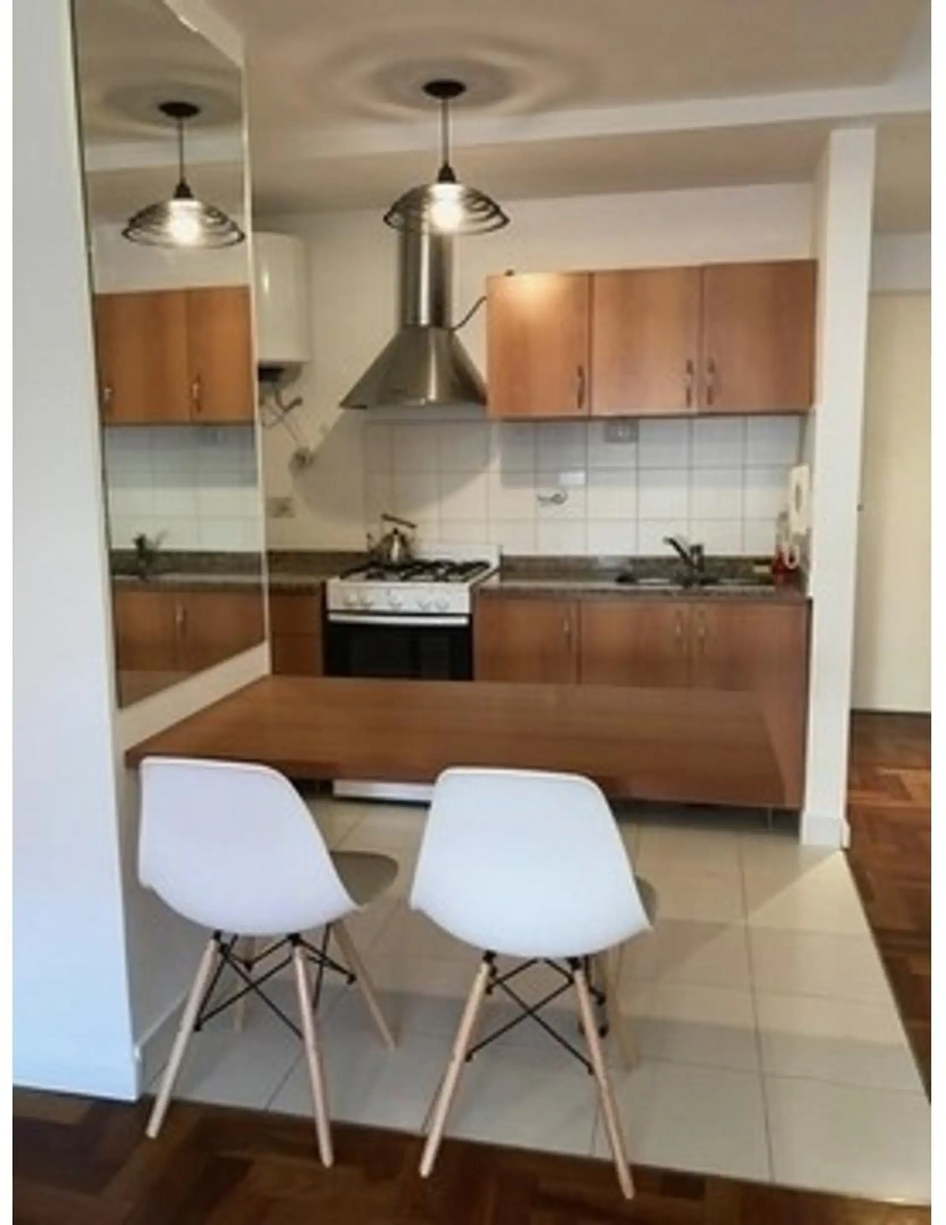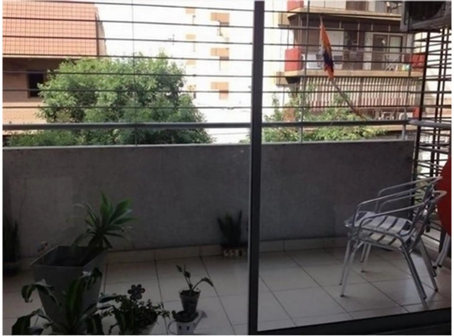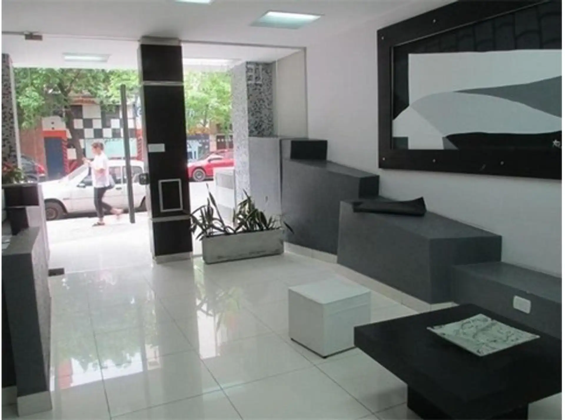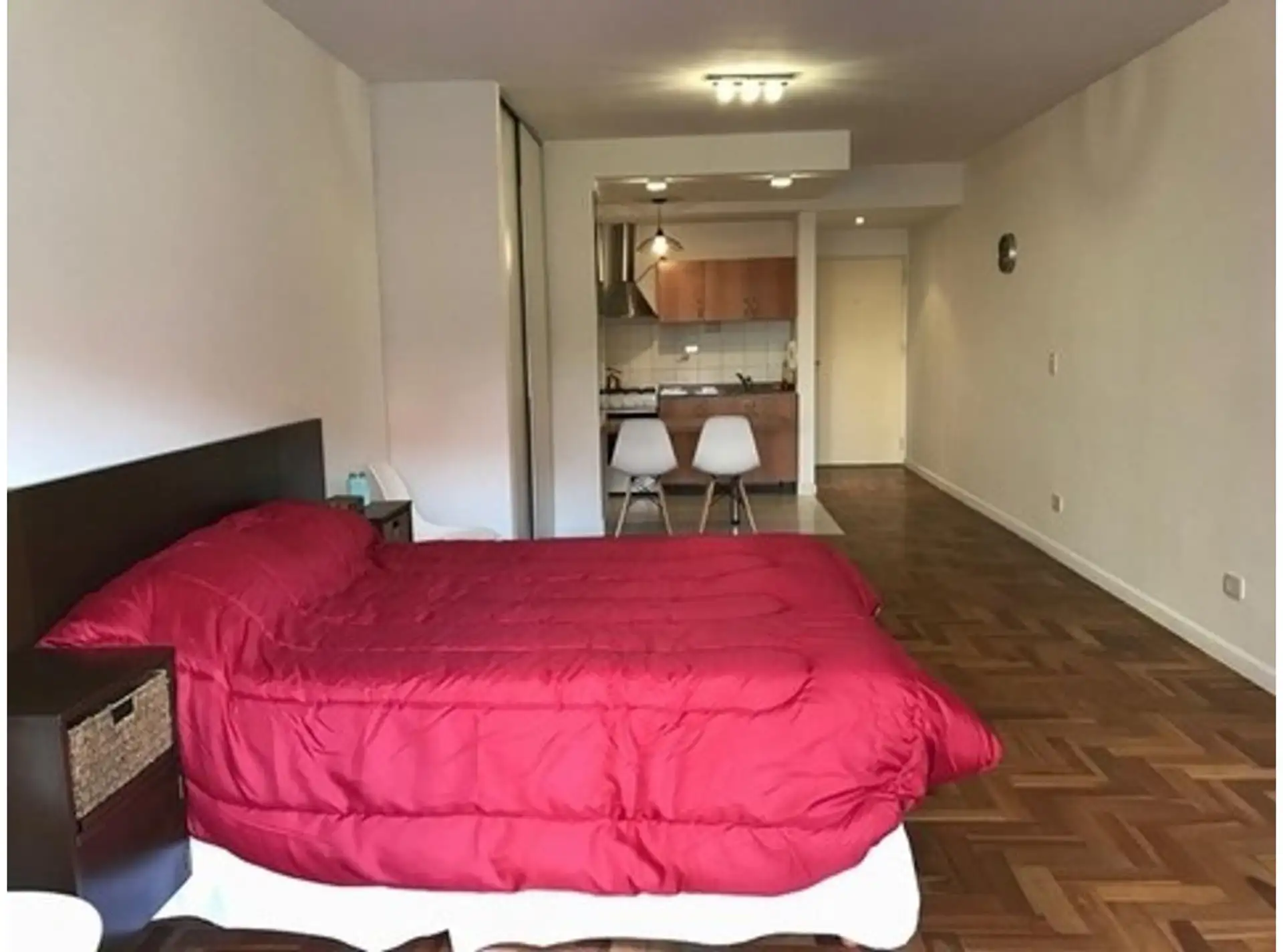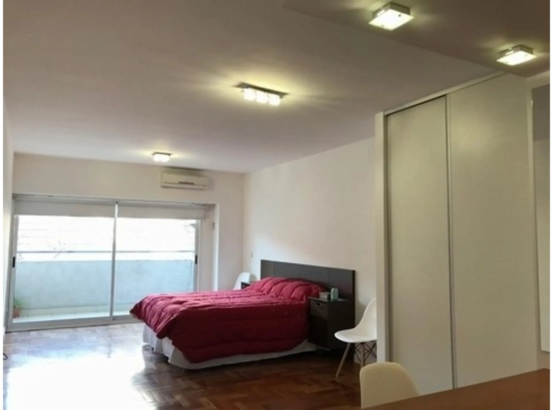 Квартира-студия в Villa Crespo. Вид на улицу из большого оконного проёма, есть балкон. В квартире предусмотрены TV и Wi‑Fi, небольшая кухня и просторная ванная комната. В здании указаны бассейн, прачечная (laundry), солярий и общая зона с грилем (на последнем этаже). Заселение: около 3 месяцев, первый месяц аренды, месяц залога и месяц комиссии.