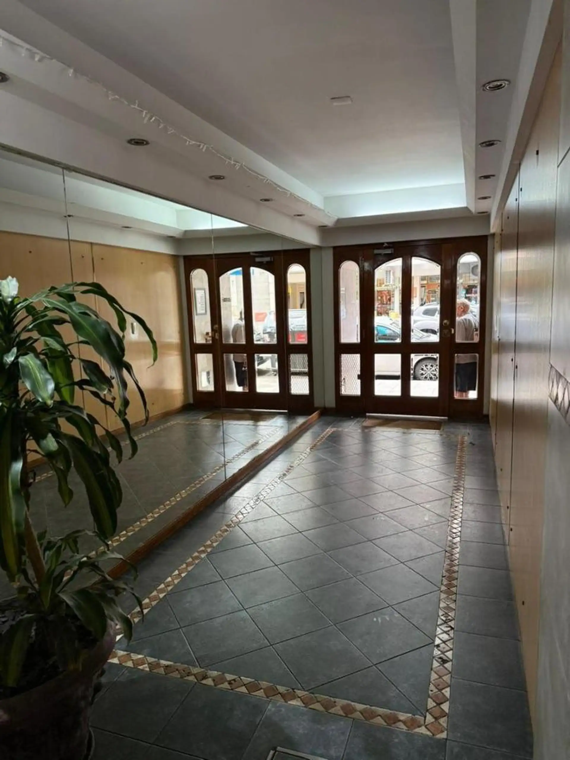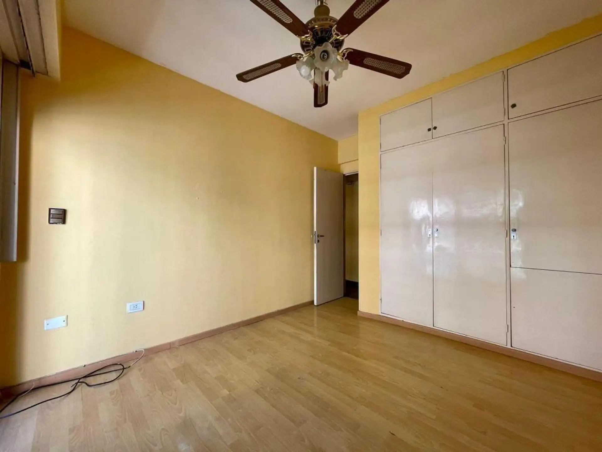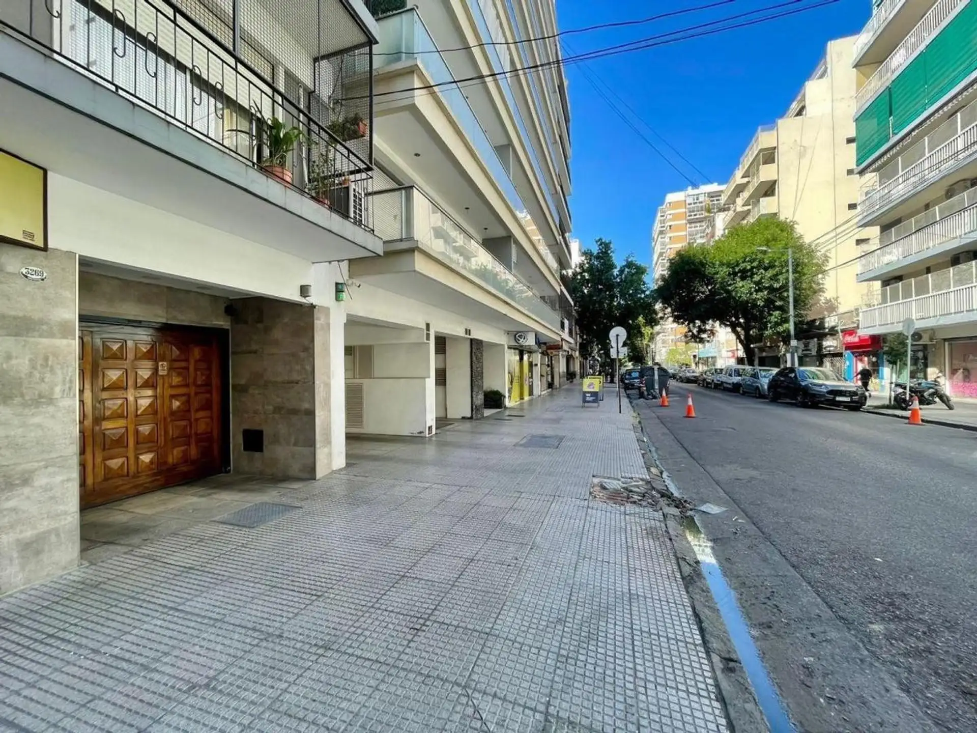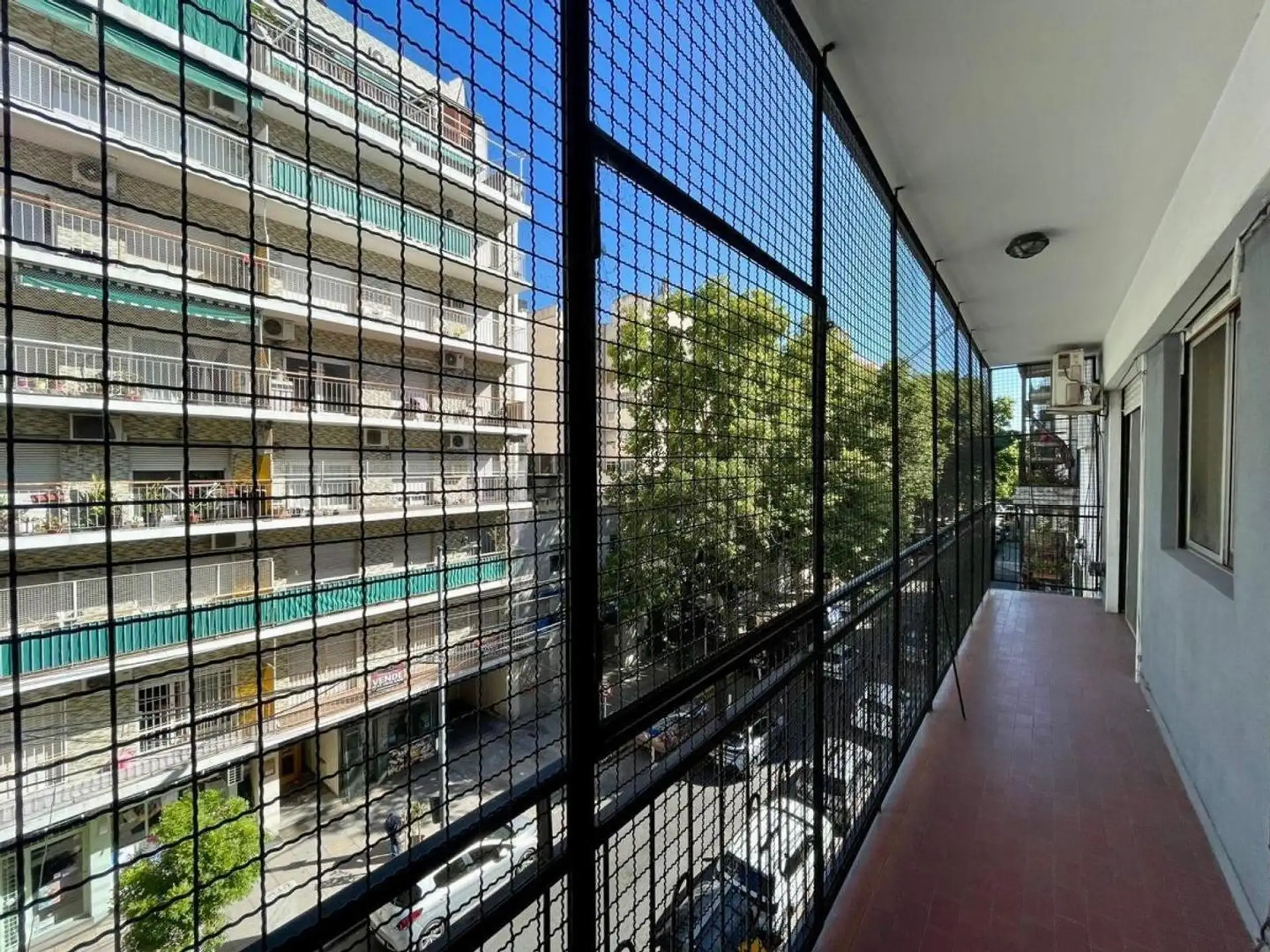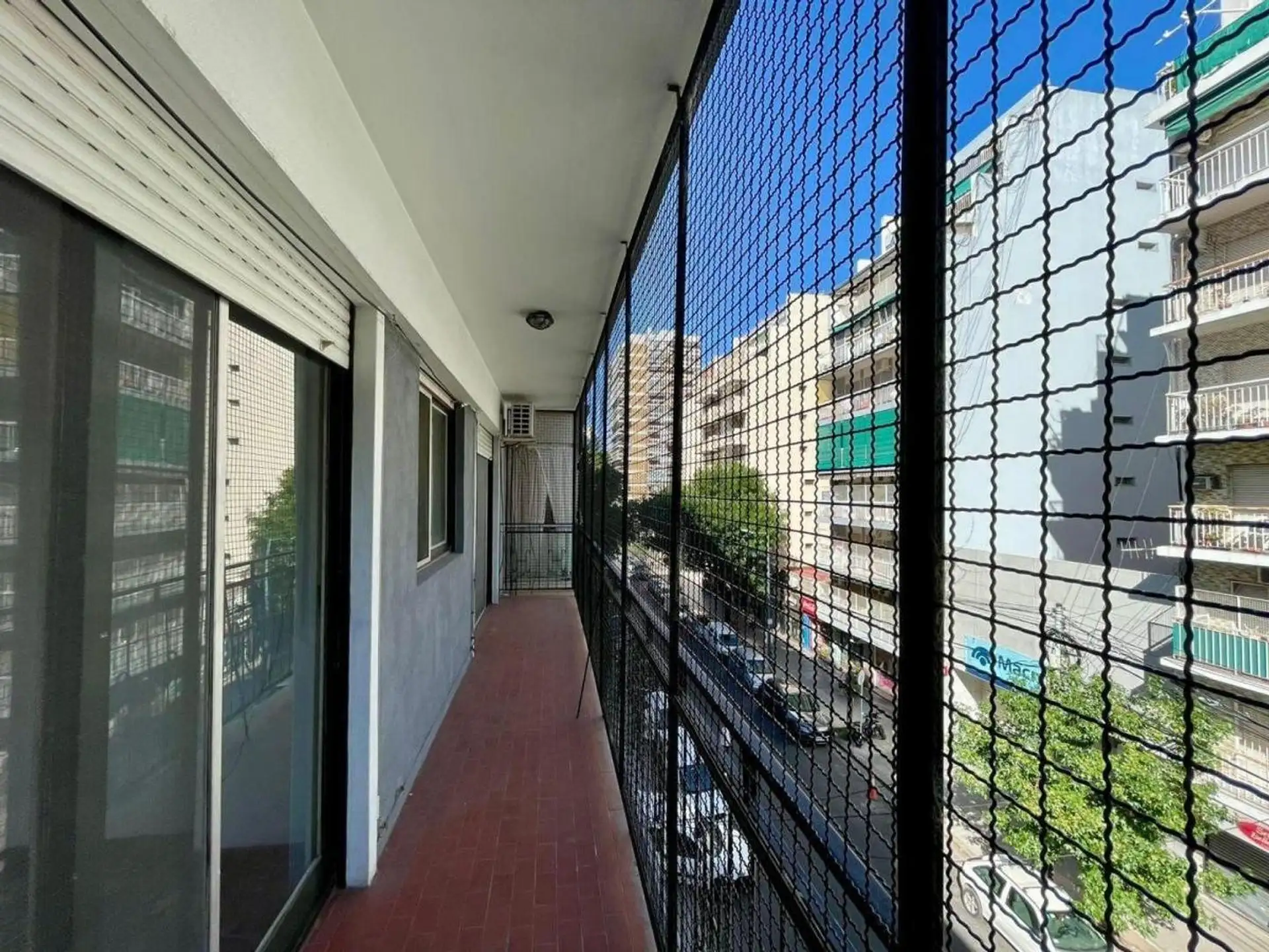 Квартира с 4 комнатами, 3 спальнями, площадью и составом помещений указана как 4 ambientes + dependencia, с закреплённым (fija) крытым парковочным местом. 3-й этаж, окна на улицу (al frente), с балконом (balcón corrido). Две входные группы: основная и служебная. В квартире есть гостиная-столовая с выходом на балкон, отдельная кухня с дневной столовой, 3 спальни со встроенными шкафами, полностью оборудованная ванная с естественной вентиляцией и туалет, а также просторная служебная комната (depend