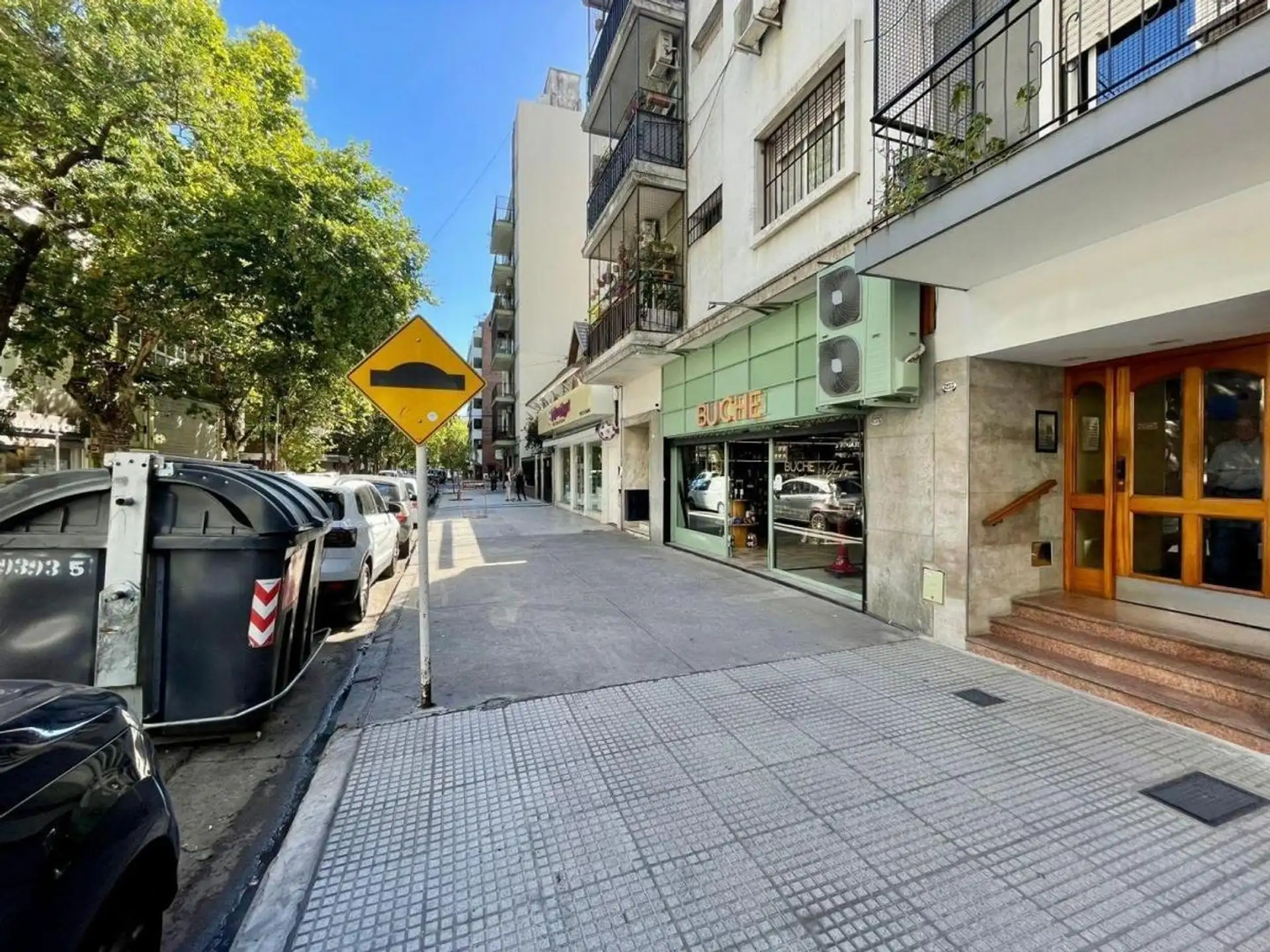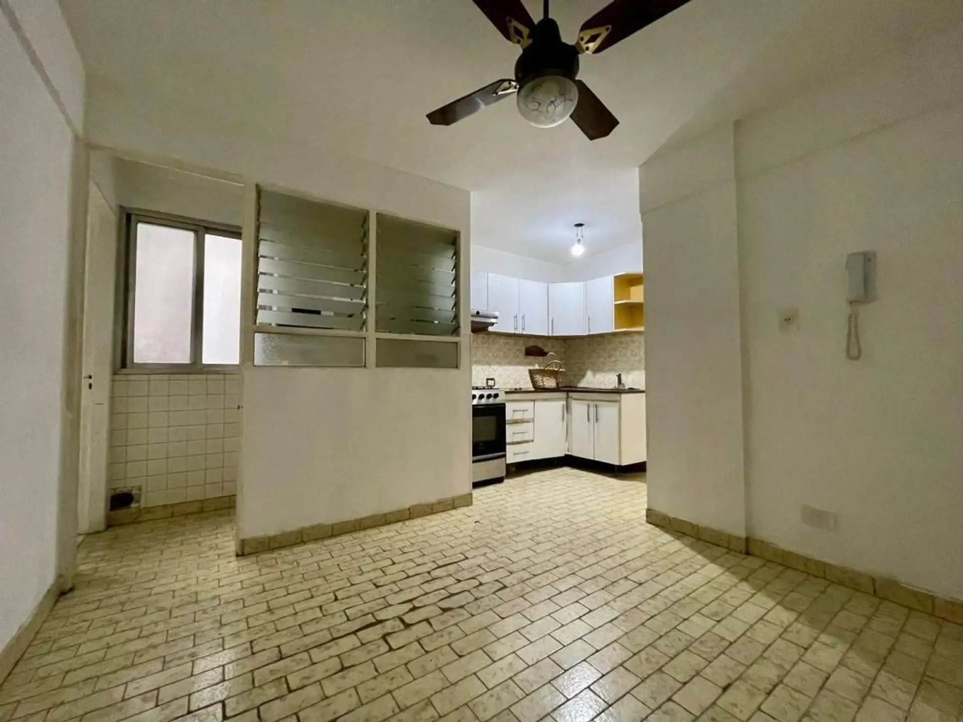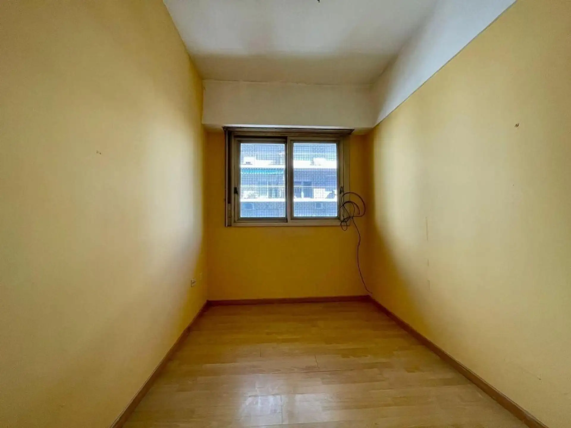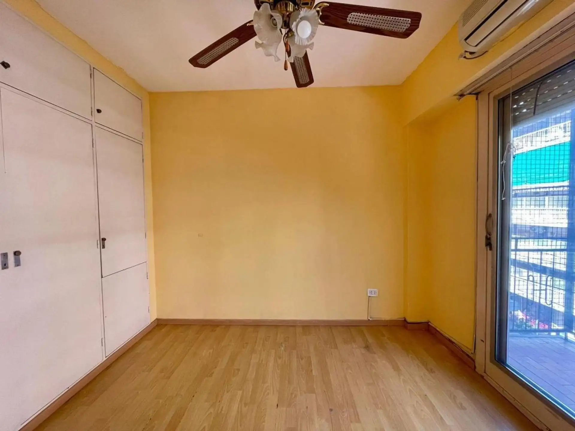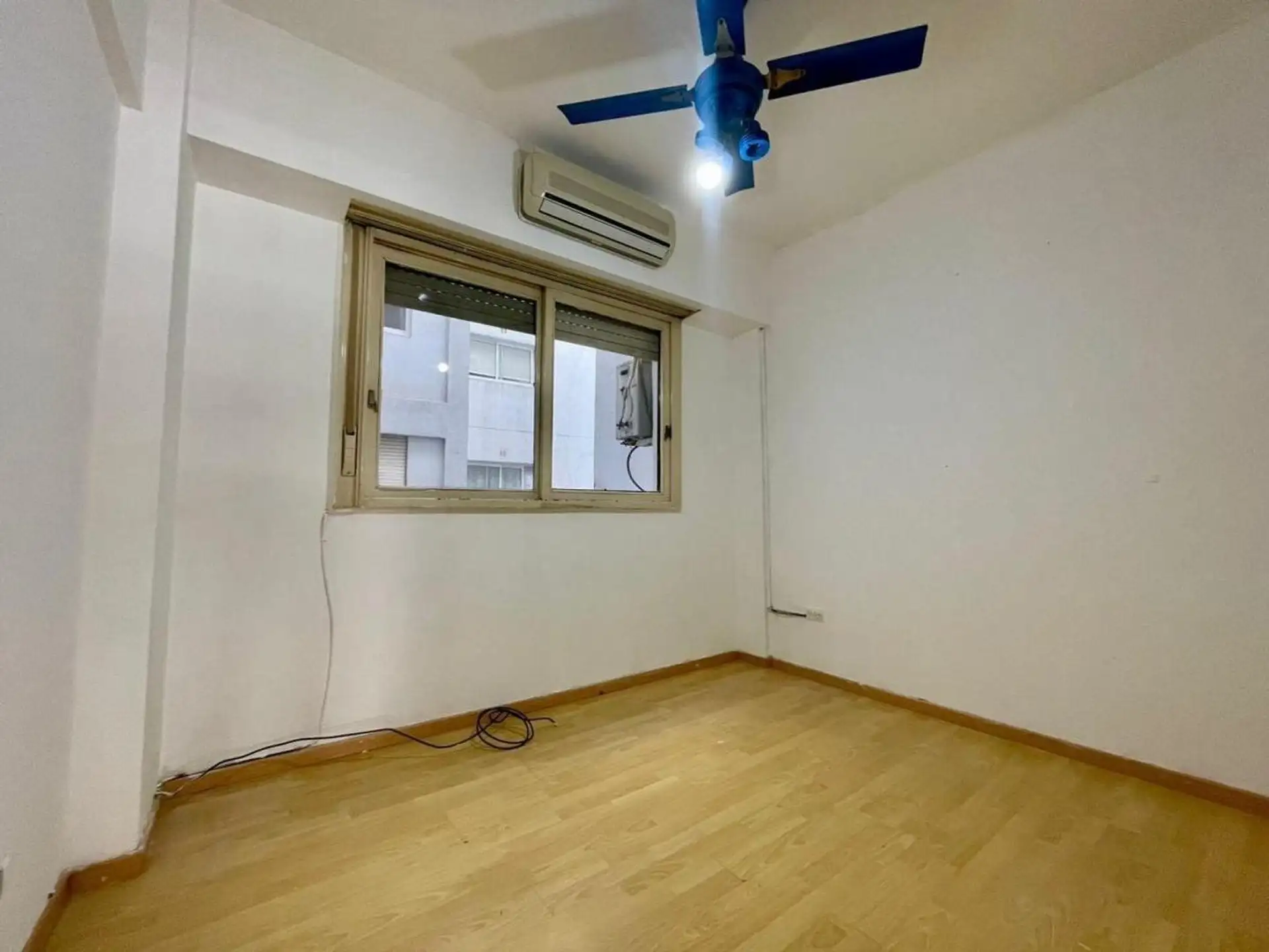 Квартира с 4 комнатами, 3 спальнями, площадью и составом помещений указана как 4 ambientes + dependencia, с закреплённым (fija) крытым парковочным местом. 3-й этаж, окна на улицу (al frente), с балконом (balcón corrido). Две входные группы: основная и служебная. В квартире есть гостиная-столовая с выходом на балкон, отдельная кухня с дневной столовой, 3 спальни со встроенными шкафами, полностью оборудованная ванная с естественной вентиляцией и туалет, а также просторная служебная комната (depend