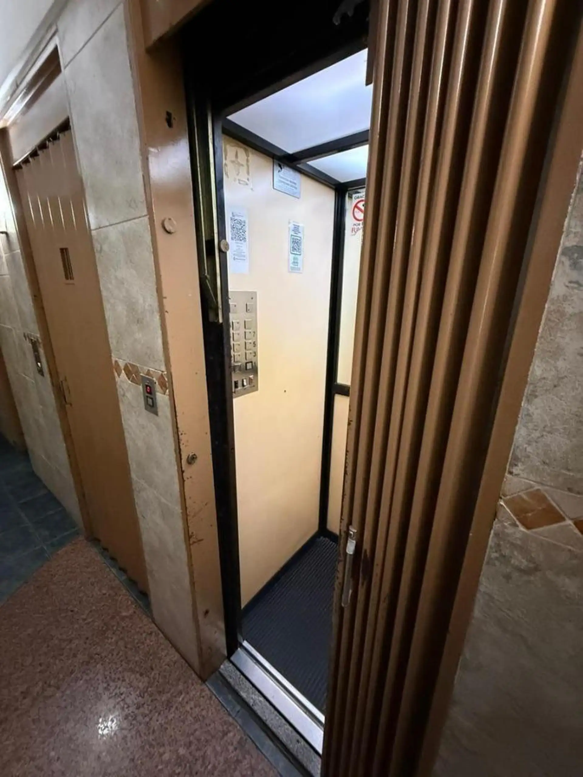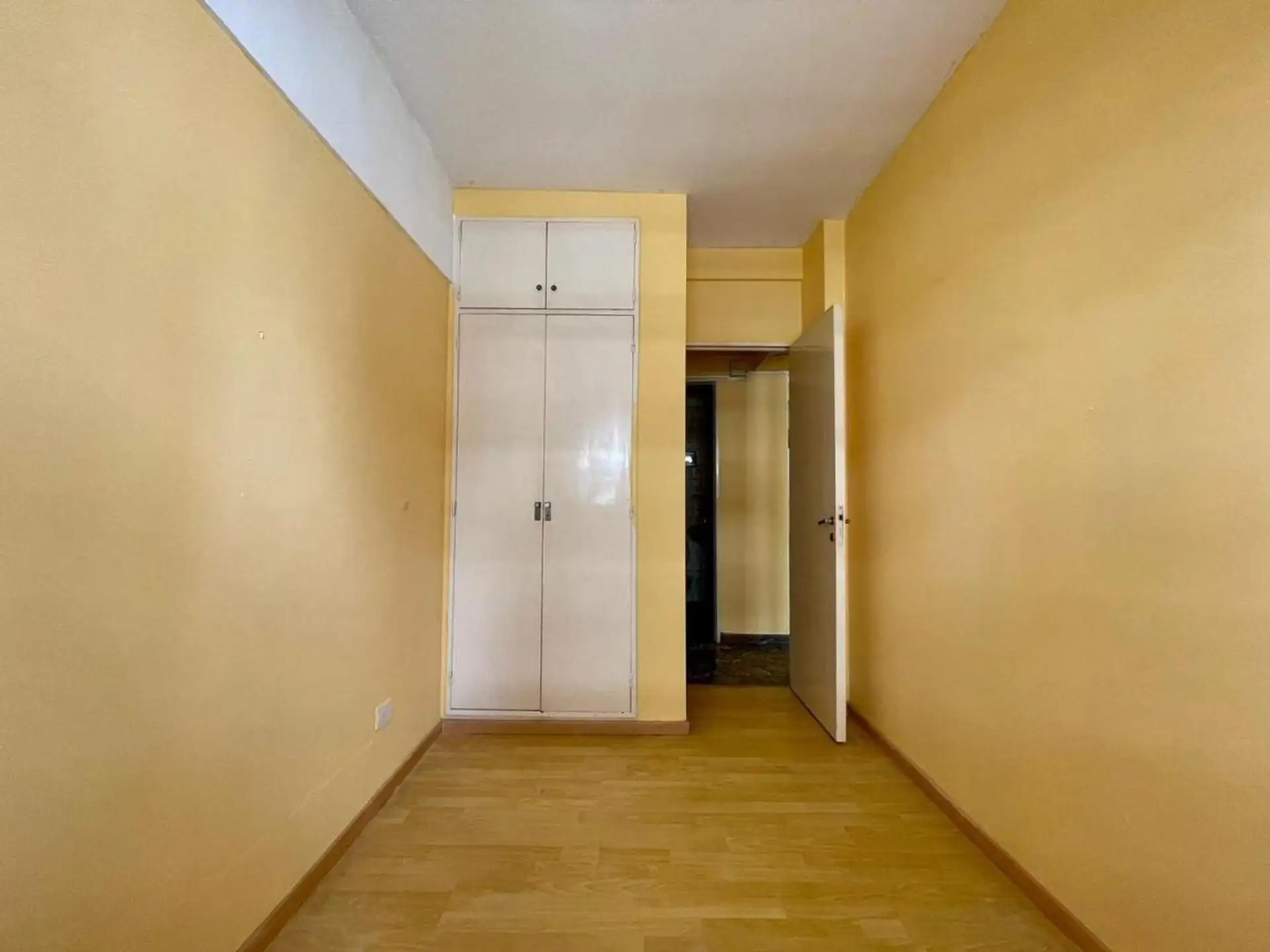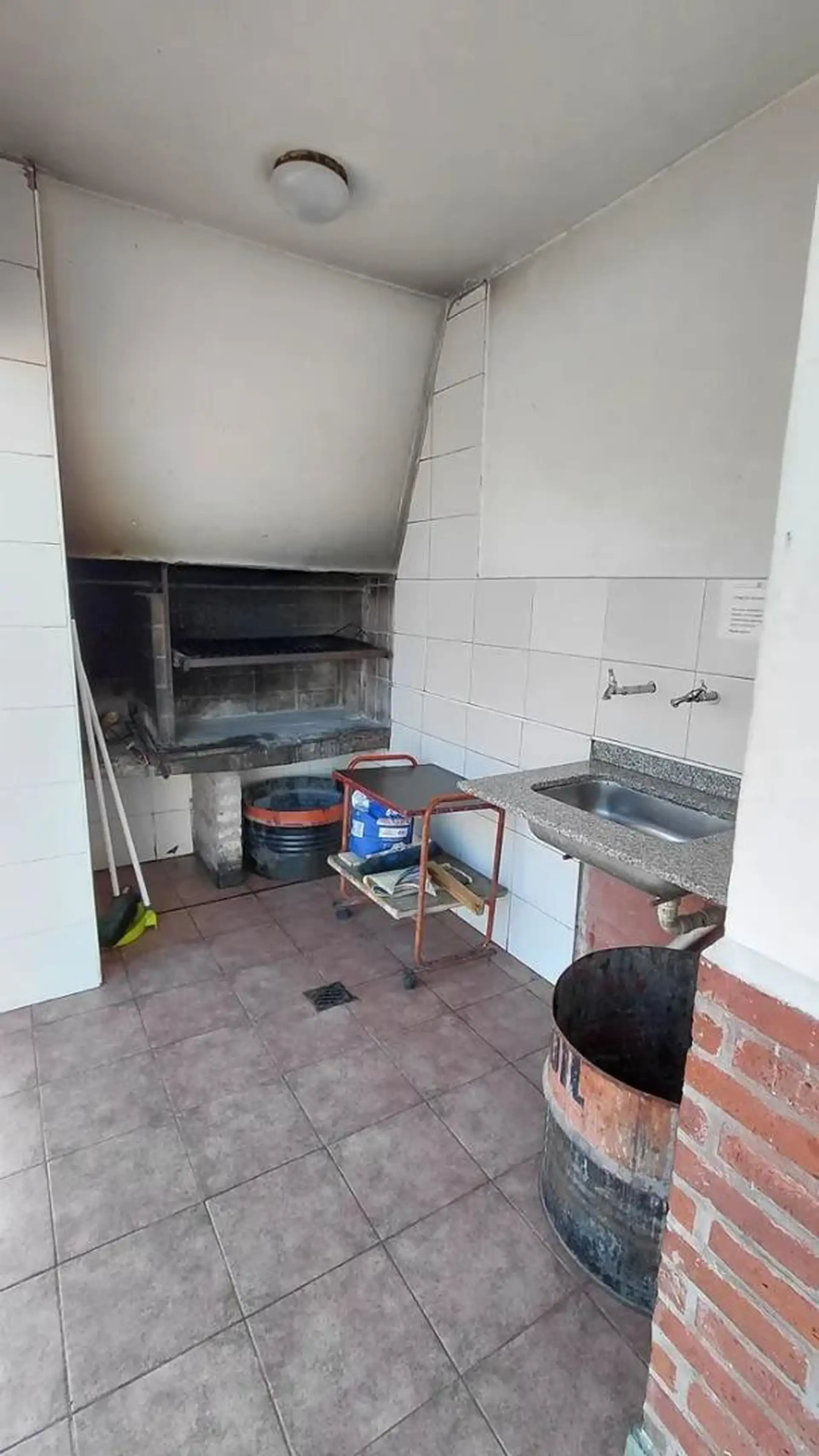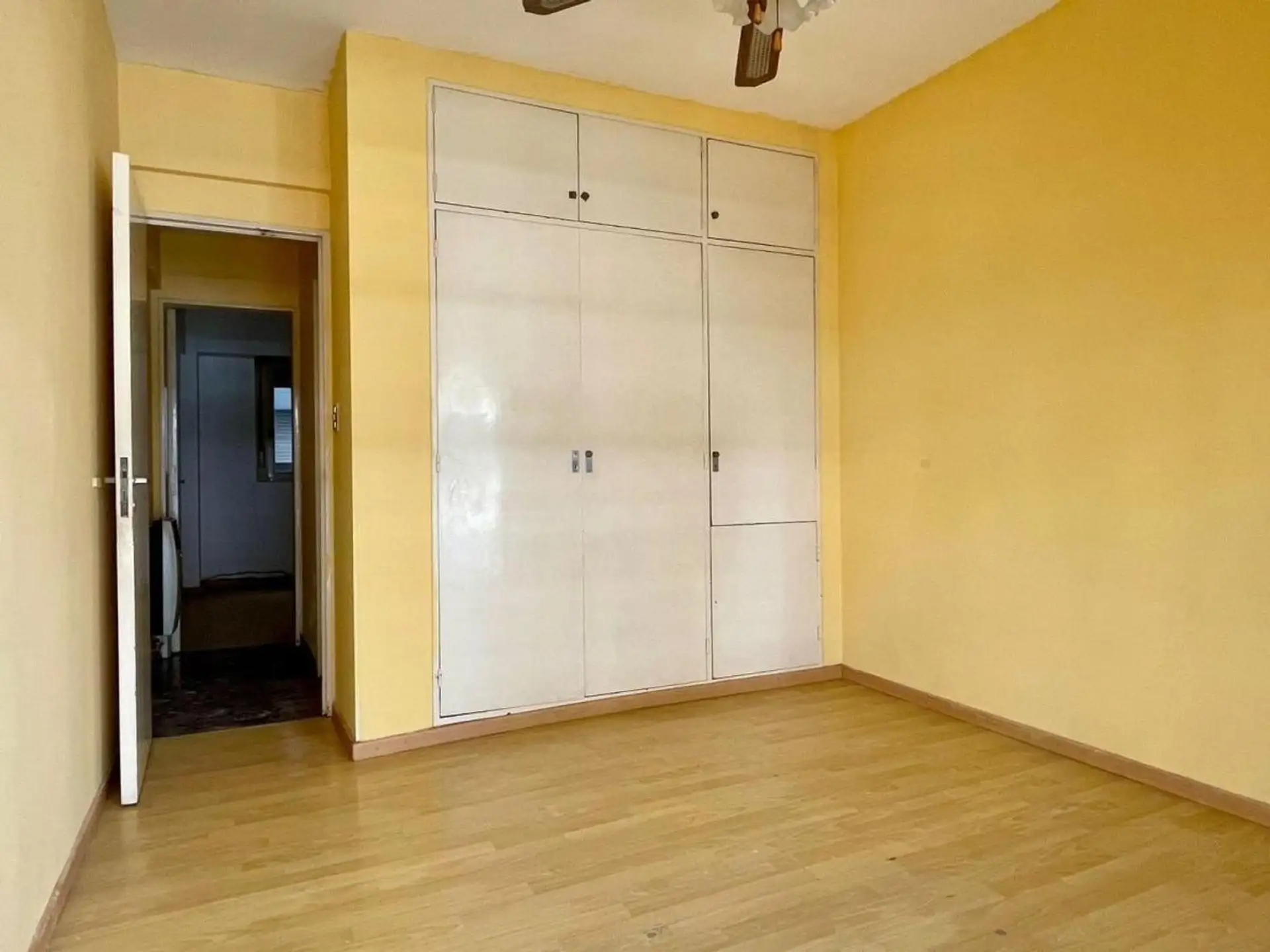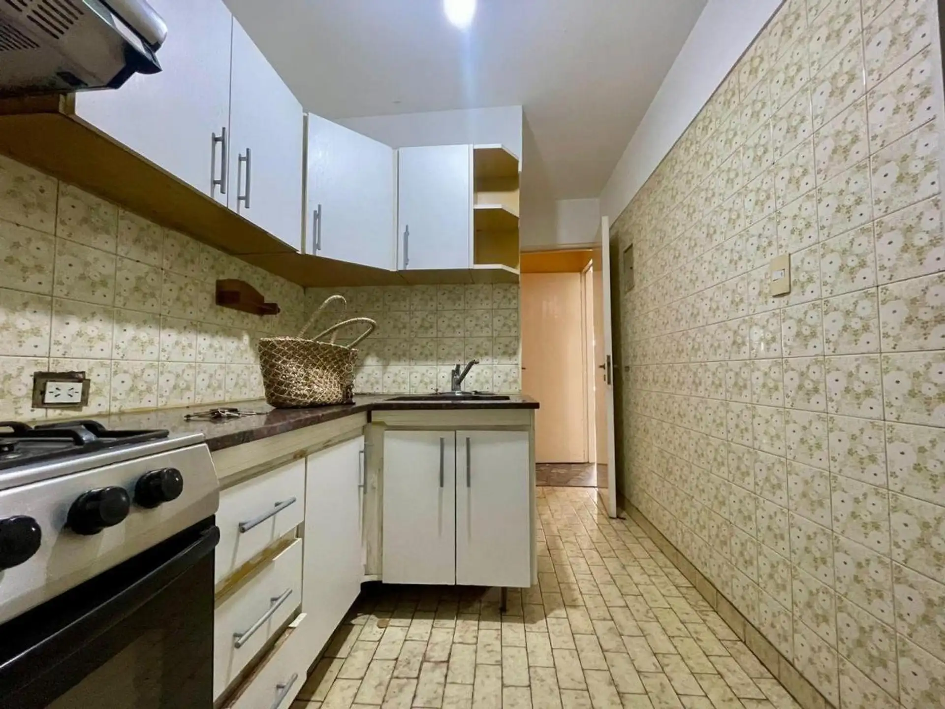 Квартира с 4 комнатами, 3 спальнями, площадью и составом помещений указана как 4 ambientes + dependencia, с закреплённым (fija) крытым парковочным местом. 3-й этаж, окна на улицу (al frente), с балконом (balcón corrido). Две входные группы: основная и служебная. В квартире есть гостиная-столовая с выходом на балкон, отдельная кухня с дневной столовой, 3 спальни со встроенными шкафами, полностью оборудованная ванная с естественной вентиляцией и туалет, а также просторная служебная комната (depend