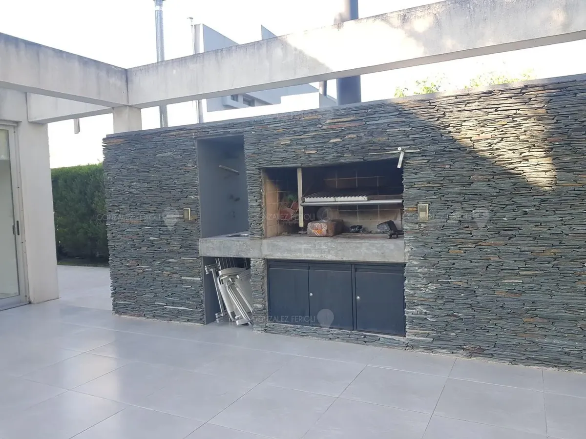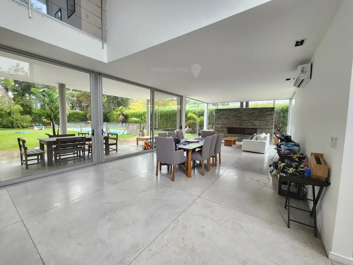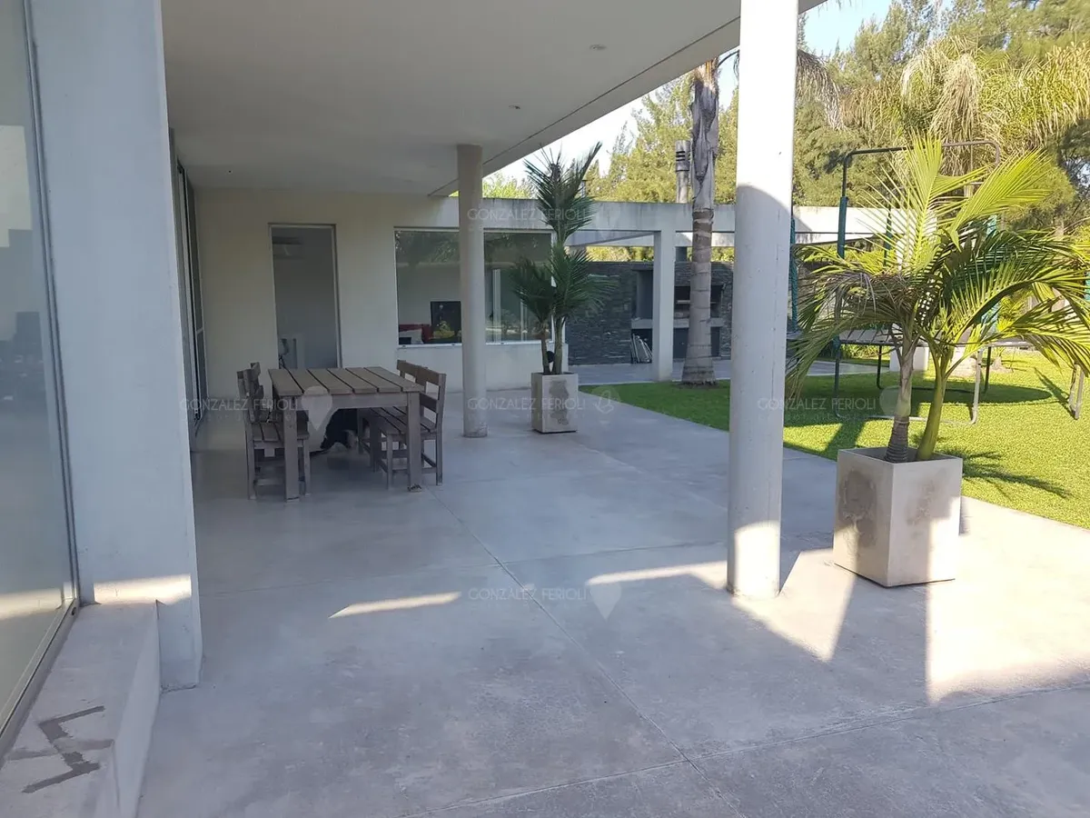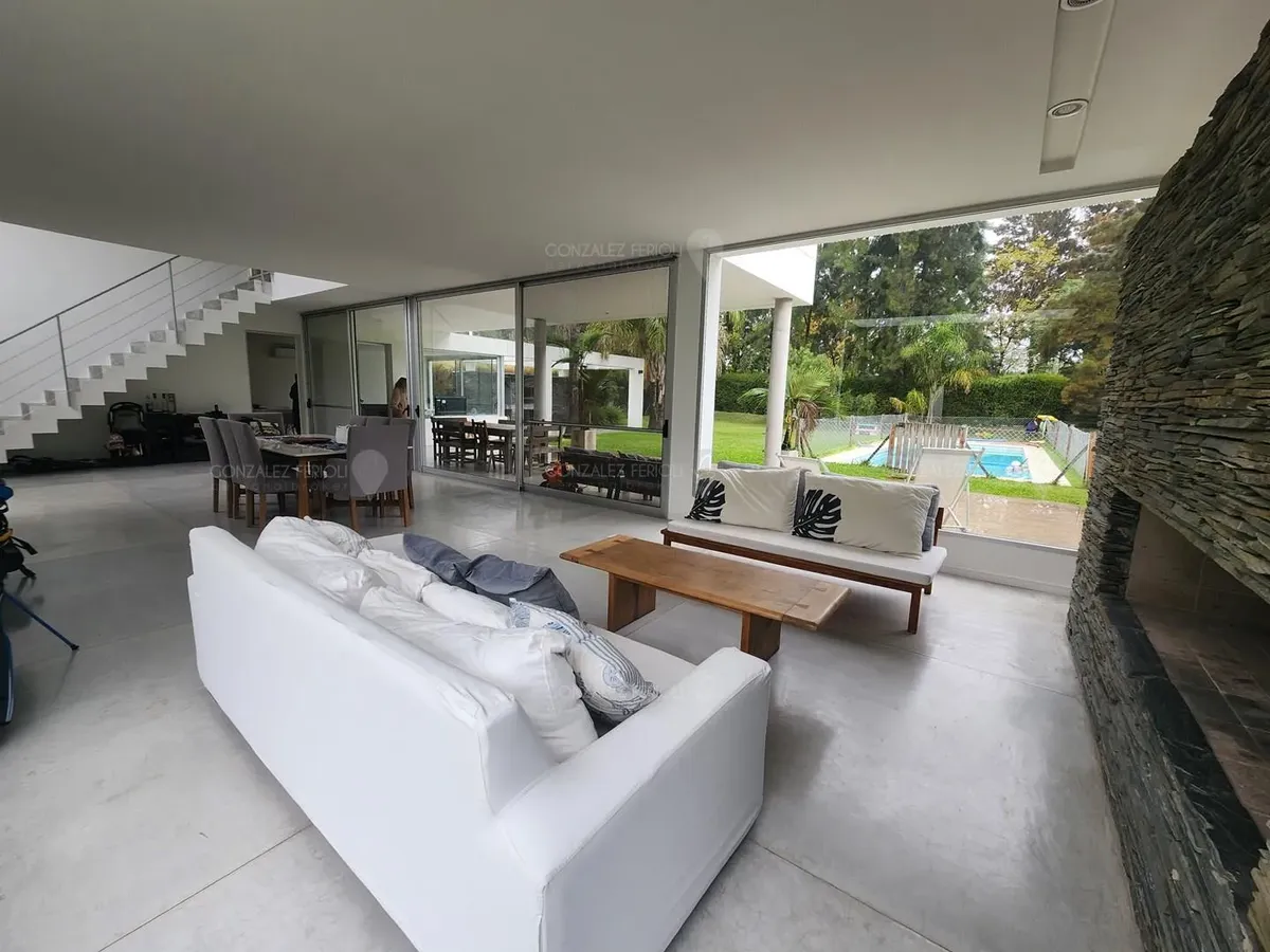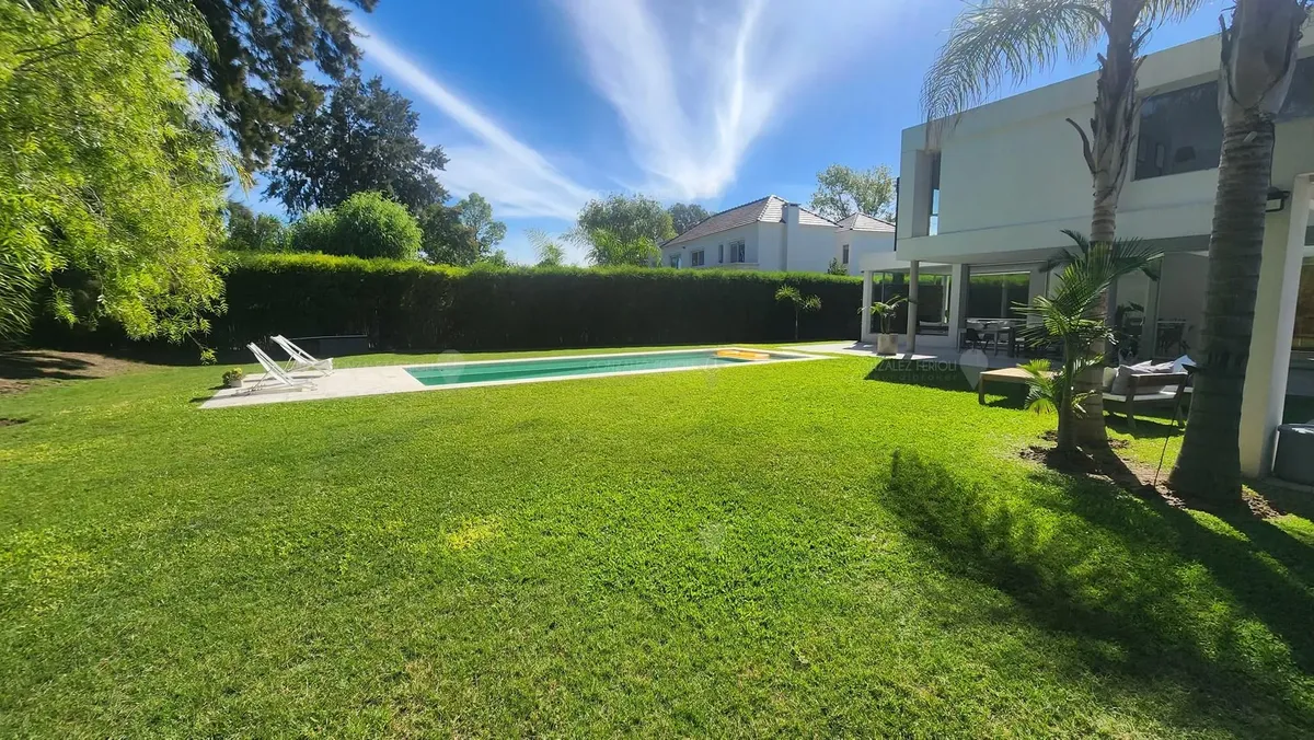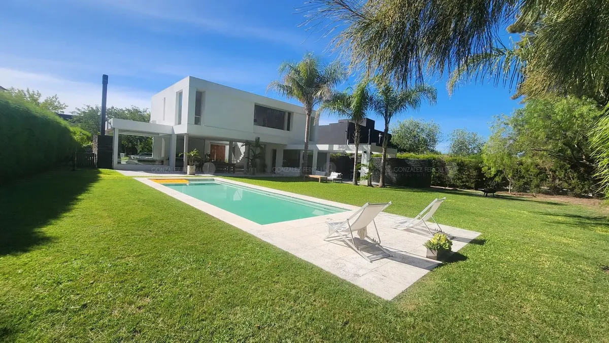 Современный дом рационалистического стиля на двух этажах в El Encuentro, General Pacheco. На первом этаже: гостиная-столовая с камином и большими окнами с видом на сад, гостевой туалет, просторная кухня с дневным обеденным местом, служебная комната с ванной, отдельная прачечная. Из гостиной выход на большую крытую галерею с зоной гриля, в доме есть паркованый сад с бассейном. На втором этаже расположены 3 спальни: главная с ванной комнатой и гардеробной, две дополнительные спальни, общая ванная