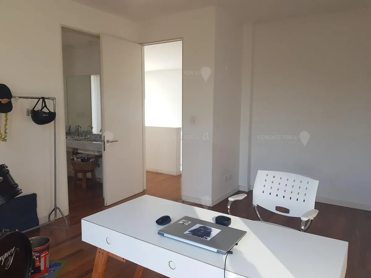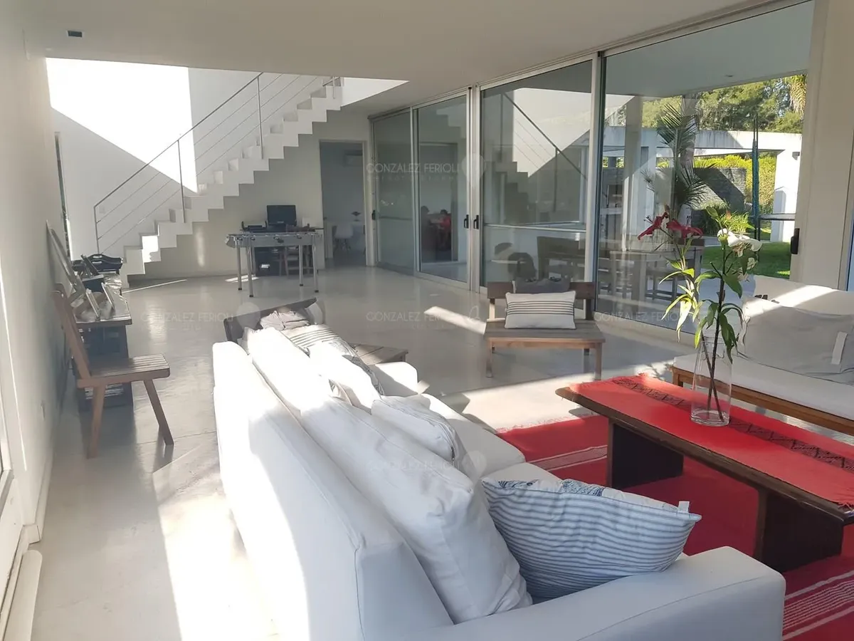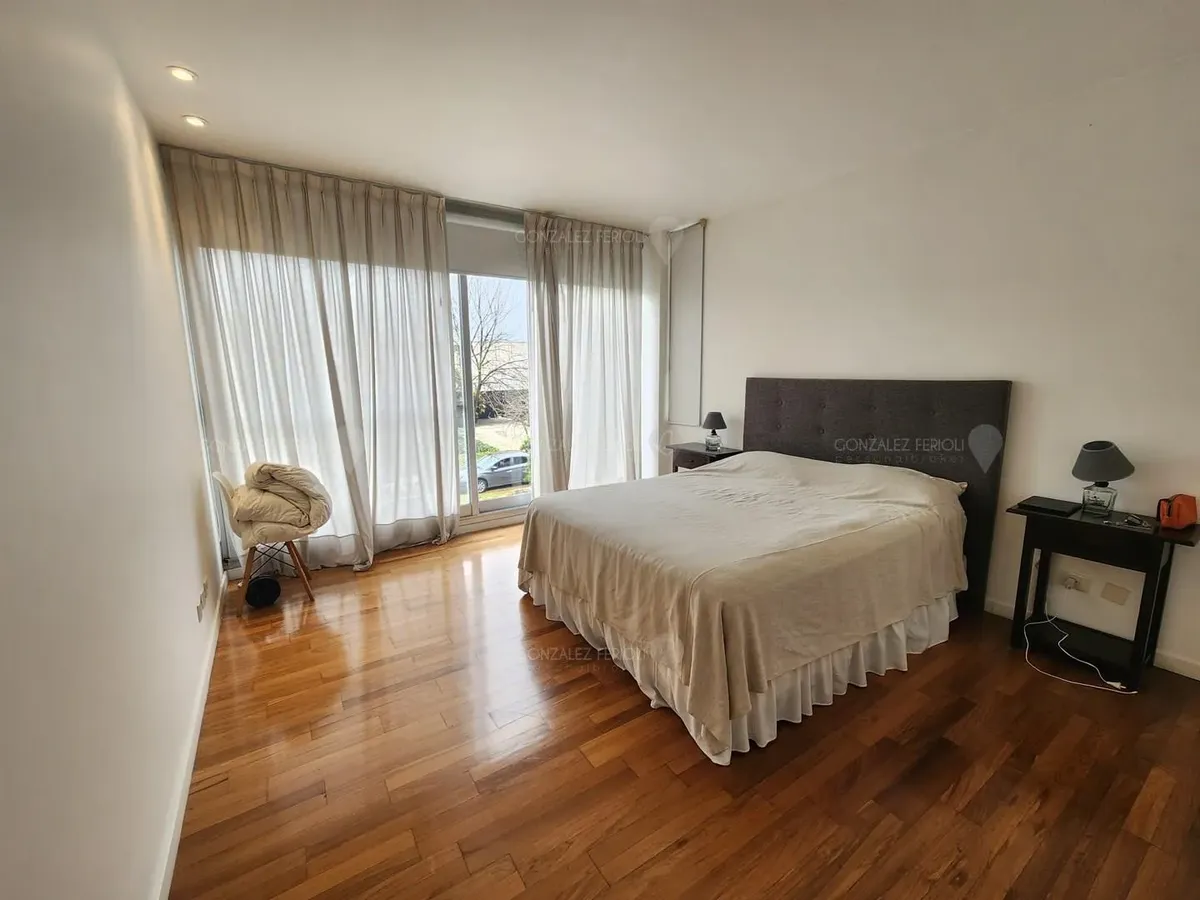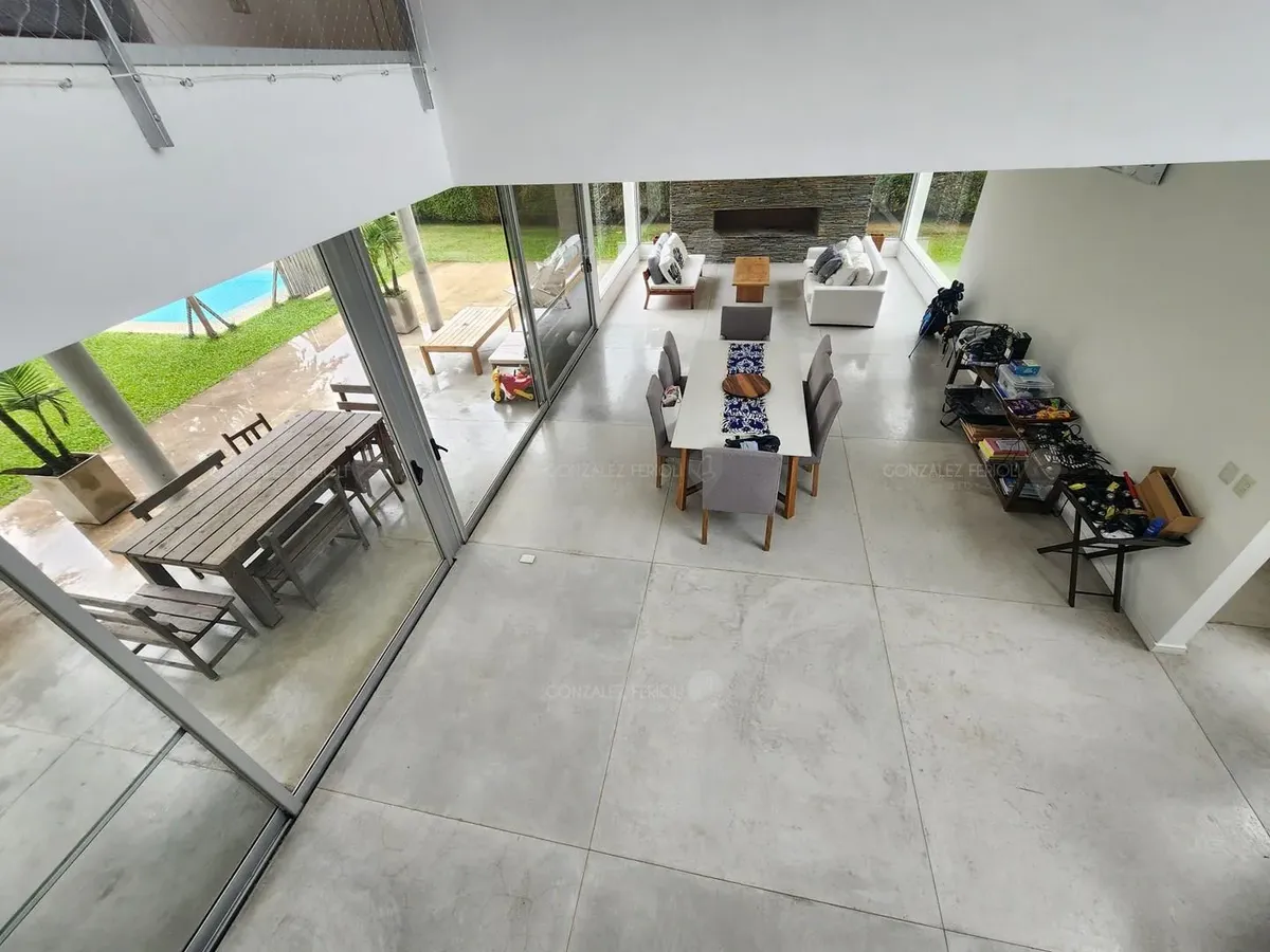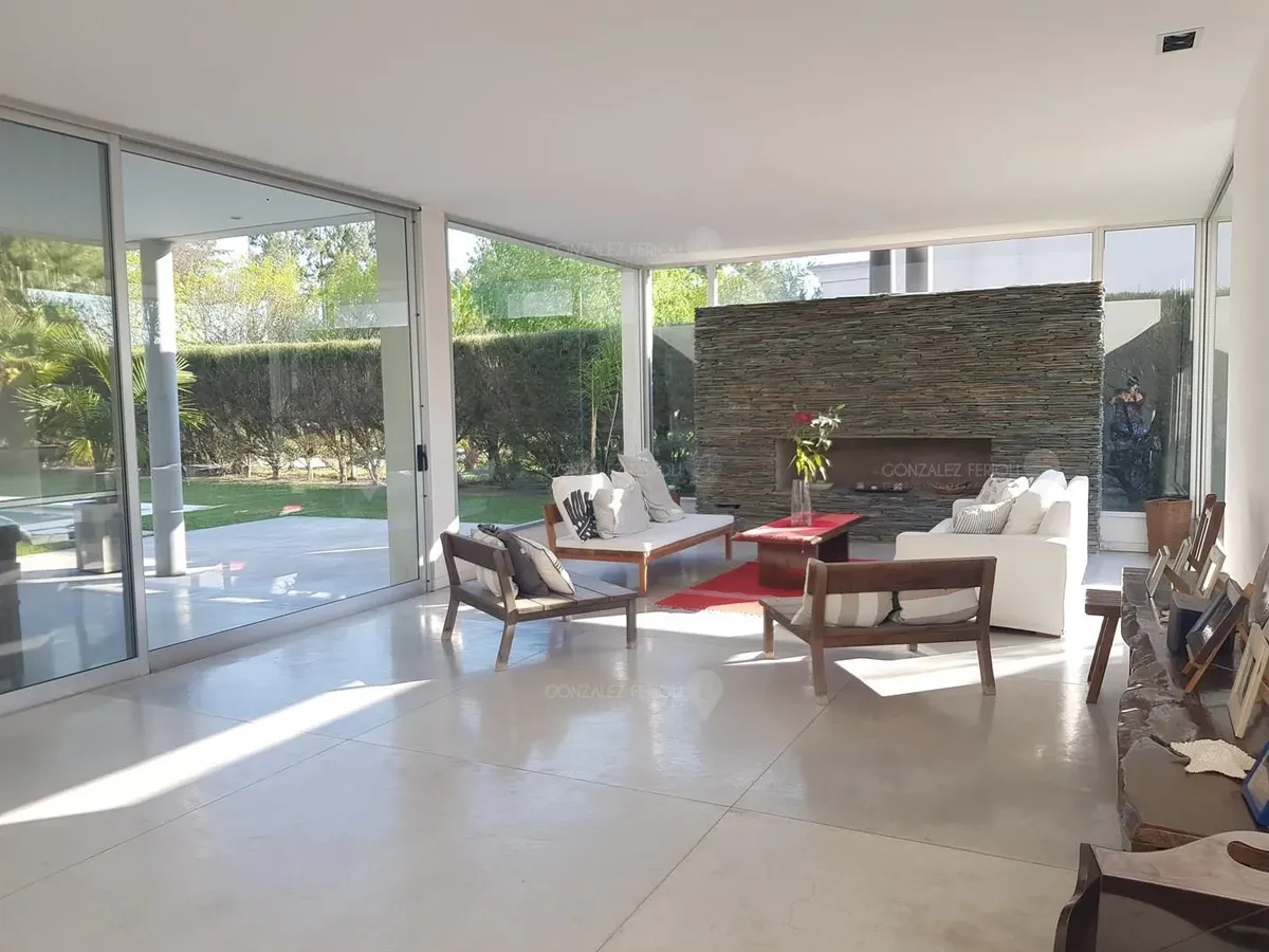 Современный дом рационалистического стиля на двух этажах в El Encuentro, General Pacheco. На первом этаже: гостиная-столовая с камином и большими окнами с видом на сад, гостевой туалет, просторная кухня с дневным обеденным местом, служебная комната с ванной, отдельная прачечная. Из гостиной выход на большую крытую галерею с зоной гриля, в доме есть паркованый сад с бассейном. На втором этаже расположены 3 спальни: главная с ванной комнатой и гардеробной, две дополнительные спальни, общая ванная