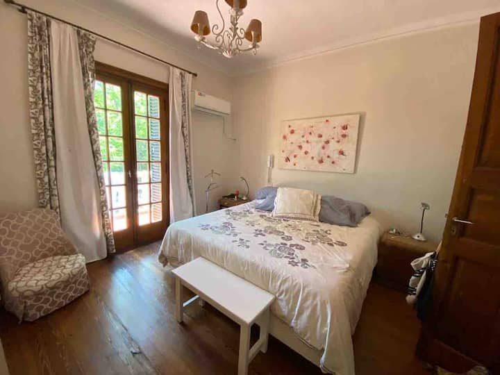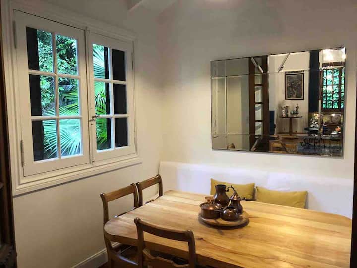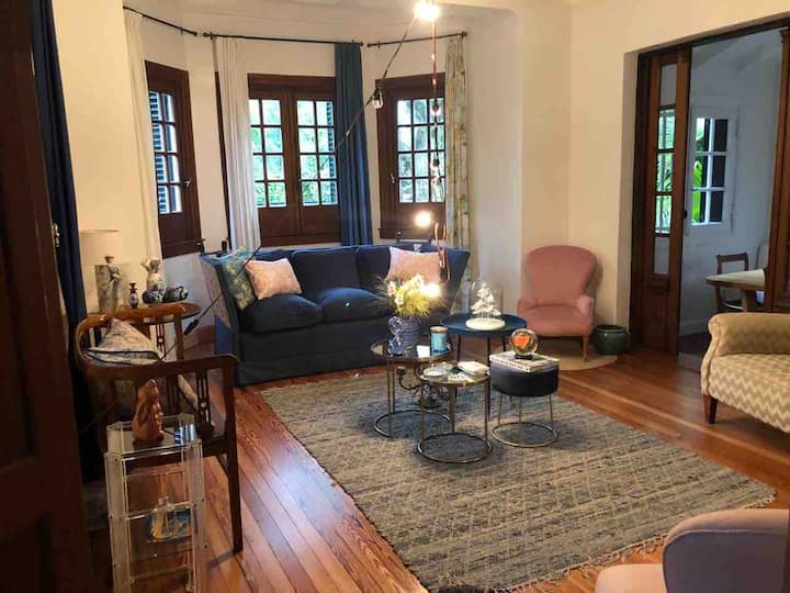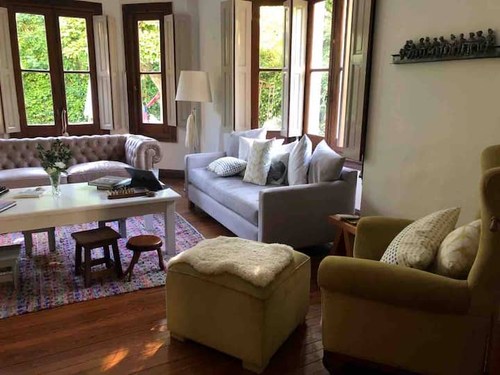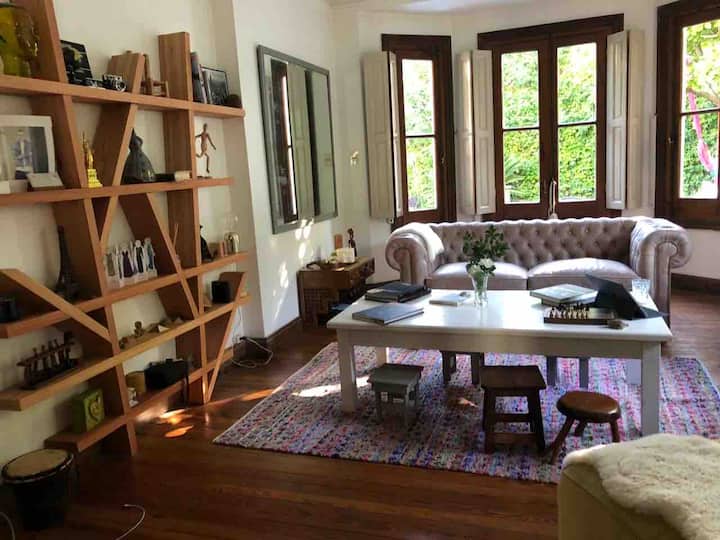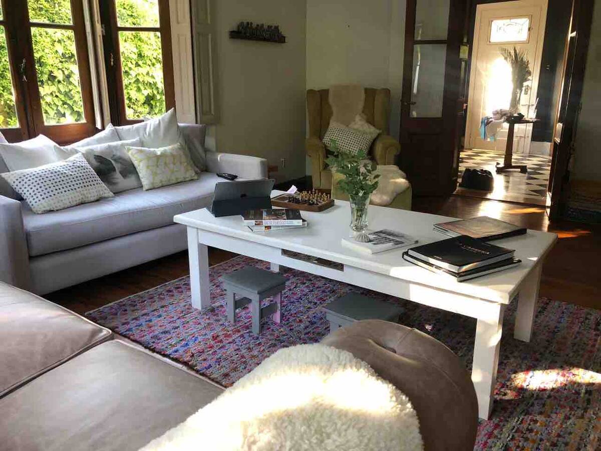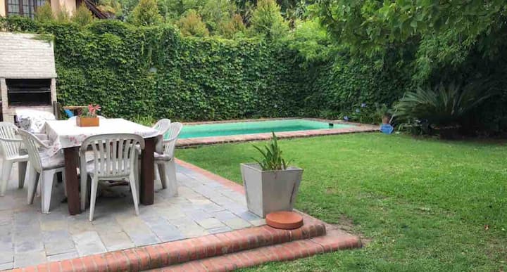 Дом в Barrio Parque Aguirre в Acassuso, рядом с Av. Libertador и станциями поездов Acasusso и San Isidro. В доме есть гостиная на первом этаже, игровая комната, столовая с кухней и гостевой туалет, а также 4 спальни: 3 спальни и 2 ванные комнаты на верхнем этаже и отдельная спальня на третьем уровне с двуспальной кроватью (queen). На участке есть сад и бассейн. В доме заявлены Wi‑Fi, телевизор и кондиционирование, а также отопление по всему дому; доступность указана на декабрь 2021 и январь 2022