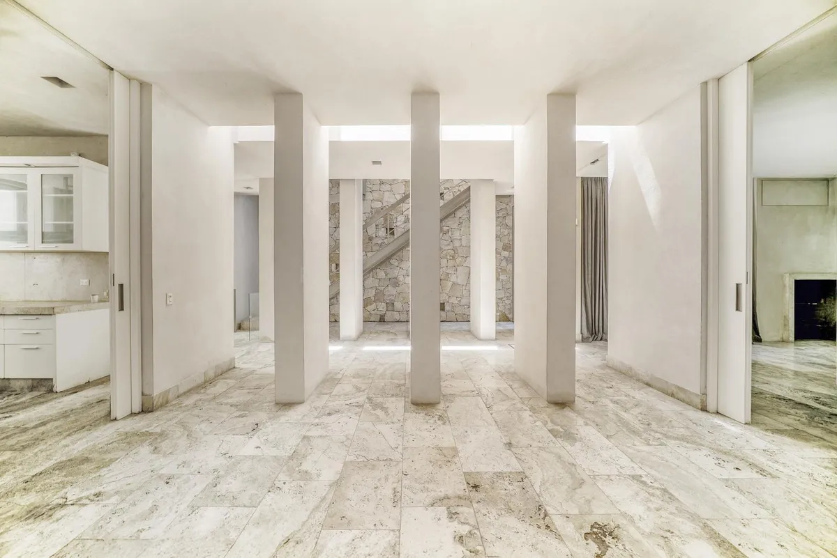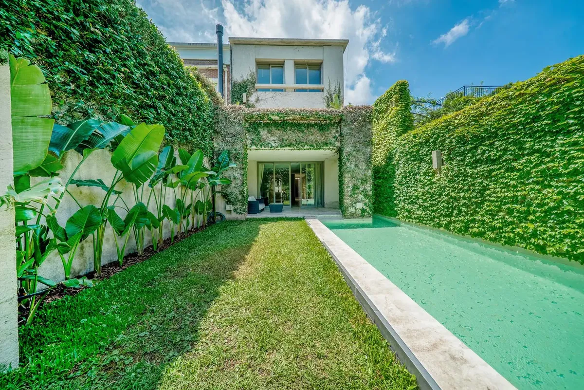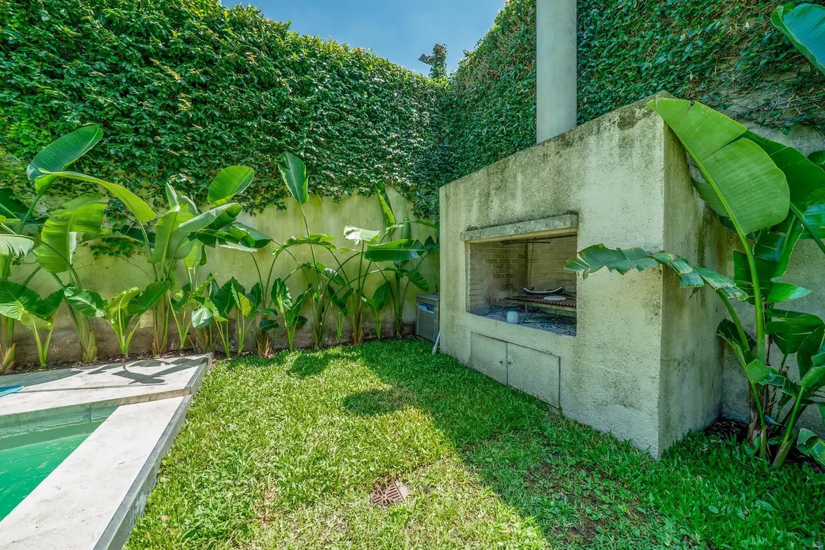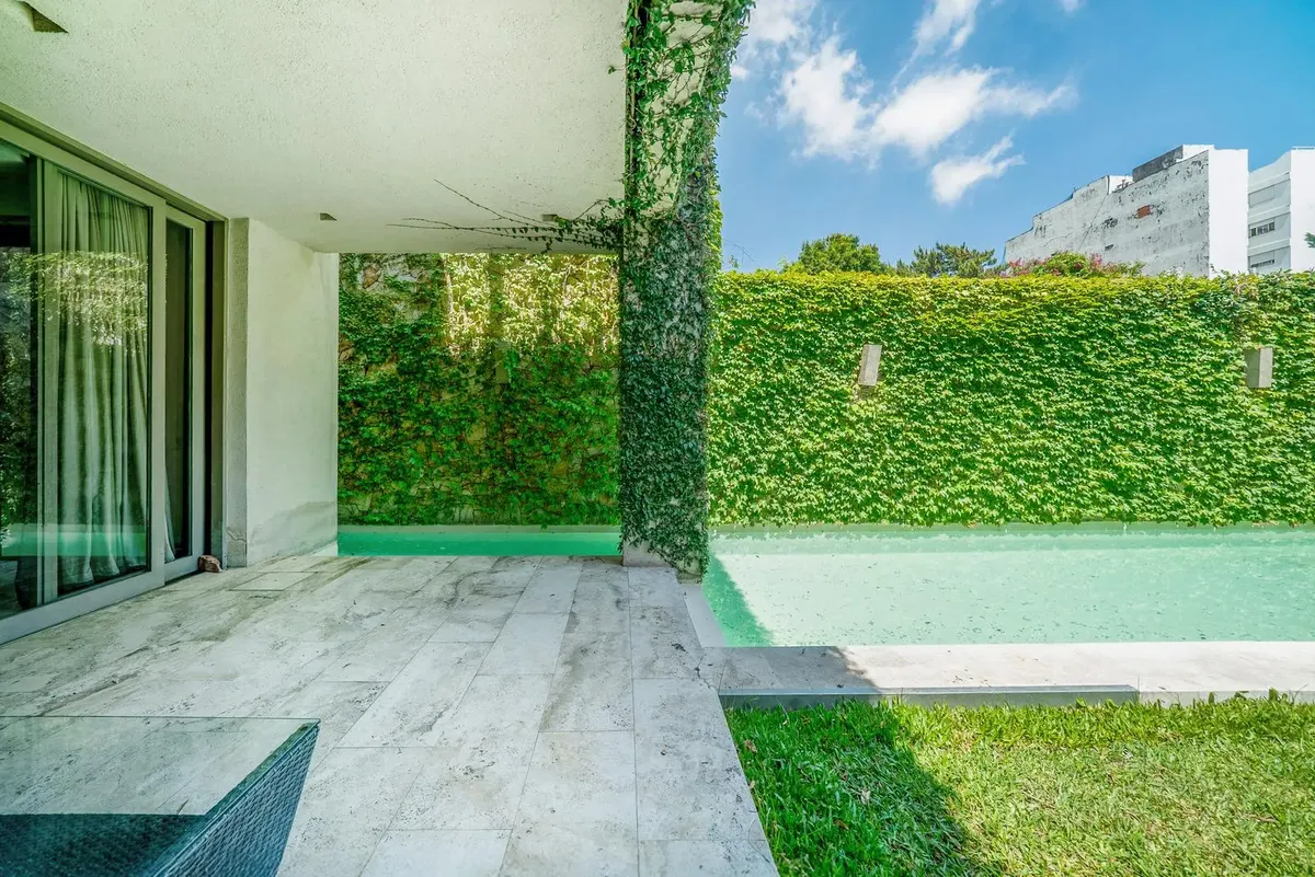 Квартира в формате casa (3 уровня) в Belgrano: 4 спальни, 5 ванных комнат и гостевой санузел, общая площадь 735 m² (507 m² крытых и 227 m² открытых). Ориентация на север. На первом этаже предусмотрено место для 2 автомобилей, входной холл и туалет, большая гостиная-столовая с камином и окнами в сторону сада и бассейна, отдельная столовая и кухня с островом; также есть прямой доступ к винному погребу в цокольном уровне, крытая галерея, озеленённый сад, отапливаемый бассейн и зона гриля. На втором