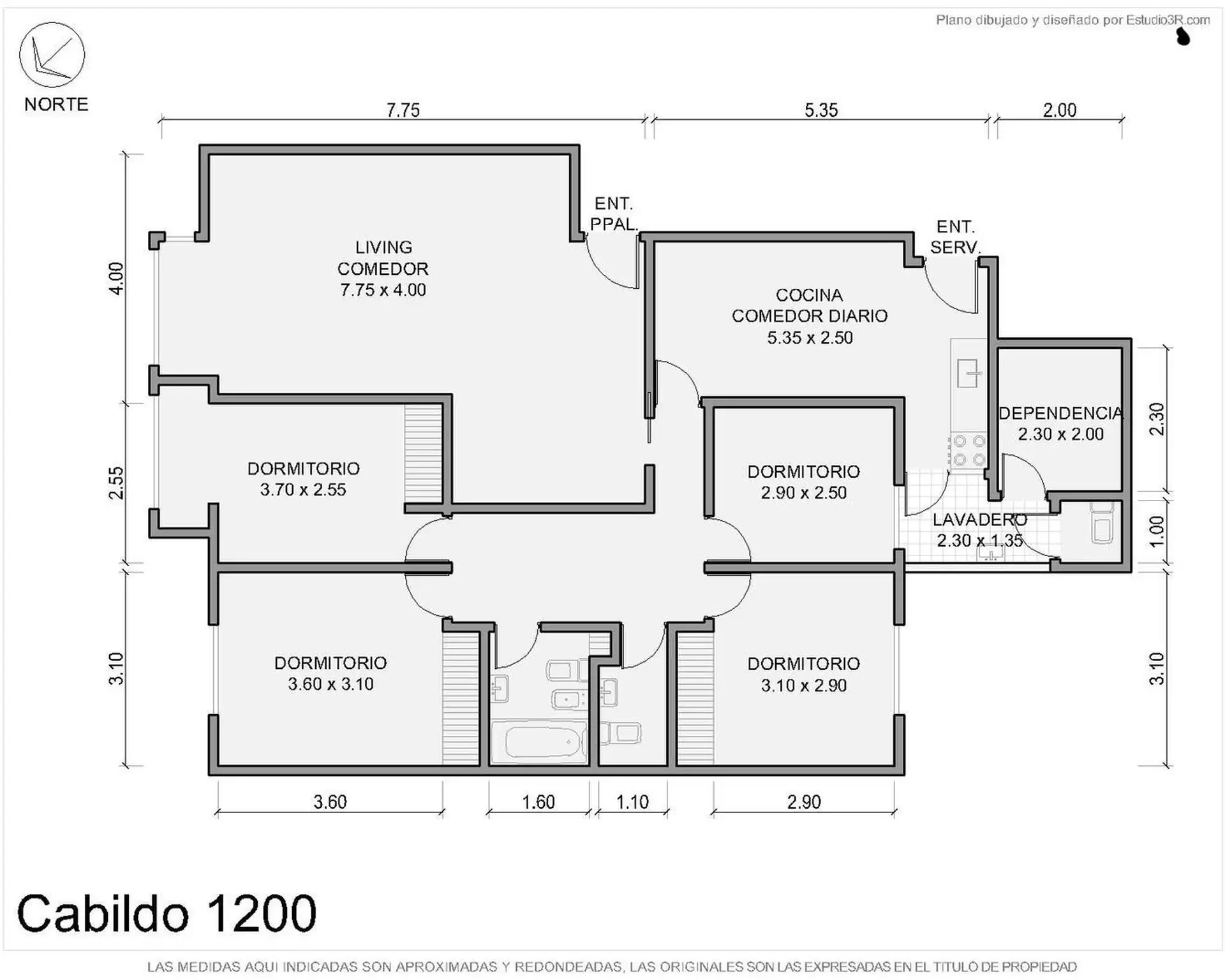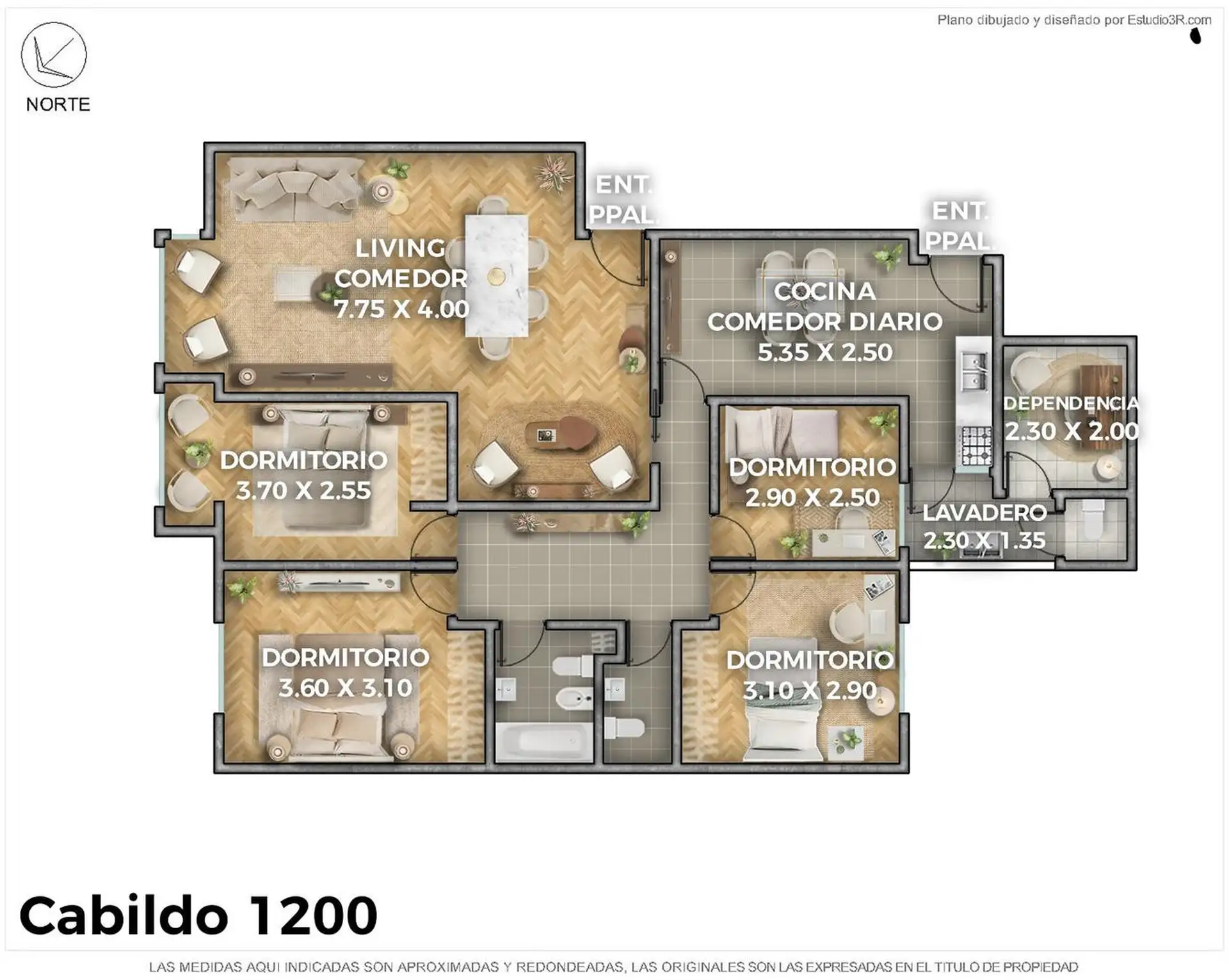 Квартира на 5 комнат на 3 этаже, окна во двор. В квартире большая гостиная-столовая с застеклённым балконом. Отдельная кухня с местом под ежедневный приём пищи, есть прачечная, комната и санузел для прислуги. Две спальни расположены окнами во двор, ещё две — во внутренний дворик/световой проём; три спальни имеют встроенные шкафы. Есть полностью оборудованная ванная и туалет с душем. Установлено центральное отопление, горячая вода — от индивидуального бойлера (calefón). В здании предусмотрены пол