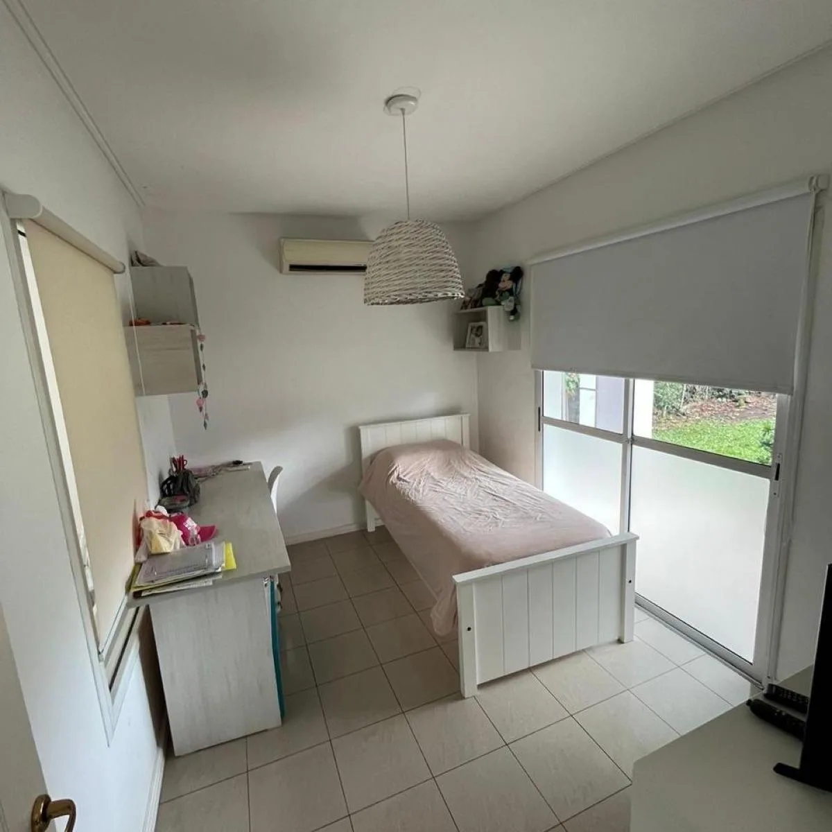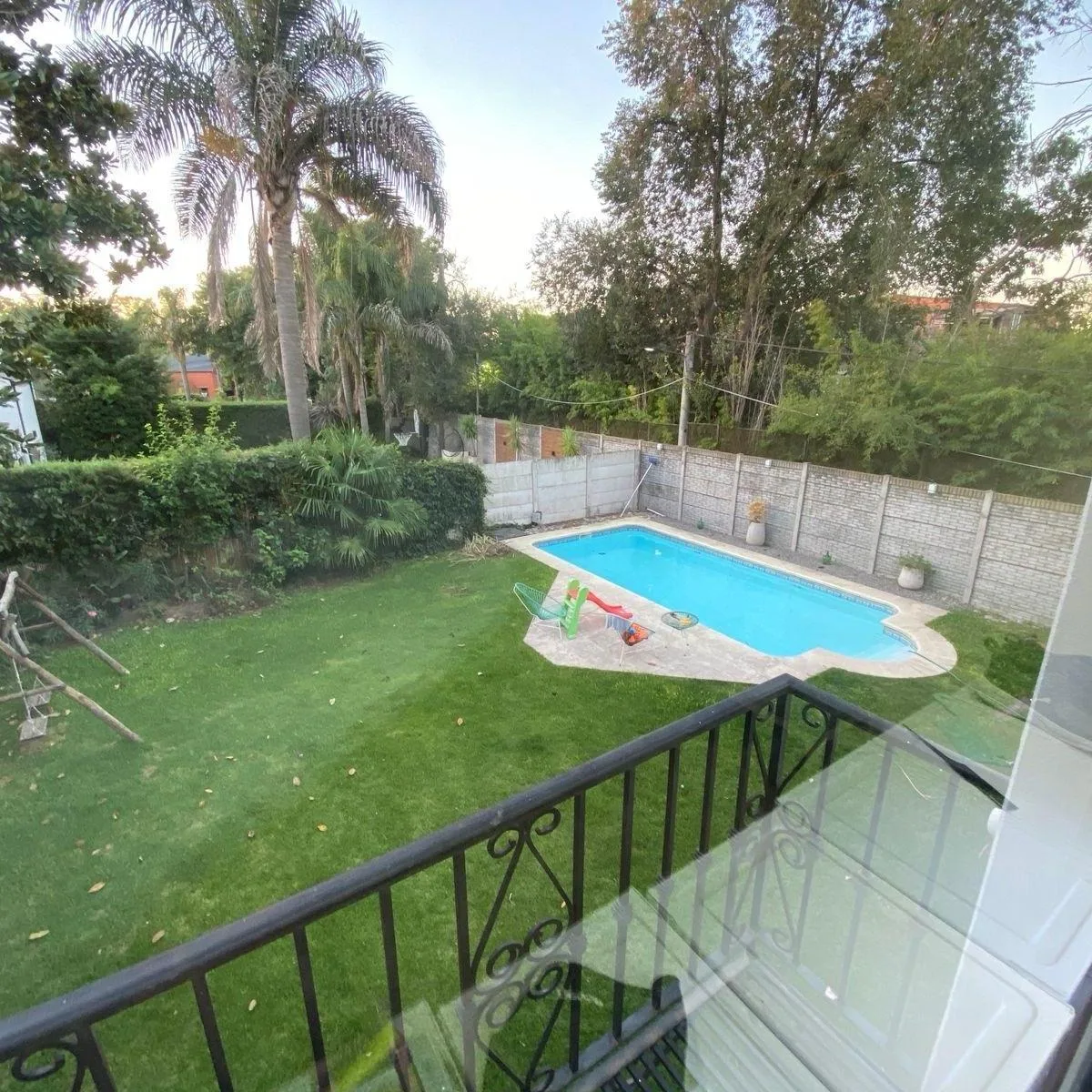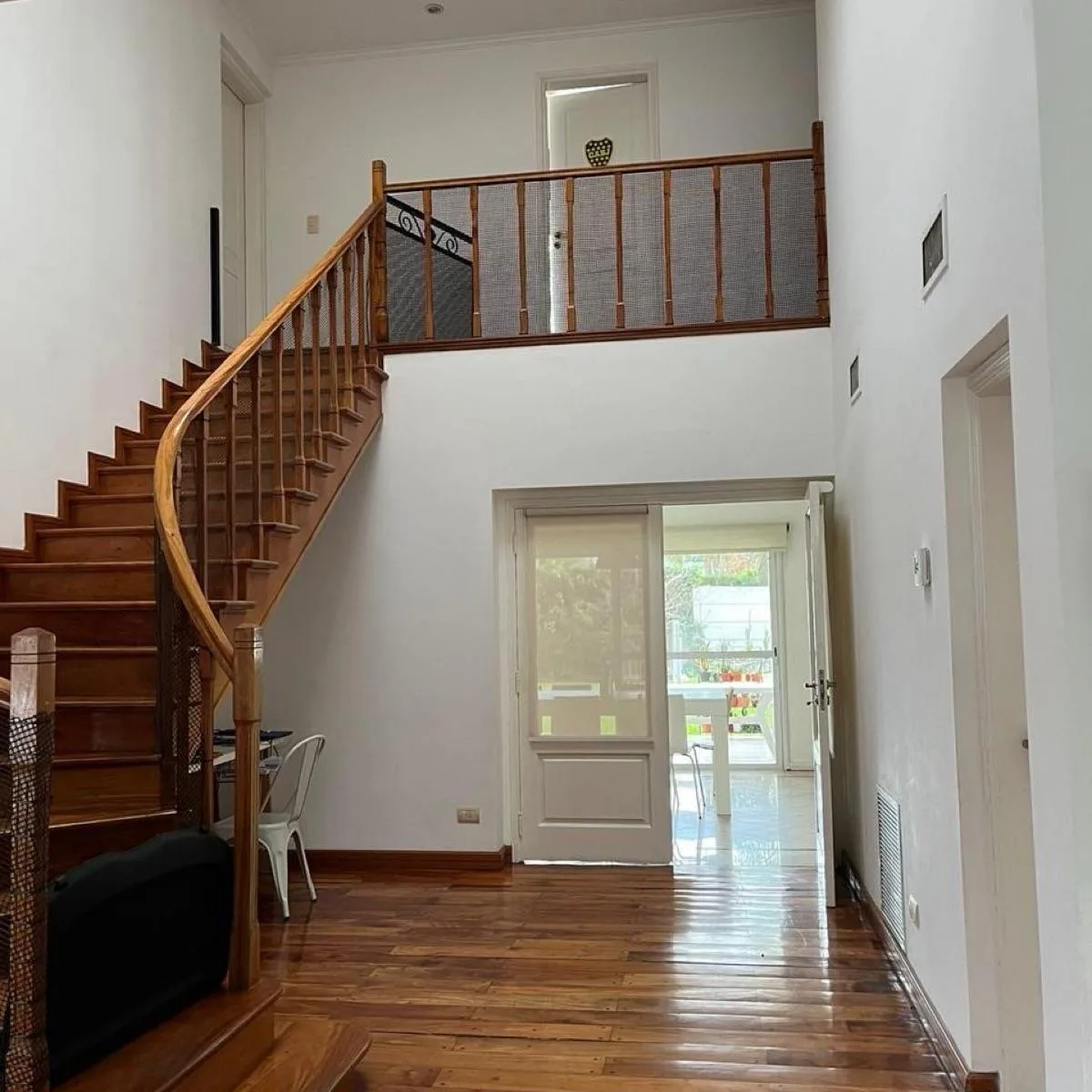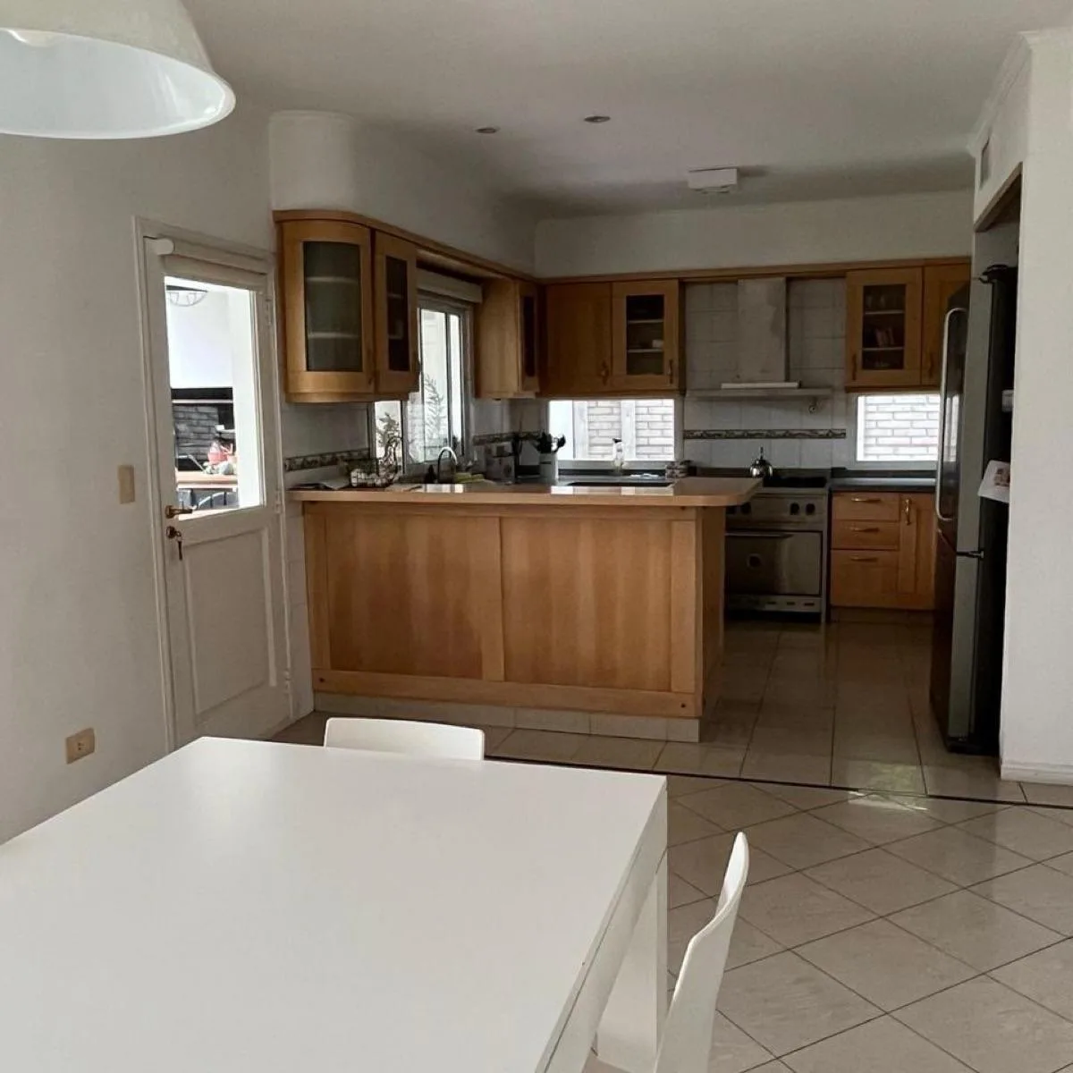 Дом в Barrio Cerrado El Jagüel, Parque Leloir. 4 спальни: 1 на первом этаже и 3 на втором. В доме гостиная-столовая с камином на дровах, центральное отопление и кондиционеры в основных помещениях. На первом этаже есть туалет для гостей и универсальное помещение, которое может использоваться как гараж или playroom, с выходом в обеденную зону и на кухню; кухня оборудована барной стойкой для завтраков, также предусмотрена отдельная прачечная. На участке есть крытая галерея с зоной гриля, сад и басс