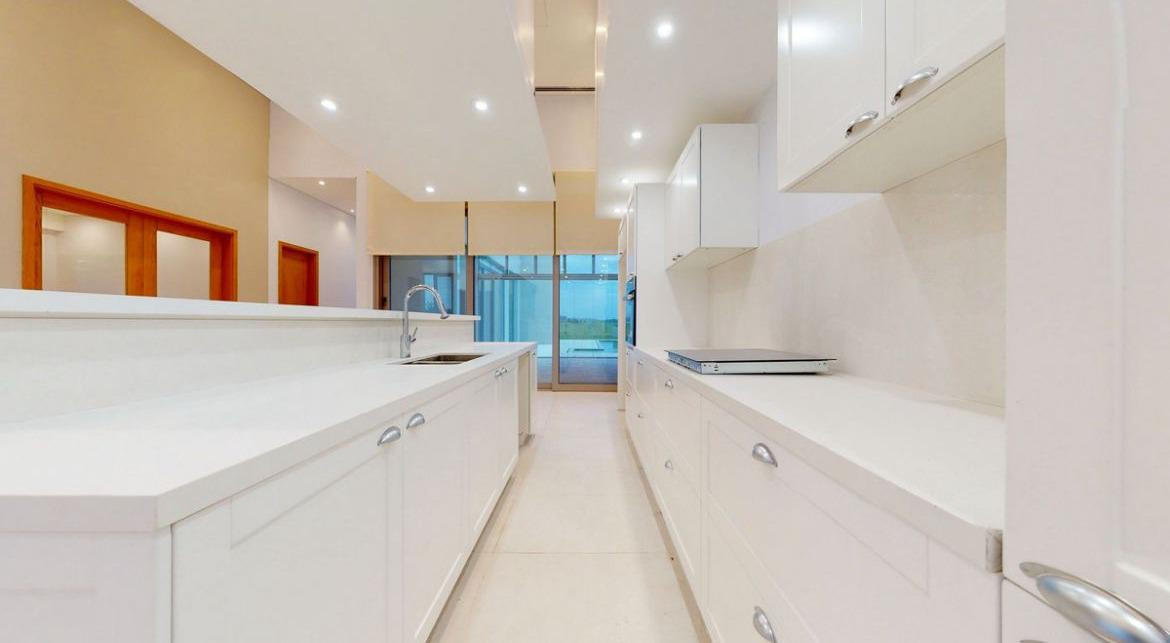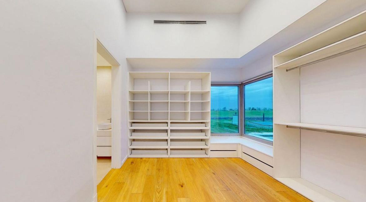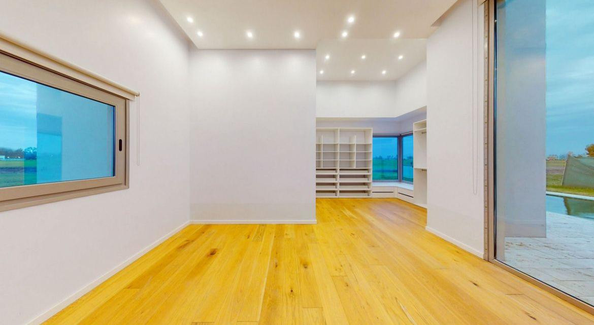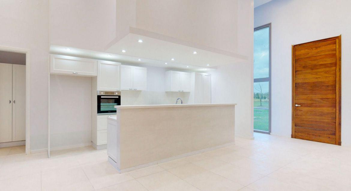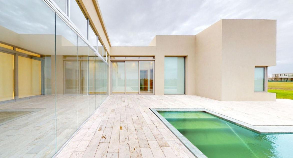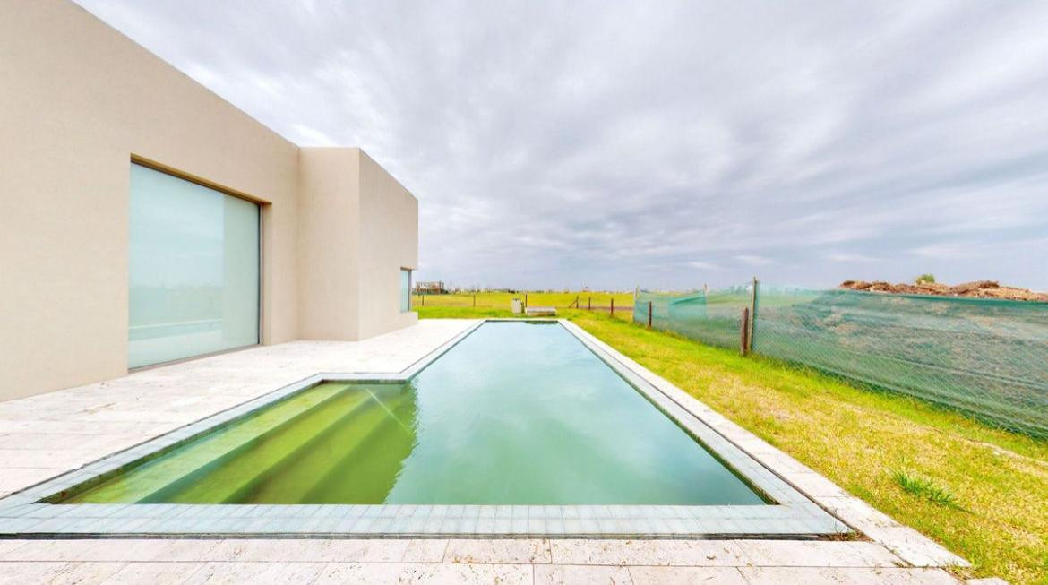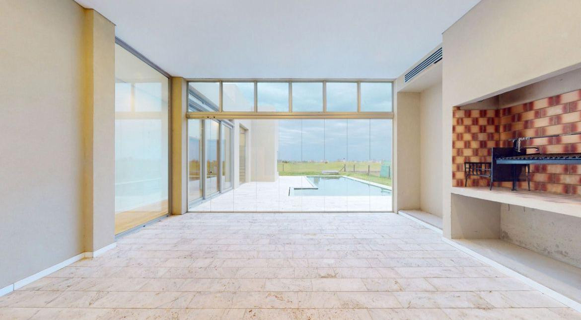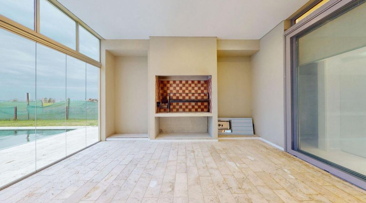 Дом на 4 спальни в Araucarias, Haras del Sur III, La Plata. Одноэтажная планировка с внутренней компоновкой, ориентация на север. Кухня открытой планировки объединена с гостиной-столовой, есть туалет, прачечная, помещение под кабинет или офис, 4 спальни (одна сьют с гардеробной и собственной ванной с джакузи), 2 полных ванные и комната для персонала с собственной ванной. Снаружи — полузакрытая галерея с зоной гриля и большой сад с подогреваемым бассейном. Центральное отопление и тёплый пол (losa