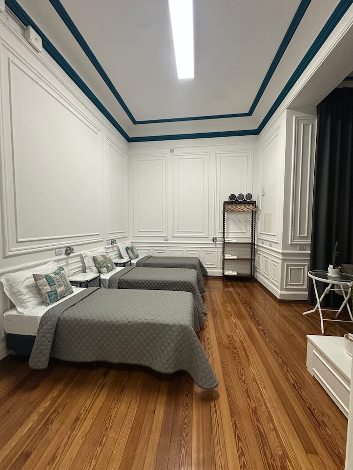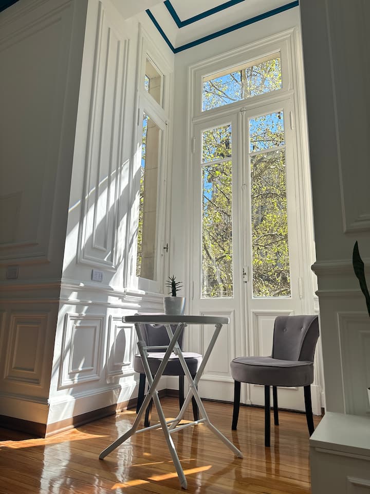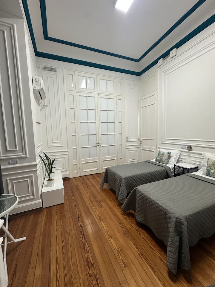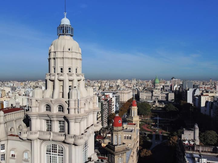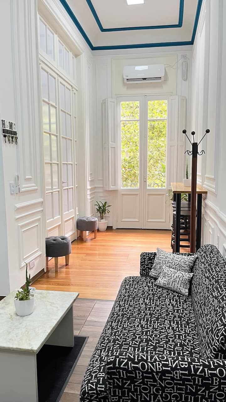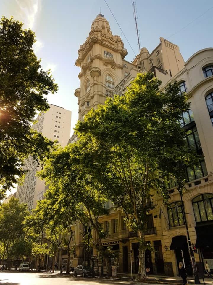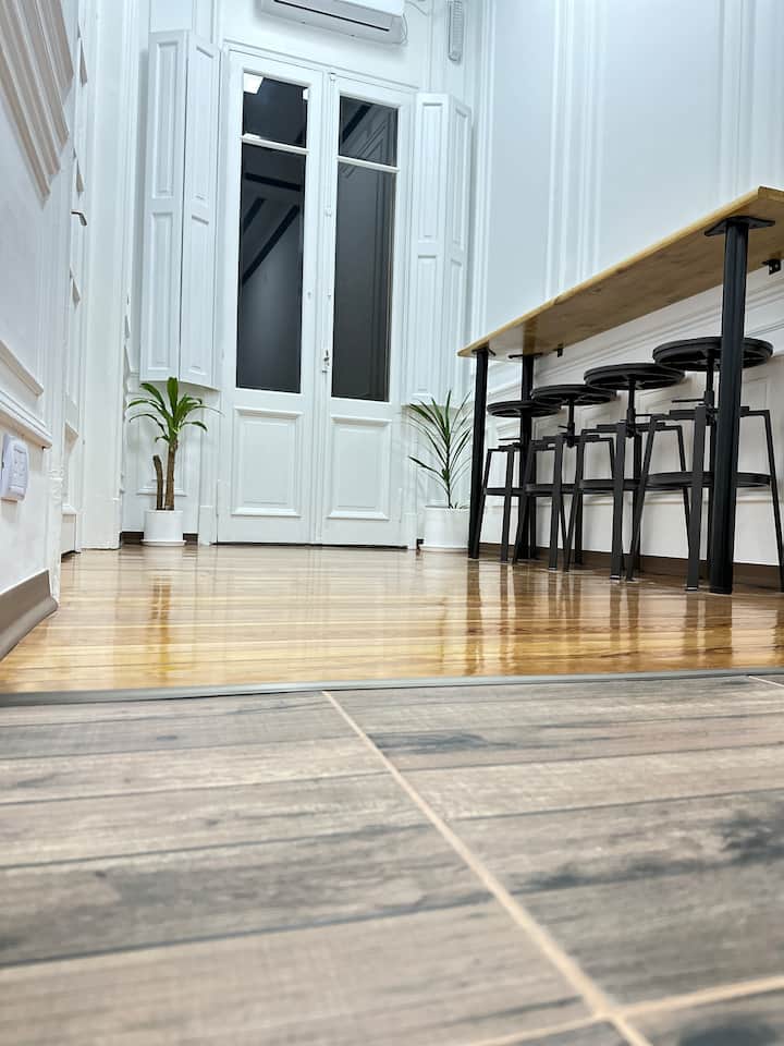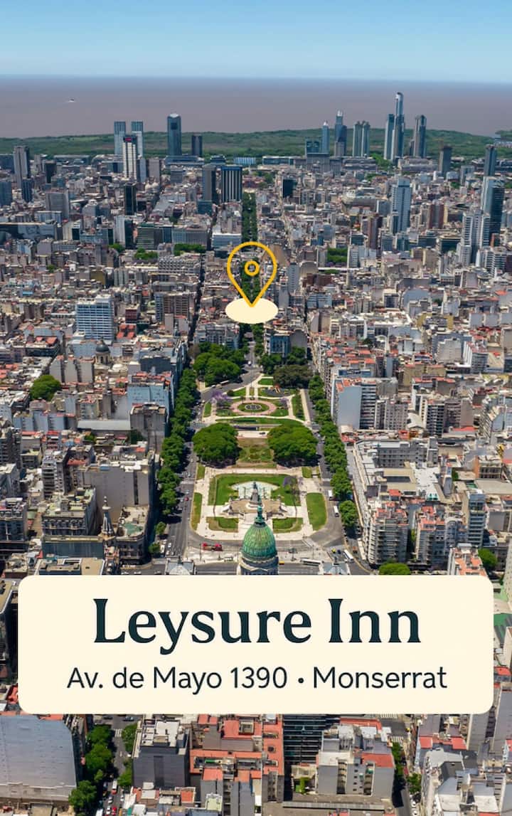 Квартира в Monserrat на Av. de Mayo площадью 122 m², 4 спальни, 4 ванные комнаты. Высота потолков 4 m. В квартире есть гостиная-столовая и зона отдыха, кухня с электроплитой и техникой: микроволновая печь, холодильник, вытяжка, кофеварка, тостер, электрический чайник, стирально-сушильная машина. Во всех комнатах установлены кондиционеры с режимом охлаждения и обогрева. Вместимость указана до 13 гостей.