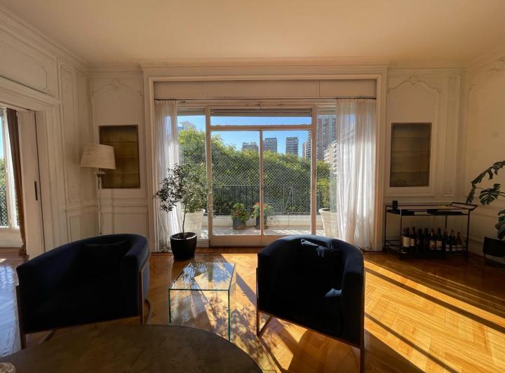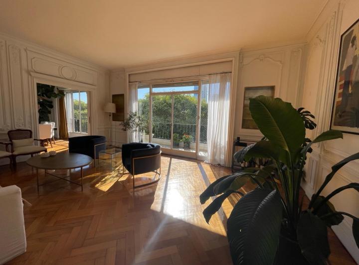Квартира в Palermo: 5 комнат плюс служебное помещение, 5-й этаж. Сдаётся без мебели. Окна на улицу и во двор; большая гостиная в форме L с выходом на балкон, открытый вид на Av. Del Libertador и Plaza Alemania. 4 спальни, 3 из них выходят во двор квартала; 2 ванные комнаты с ванной. Просторная кухня с промышленной духовкой, отдельная прачечная и служебное помещение с ванной. Есть (закреплённое) парковочное место. В описании указаны отдельный приватный холл на этаже и отдельный лифт/входной палли