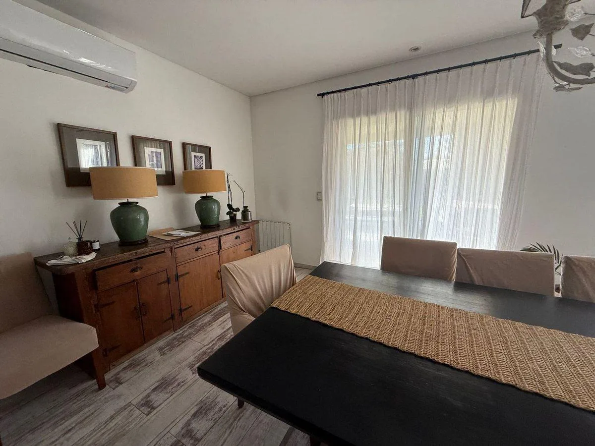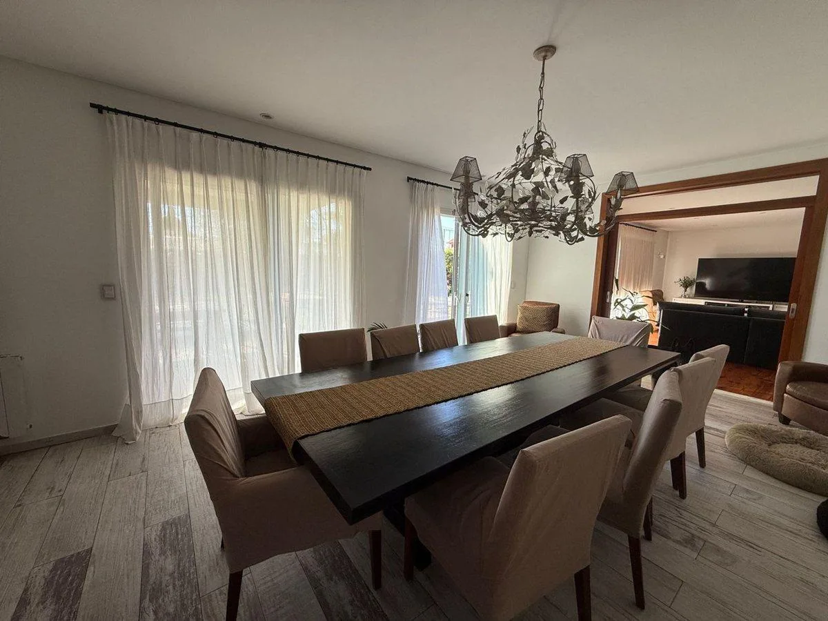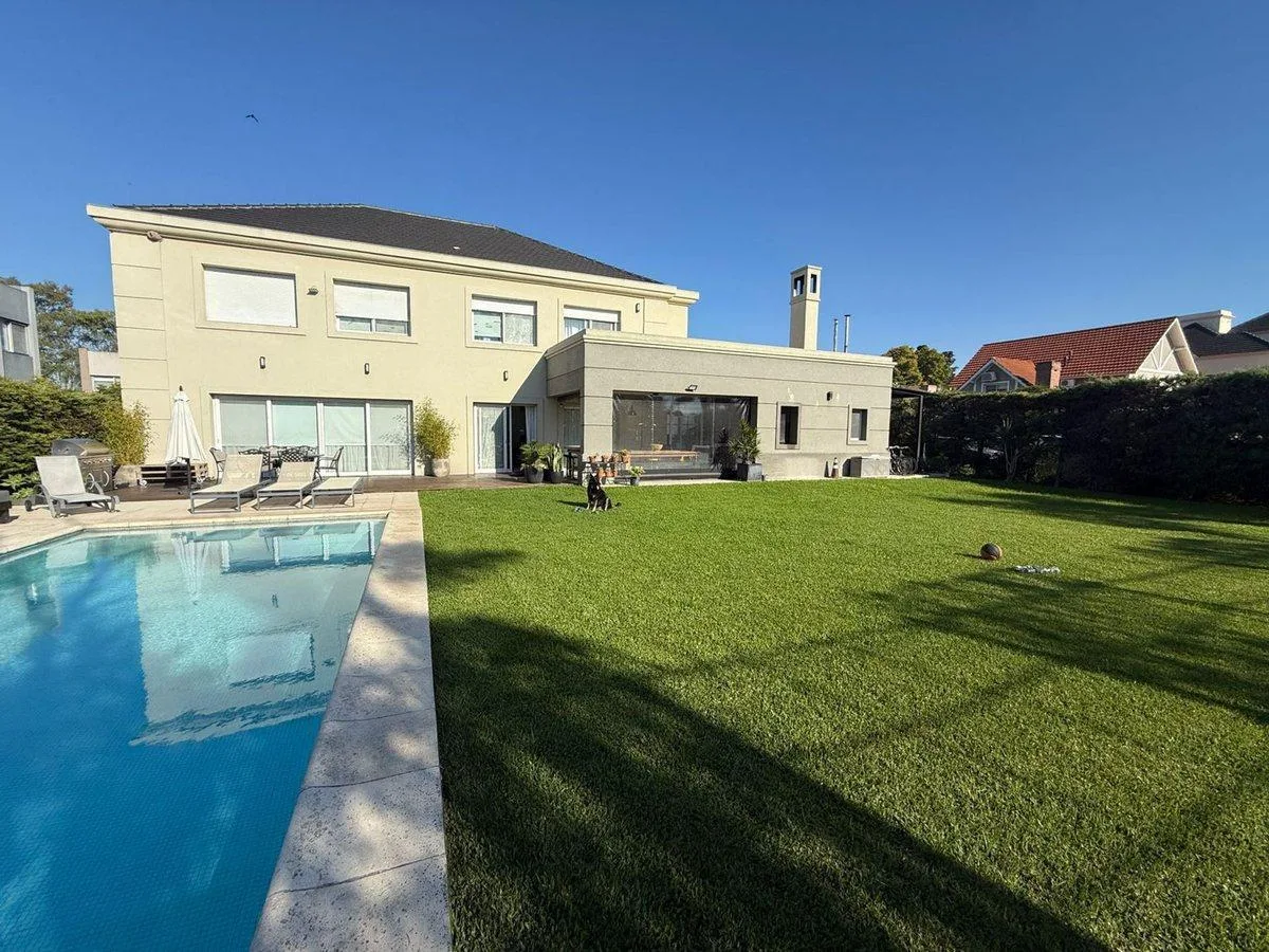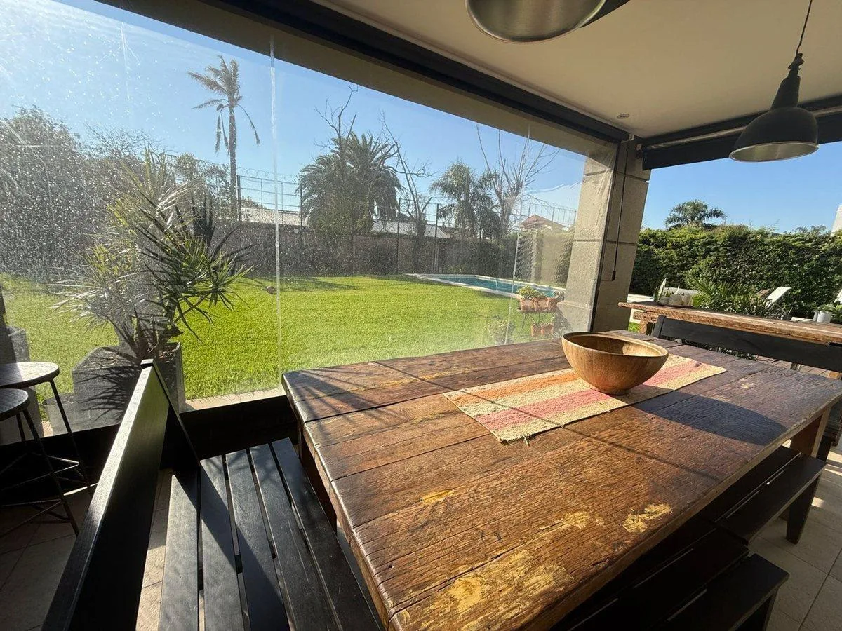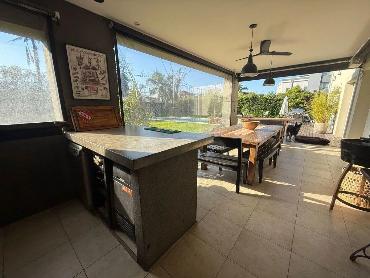 Дом в Barrancas de Guido в Quilmes на двух этажах, современного стиля. 4 спальни (в описании указано 5 ambientes), с окнами DVH и полами из дерева и керамогранита. На первом этаже: главный гостиный зал с видом на сад и бассейн, отдельный кабинет или формальная столовая, интегрированная кухня с большой обеденной зоной, закрытая и отапливаемая галерея с зоной гриля для круглогодичного использования, отдельная прачечная и служебная зона. Гараж на 3 автомобиля с кондиционированием, с возможностью ис