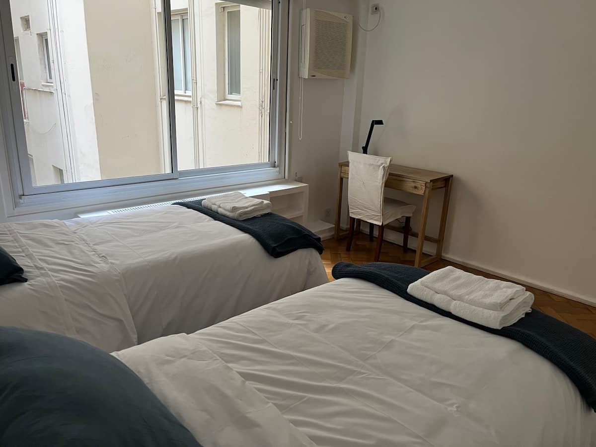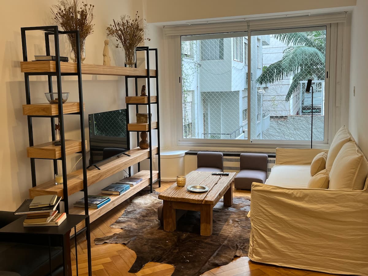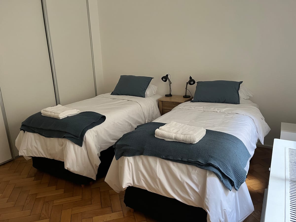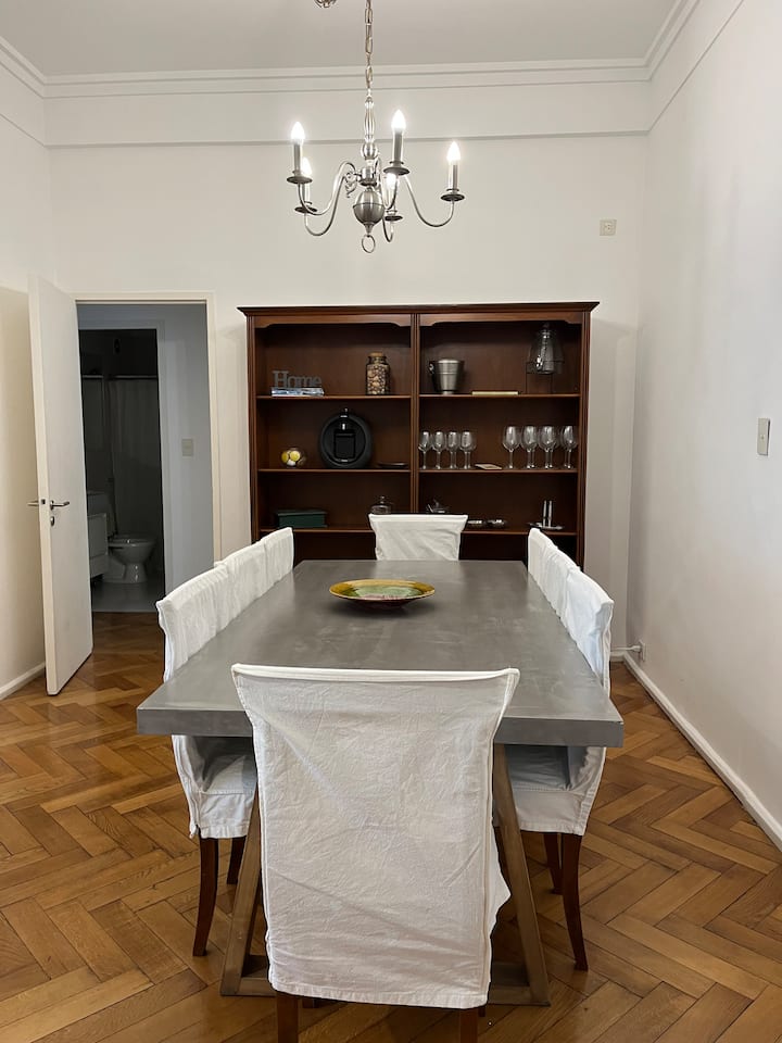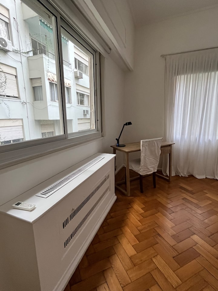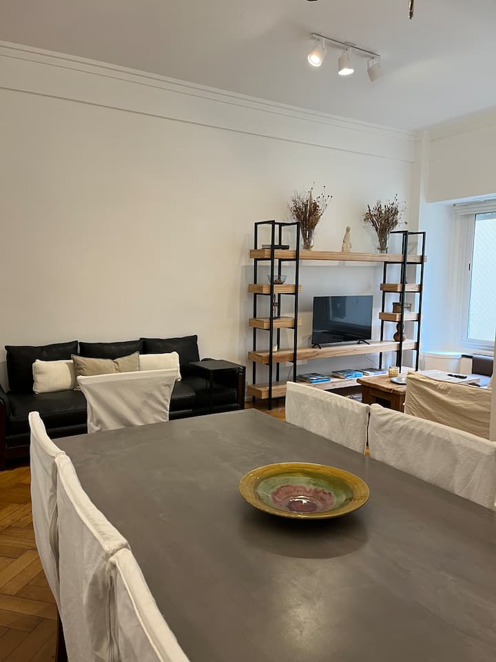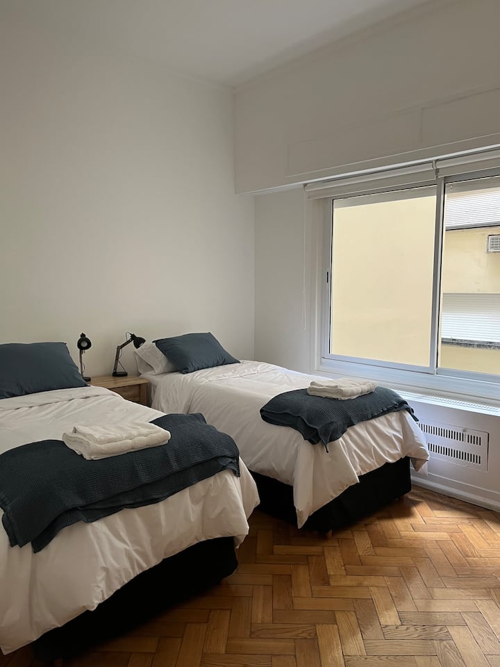 Квартира с 4 спальнями в Retiro в историческом здании в стиле Art Deco (1934), после новой отделки и с мебелью. Рассчитана на размещение до 6 человек. В квартире установлены 3 сплит-кондиционера холод-тепло и центральное отопление; есть посудомоечная машина, стиральная и сушильная машины, телевизор и Wi‑Fi. Планировка включает спальню хозяев с двуспальной кроватью, ещё 3 спальни с односпальными кроватями. Ванная комната хозяев с ванной, гостевой туалет, общая ванная для спален 2 и 3 с ванной и о