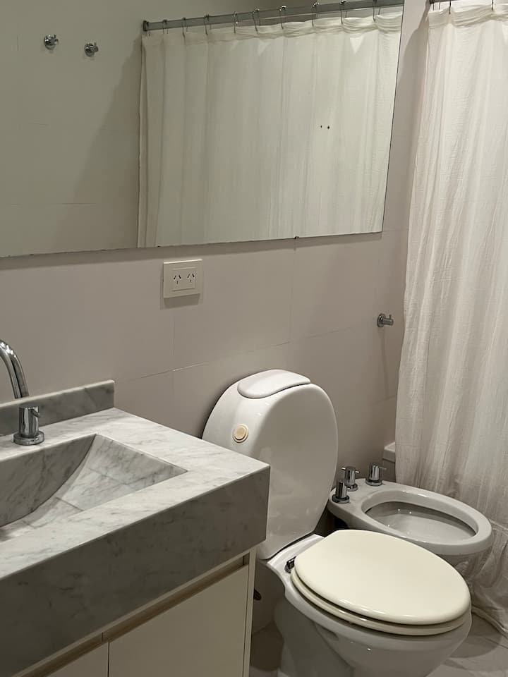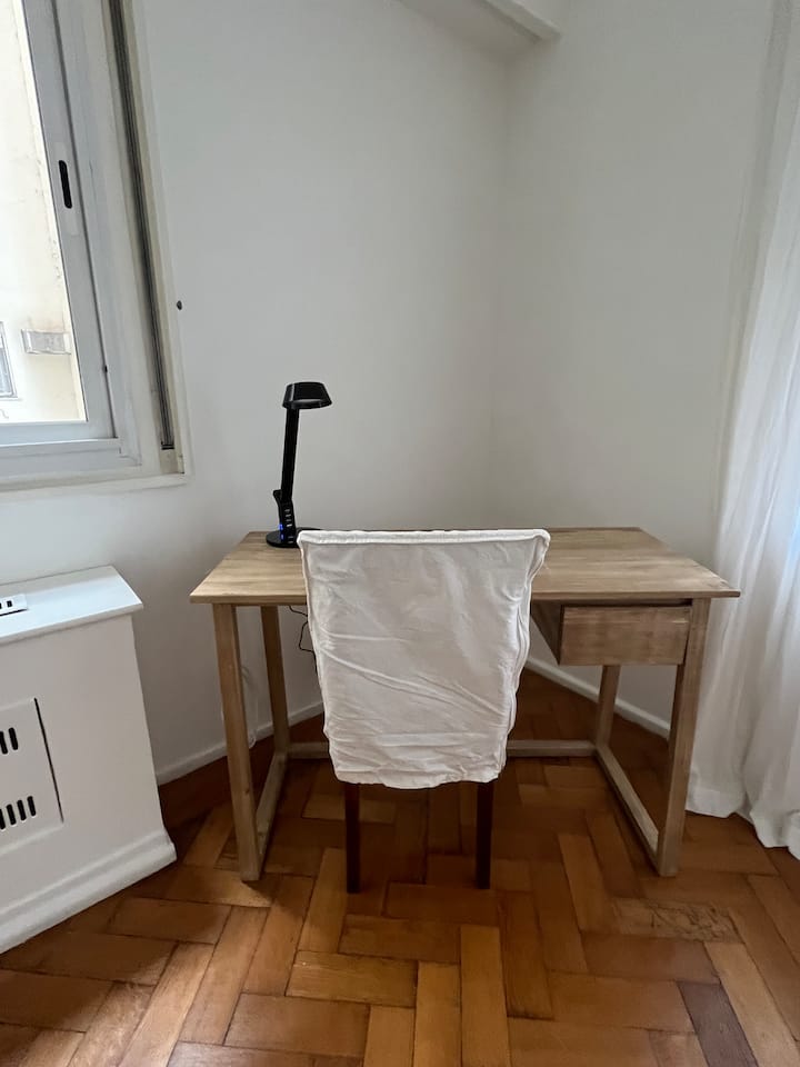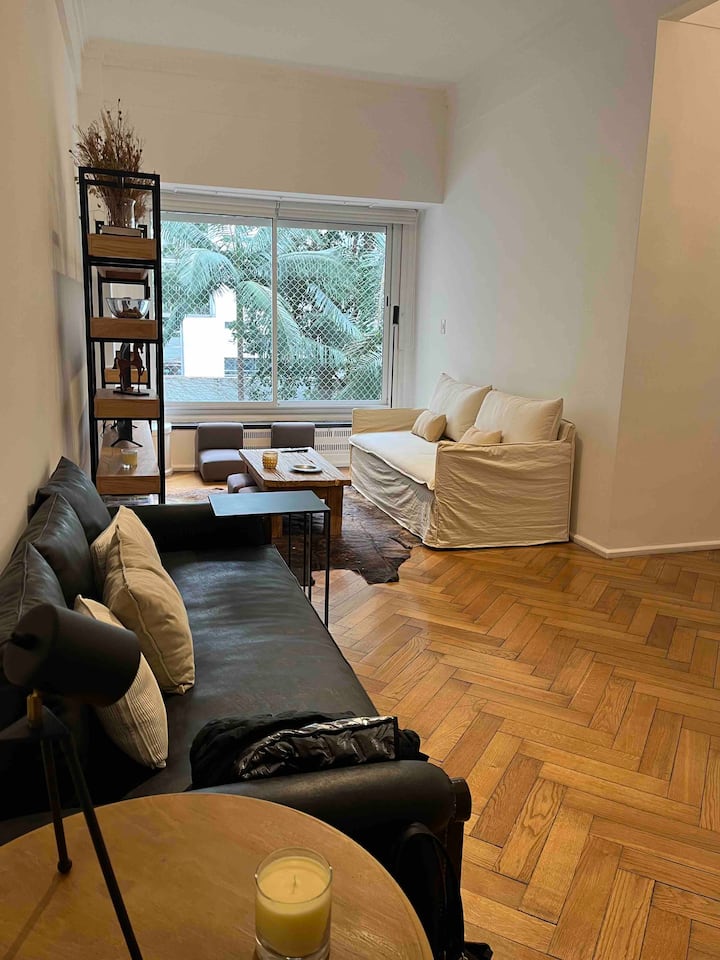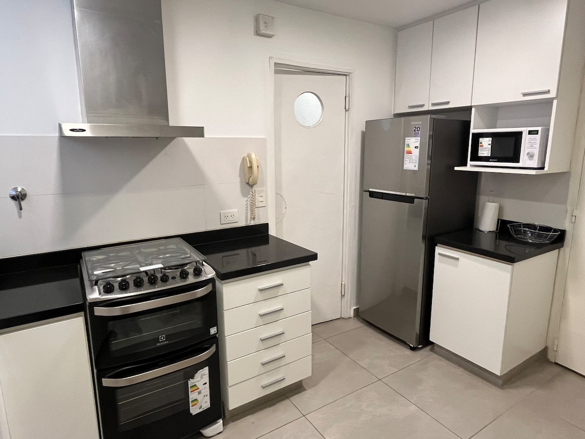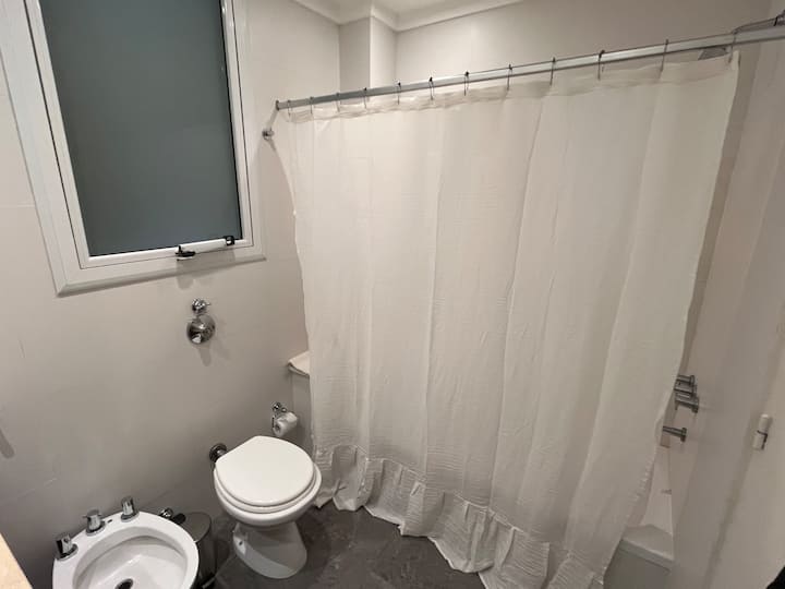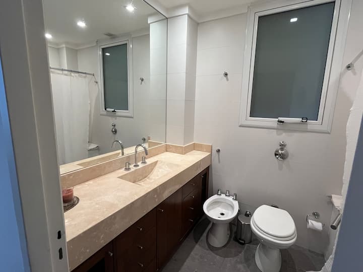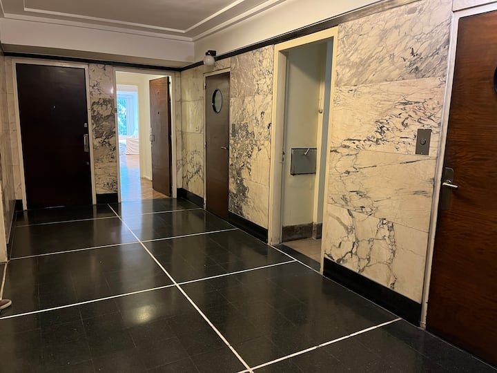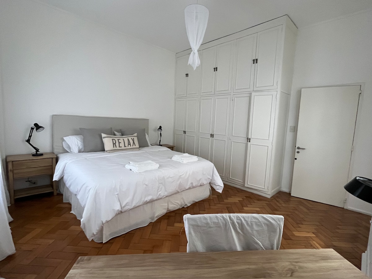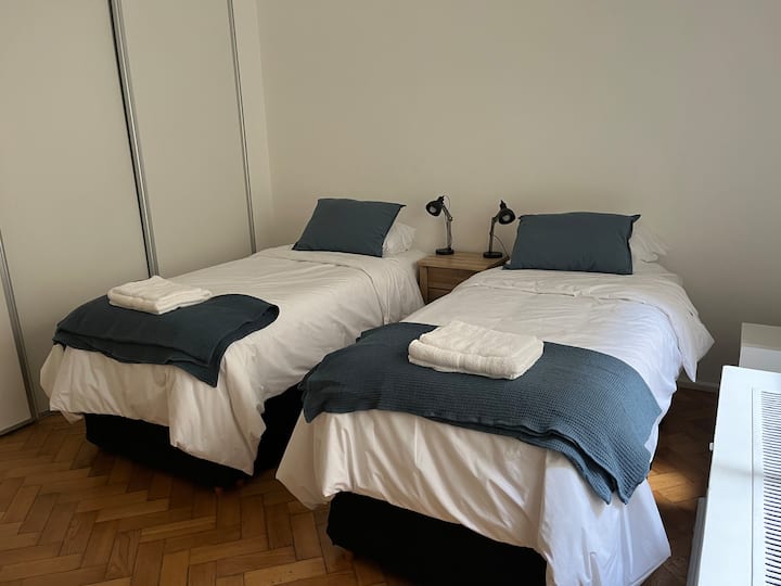Квартира с 4 спальнями в Retiro в историческом здании в стиле Art Deco (1934), после новой отделки и с мебелью. Рассчитана на размещение до 6 человек. В квартире установлены 3 сплит-кондиционера холод-тепло и центральное отопление; есть посудомоечная машина, стиральная и сушильная машины, телевизор и Wi‑Fi. Планировка включает спальню хозяев с двуспальной кроватью, ещё 3 спальни с односпальными кроватями. Ванная комната хозяев с ванной, гостевой туалет, общая ванная для спален 2 и 3 с ванной и о