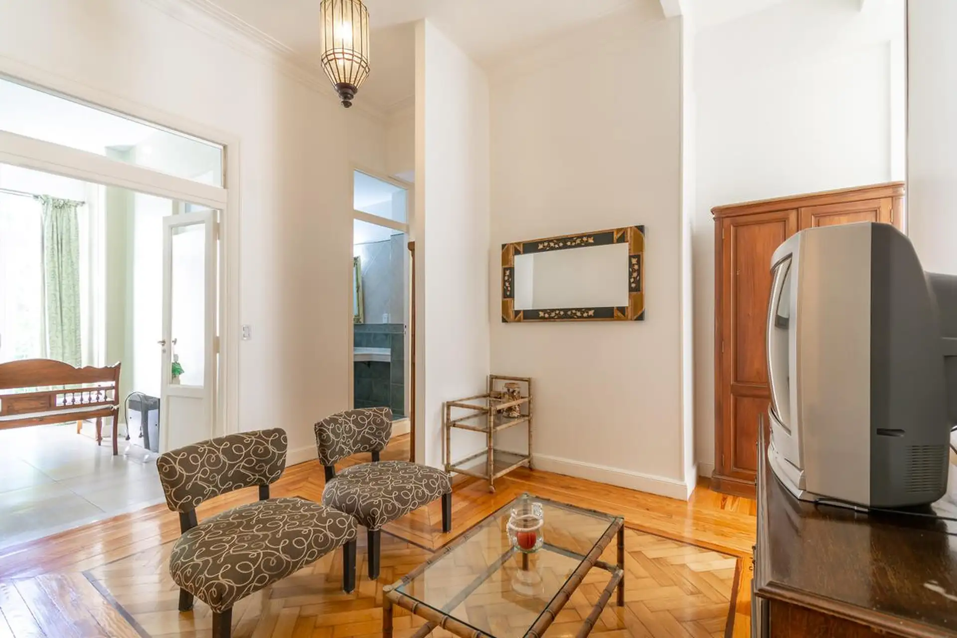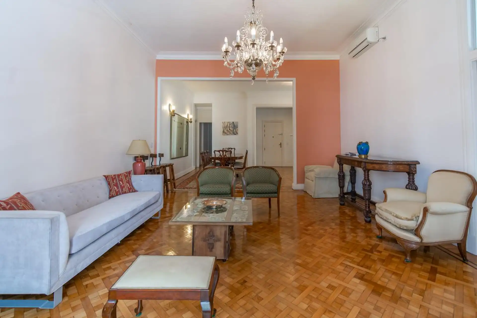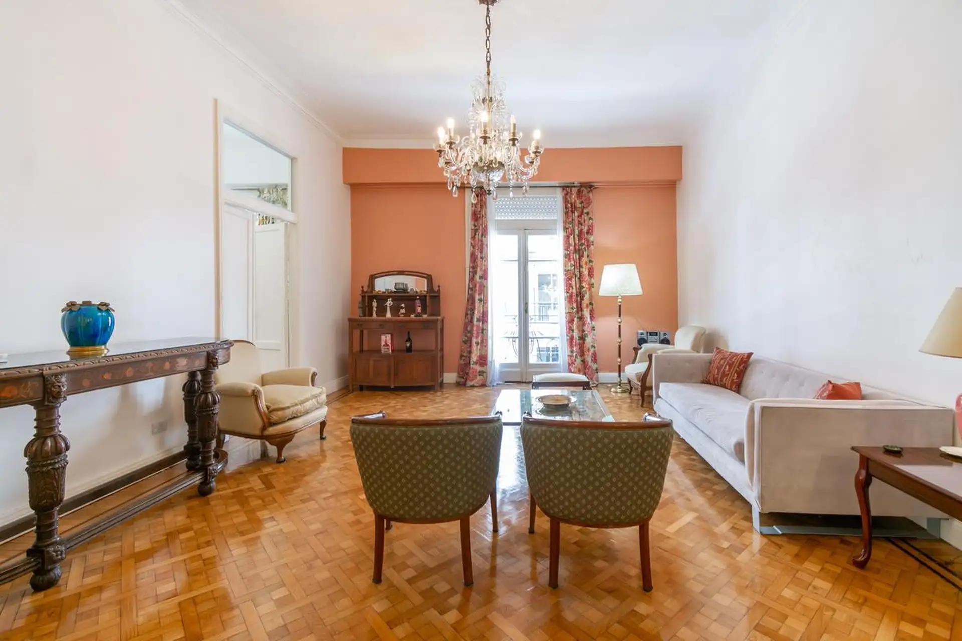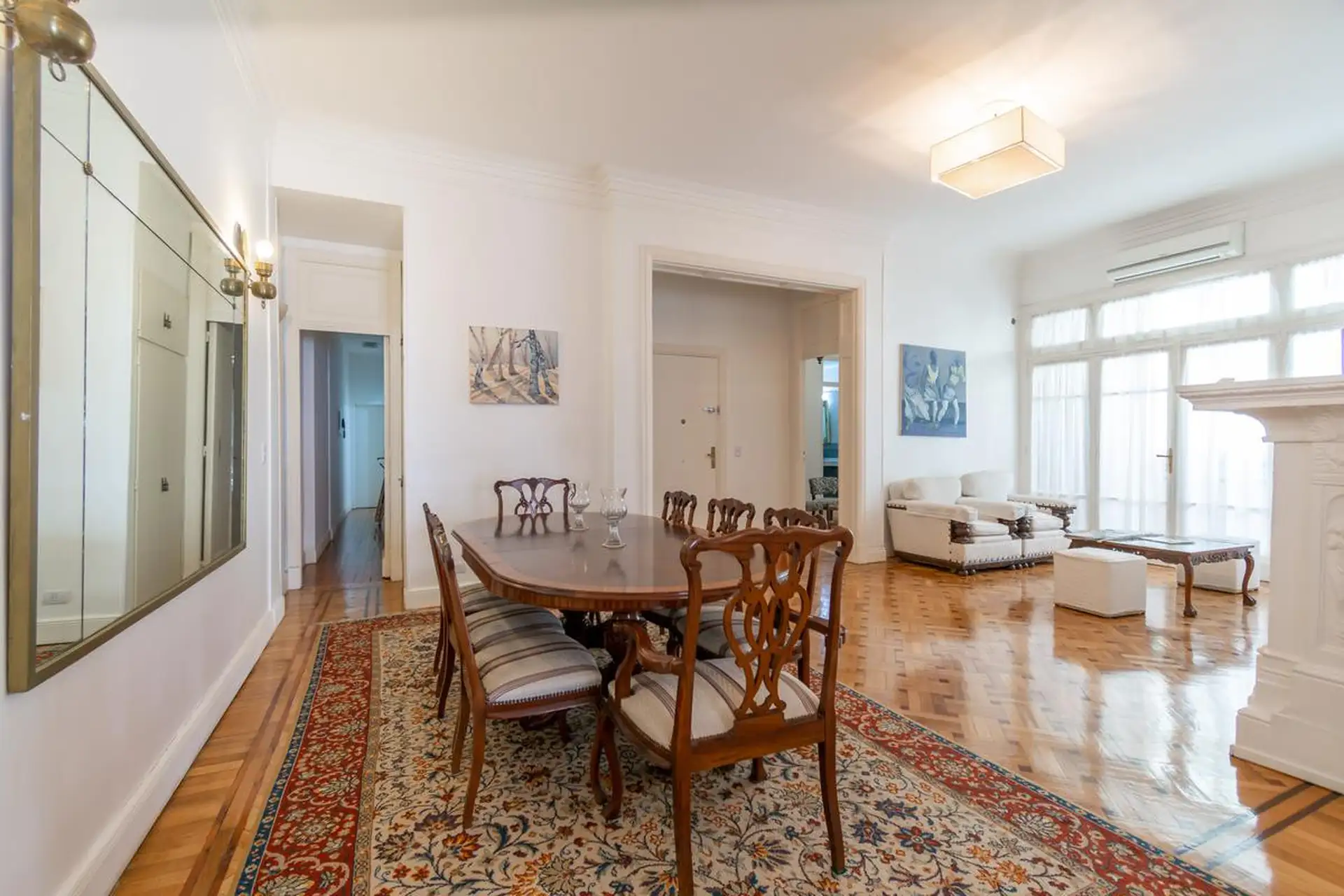 Квартира в Retiro, 5 комнат, площадью 250 m². Окна выходят на улицу, в доме есть несколько гостиных зон; во входной группе окна в стиле и потолки высотой в два уровня. Основная спальня с ванной комнатой (suite) и окнами во двор квартала. Спальни 2 и 3 оснащены кроватями и отдельными полноценными ванными комнатами; в четвёртой спальне кровать двуспальная. Кухня после ремонта с холодильником, стиральной машиной и посудомоечной машиной, есть обеденная зона у кухни. На последнем этаже терраса с зоно