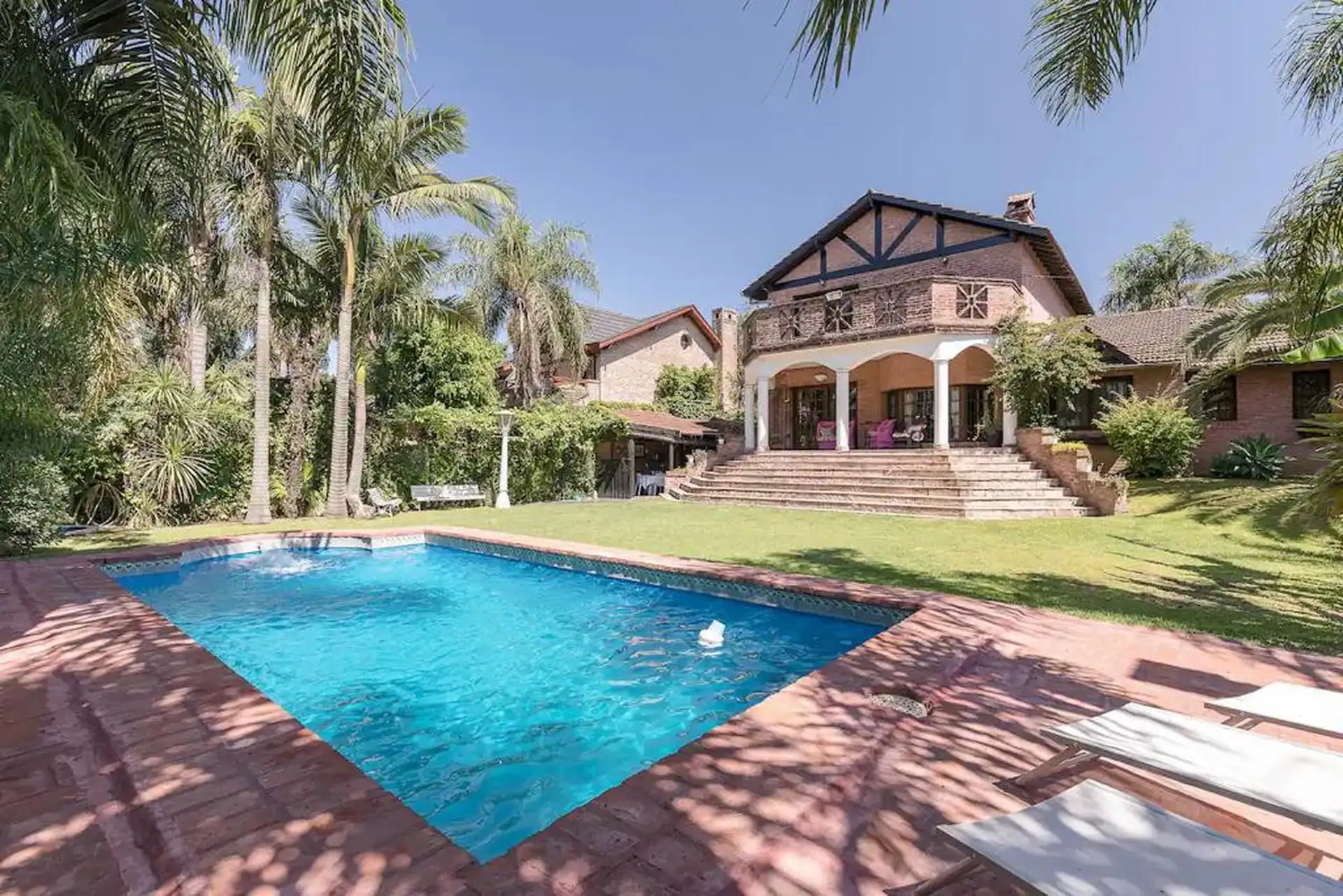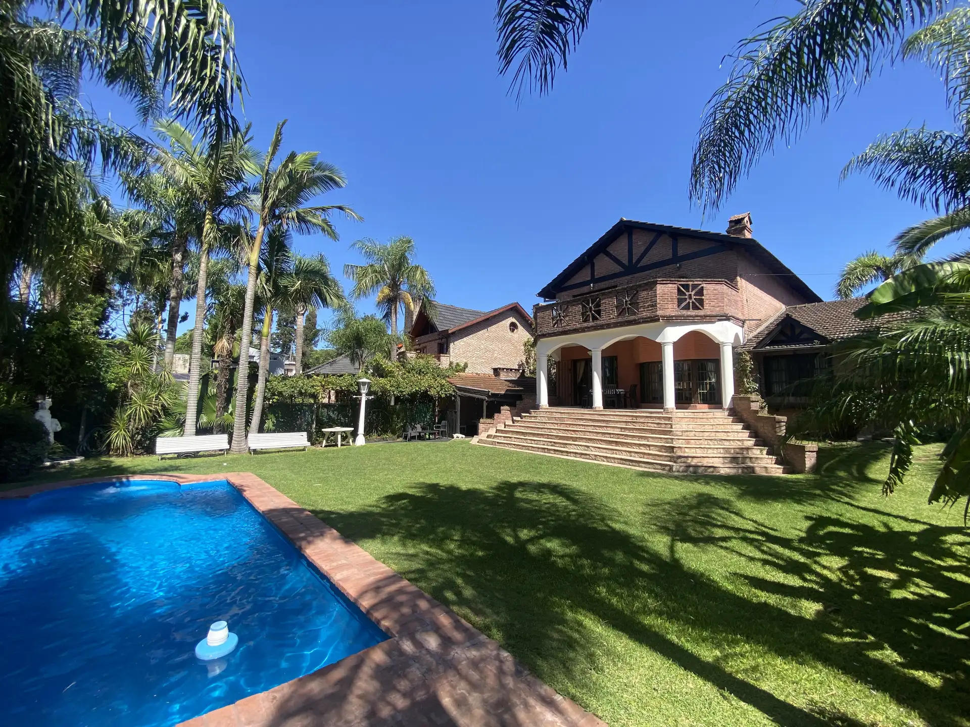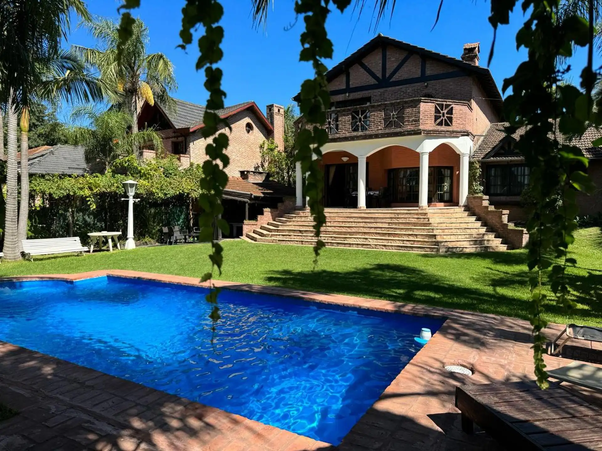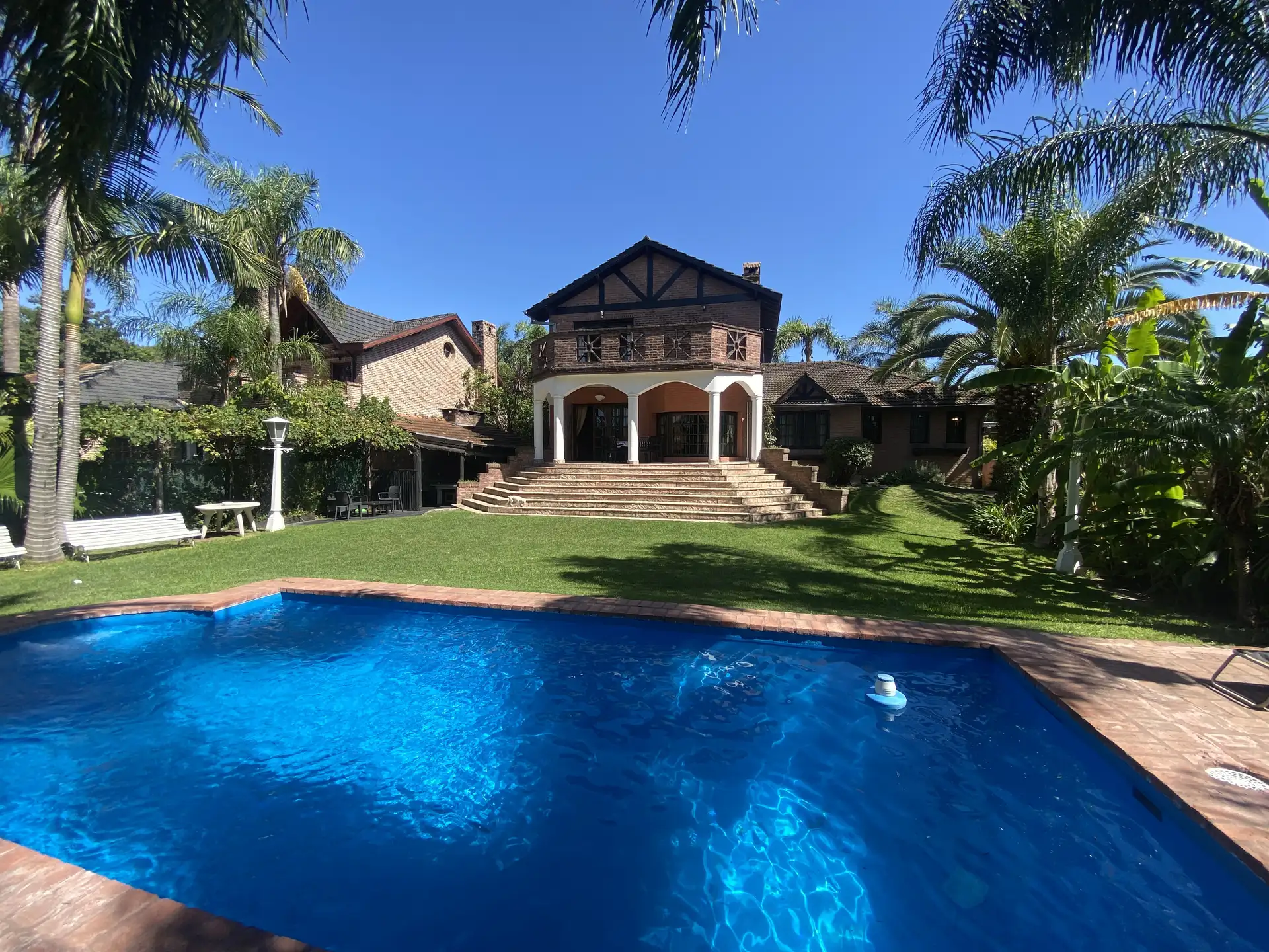 Дом в Don Torcuato (Tigre) в аренду, 800 m² участка, в двух уровнях. На первом этаже: большой разнуровневый гостиный зал, кухня и столовая, санузел, 3 спальни; одна из них с ванной комнатой (suite), отдельная ванная; 4-я комната для прислуги. На втором этаже: просторная гостиная или playroom с балконом и видом на парк. В цокольной части: (закреплённое) парковочное место на 2 автомобиля, прачечная и санузел. На участке: парк с бассейном, галерея с видом на парк и зона гриля с большой решёткой.
