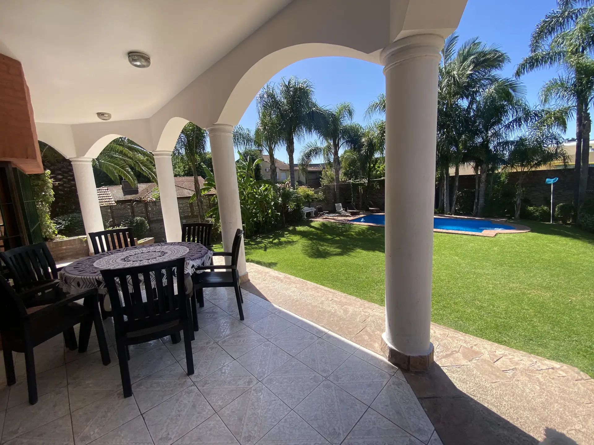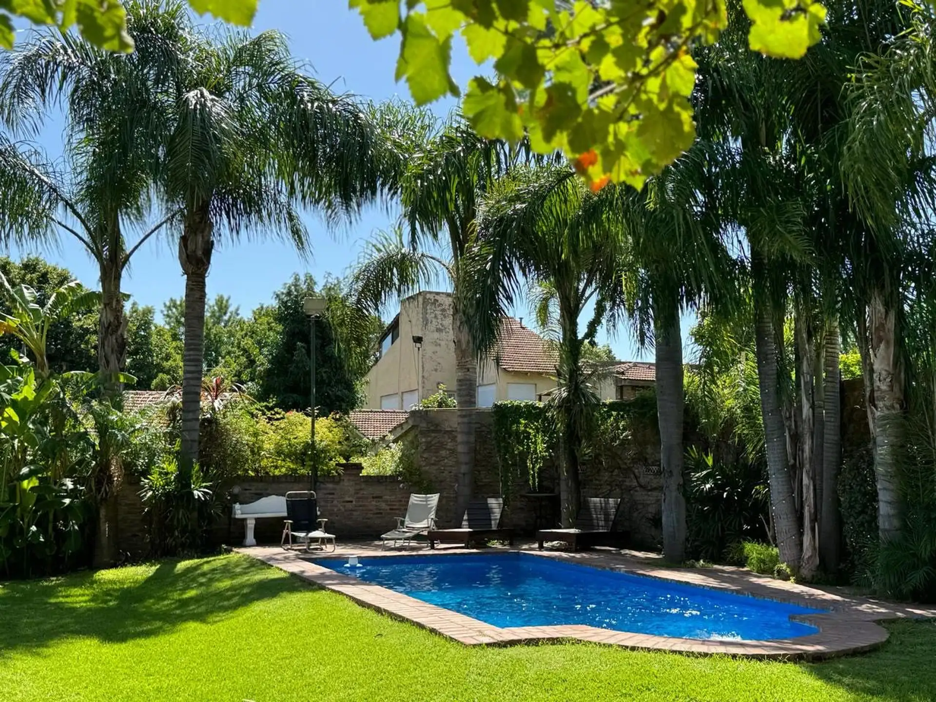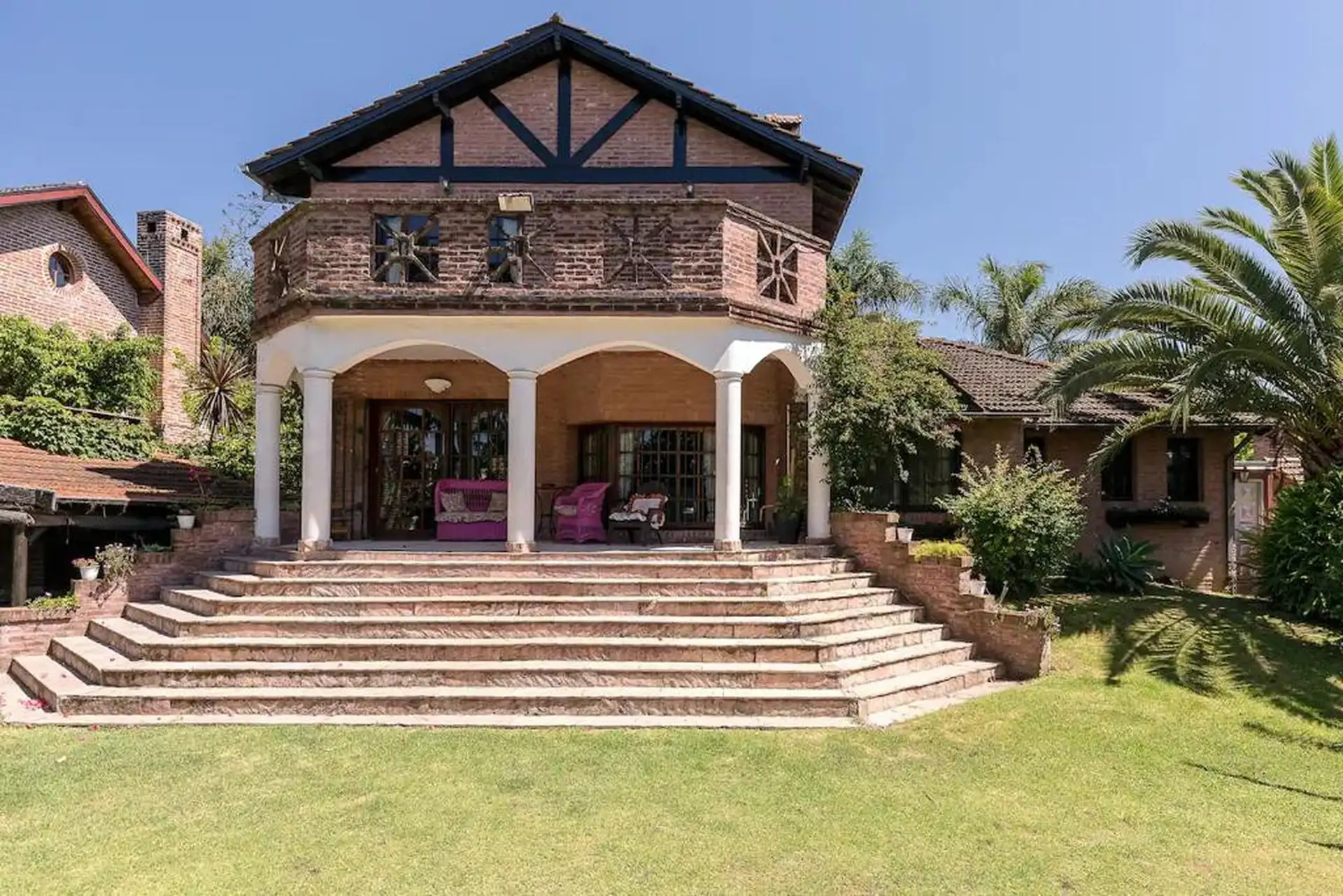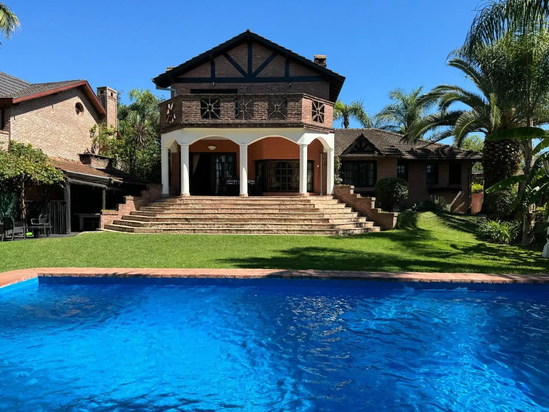 Дом в Don Torcuato (Tigre) в аренду, 800 m² участка, в двух уровнях. На первом этаже: большой разнуровневый гостиный зал, кухня и столовая, санузел, 3 спальни; одна из них с ванной комнатой (suite), отдельная ванная; 4-я комната для прислуги. На втором этаже: просторная гостиная или playroom с балконом и видом на парк. В цокольной части: (закреплённое) парковочное место на 2 автомобиля, прачечная и санузел. На участке: парк с бассейном, галерея с видом на парк и зона гриля с большой решёткой.
