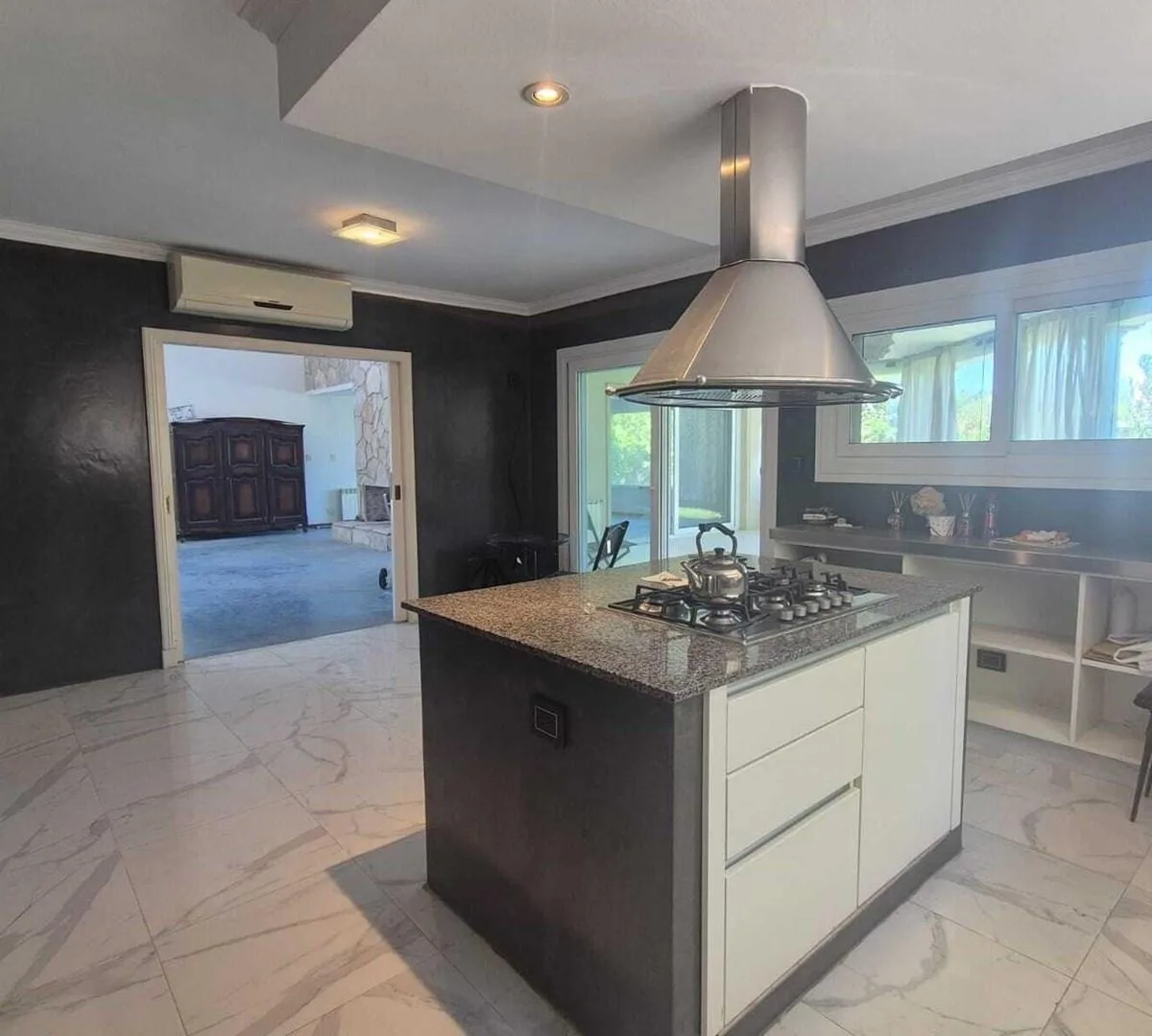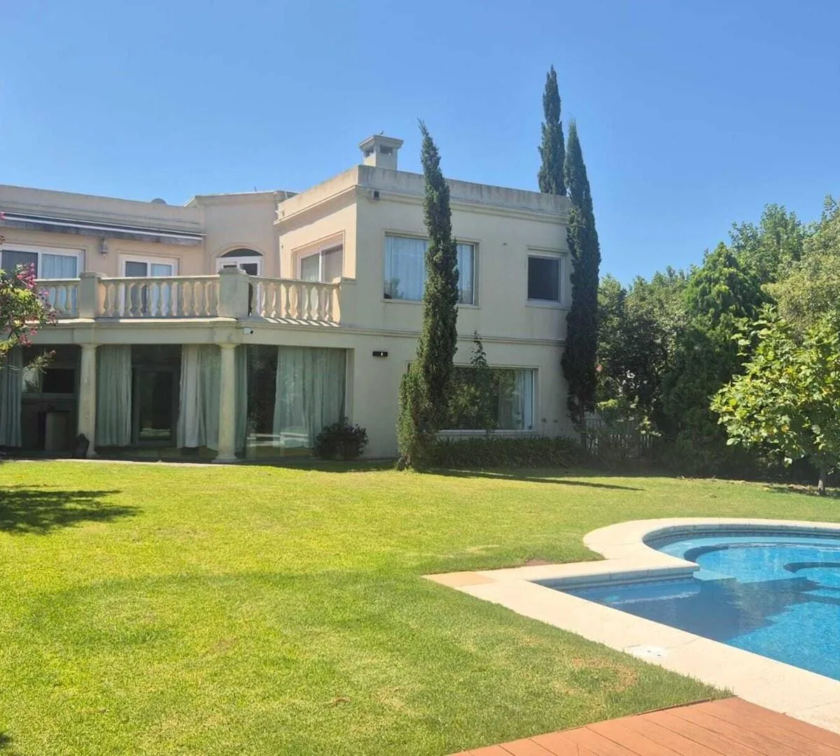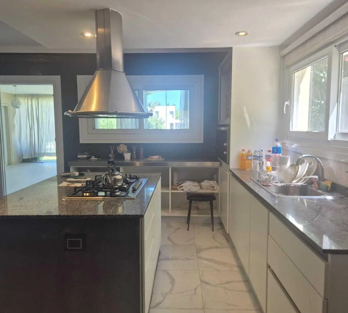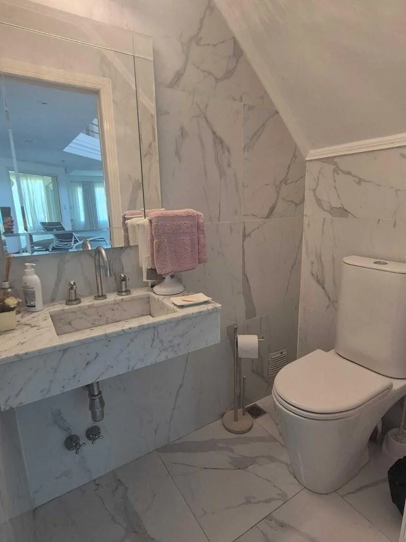 Дом в Santa Barbara, Tigre, на аренду. В доме большая гостиная с двойной высотой и обеденной зоной, разделёнными камином, гостевой туалет, кабинет и кухня с островом и местом под обеденную зону. Есть кондиционеры, газовая варочная панель, духовой шкаф ariston, прачечная с бойлером для горячей воды, стиральная машина и котёл. Спальни: главная suite с видом на лагуну и выходом на террасу, ванная tri-разделённая, гардеробная; 3 спальни с выходом на террасы и шкафами в двух из них, 1 общая полноценн