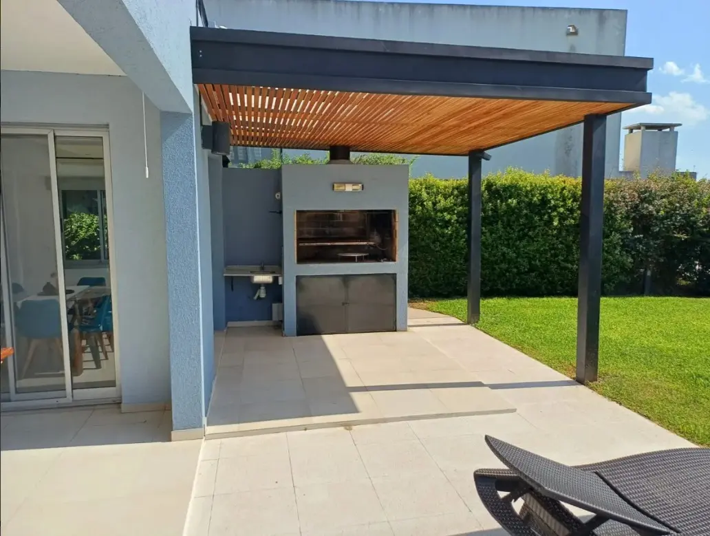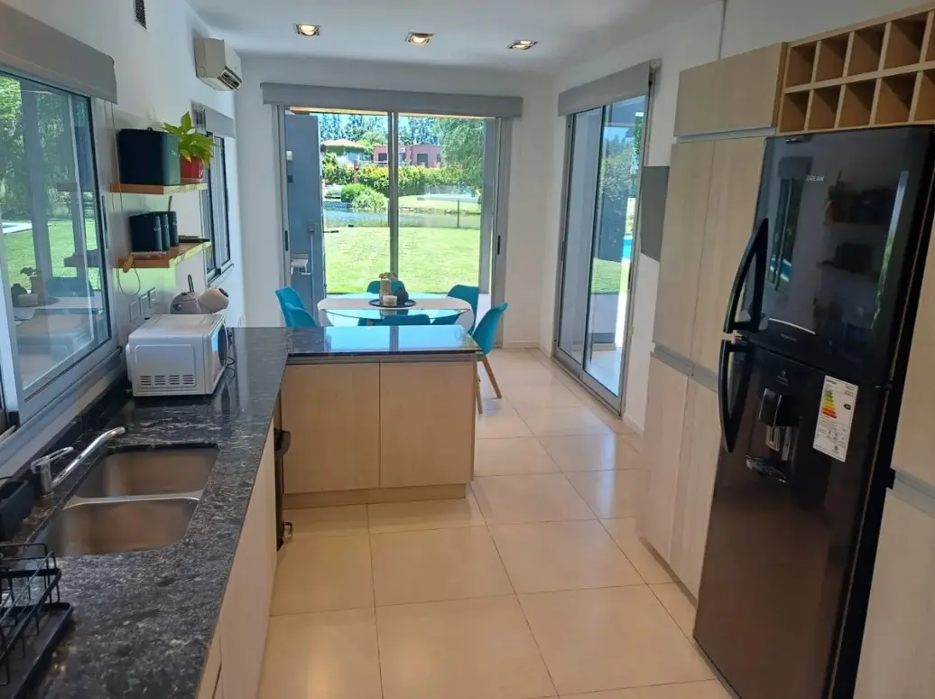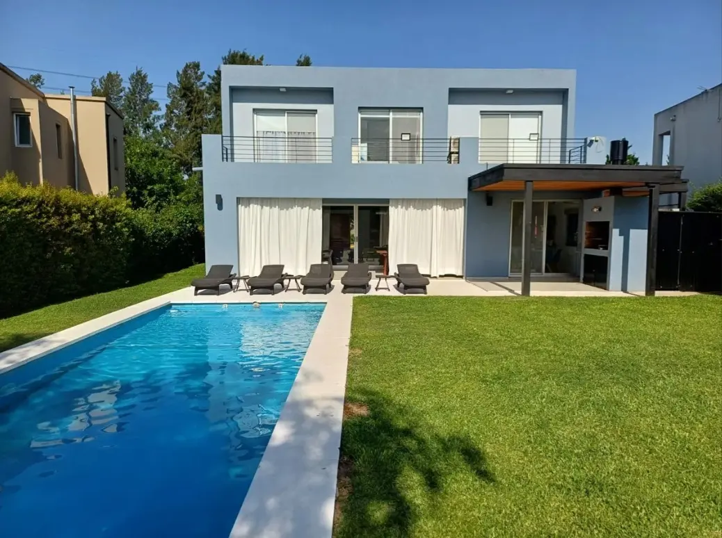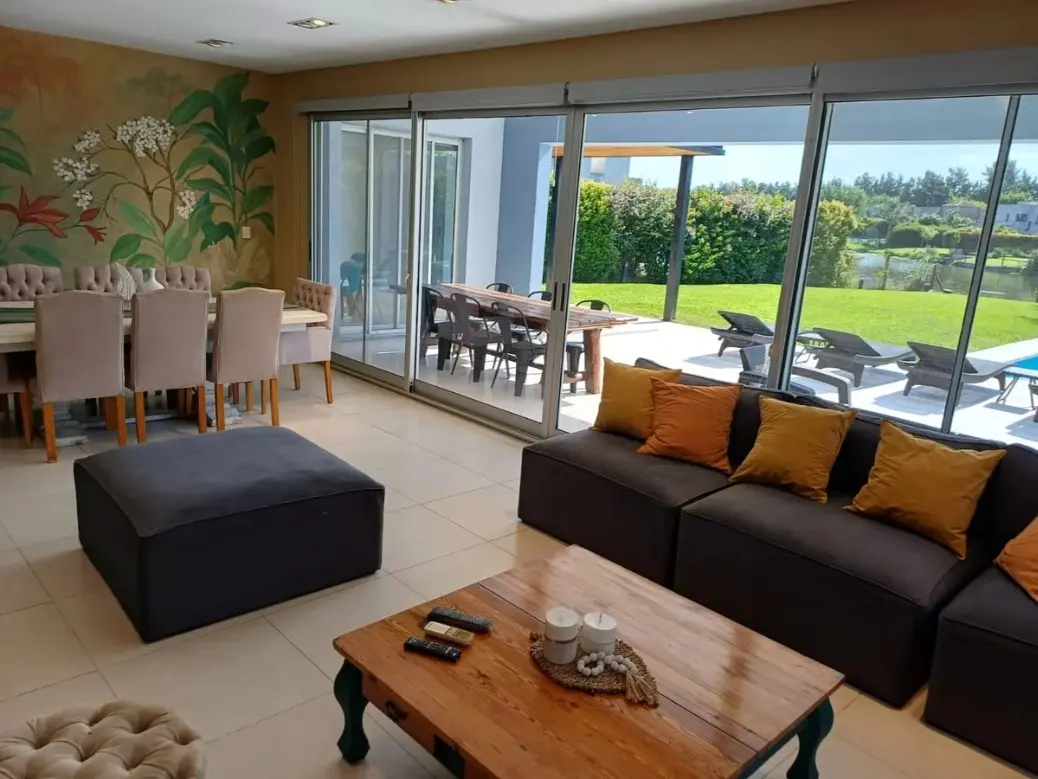 Аренда дома с 8 комнатами в Tigre (частный закрытый район La Comarca, General Pacheco, Северная зона Buenos Aires). Площадь около 300 m², вид на озеро. На цокольном и первом этажах: просторная гостиная-столовая с окнами в пол и стеклопакетами DVH, кухня с обеденной зоной, гостевой туалет, кабинет или family, служебная комната с душевой, прачечная, кладовая. Предусмотрен навес для 3 автомобилей и открытое место для 2. Во дворе галерея с мебелью, крытая зона гриля, бассейн 4 x 10 метров, парк с Ba
