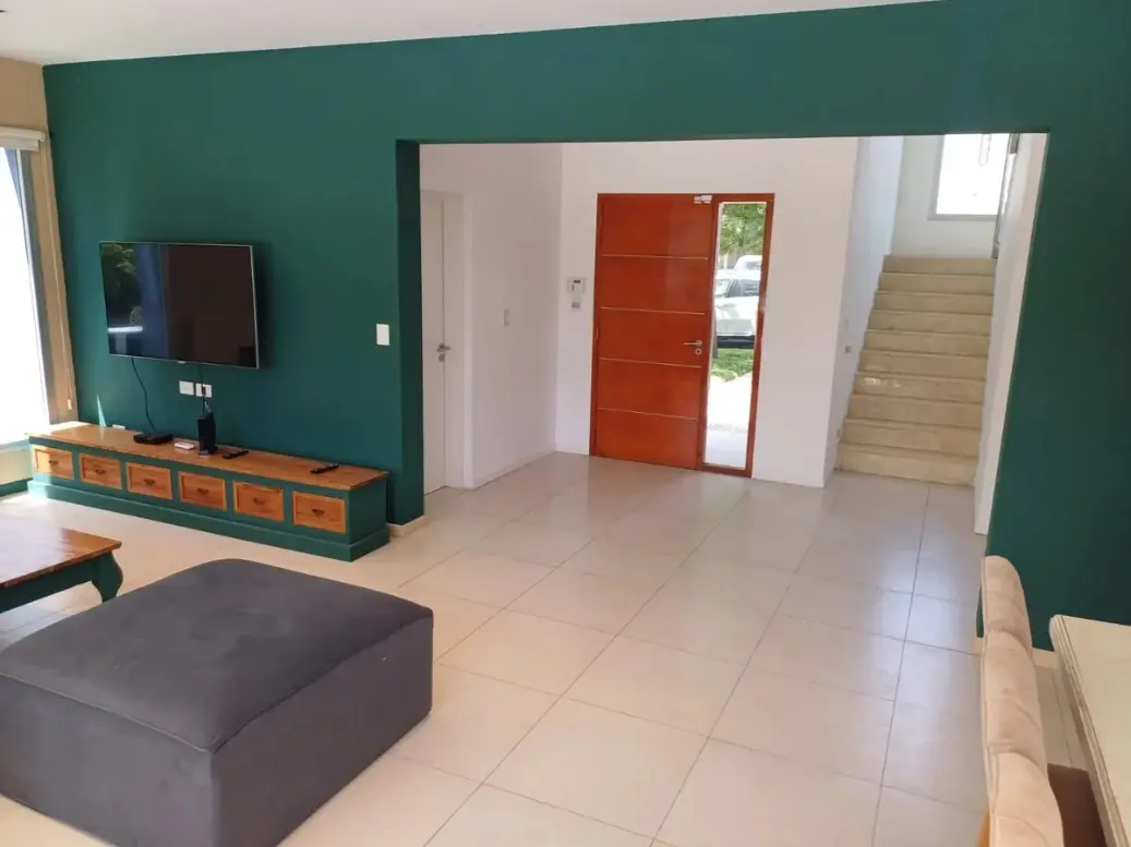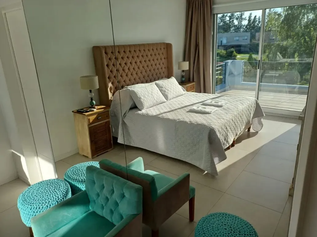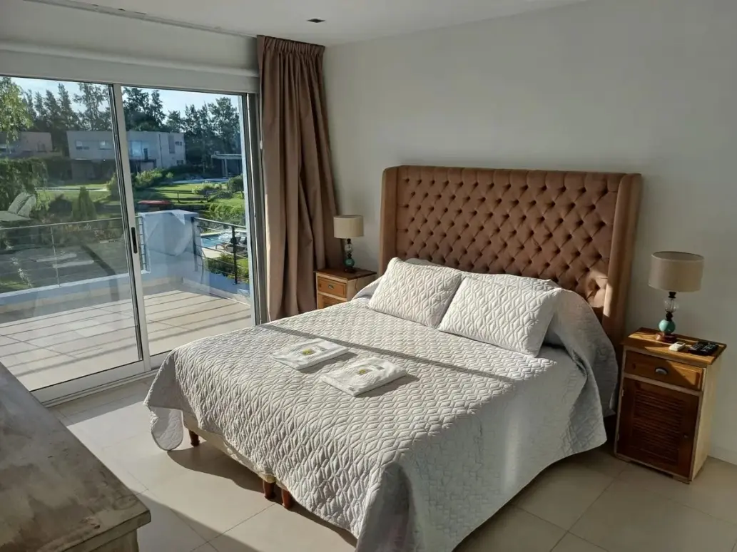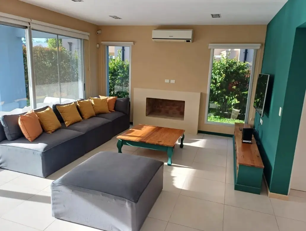 Аренда дома с 8 комнатами в Tigre (частный закрытый район La Comarca, General Pacheco, Северная зона Buenos Aires). Площадь около 300 m², вид на озеро. На цокольном и первом этажах: просторная гостиная-столовая с окнами в пол и стеклопакетами DVH, кухня с обеденной зоной, гостевой туалет, кабинет или family, служебная комната с душевой, прачечная, кладовая. Предусмотрен навес для 3 автомобилей и открытое место для 2. Во дворе галерея с мебелью, крытая зона гриля, бассейн 4 x 10 метров, парк с Ba