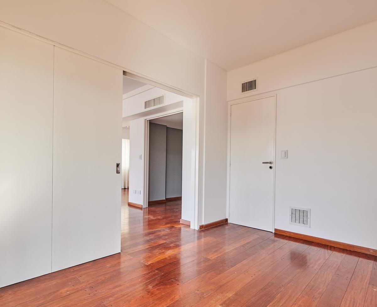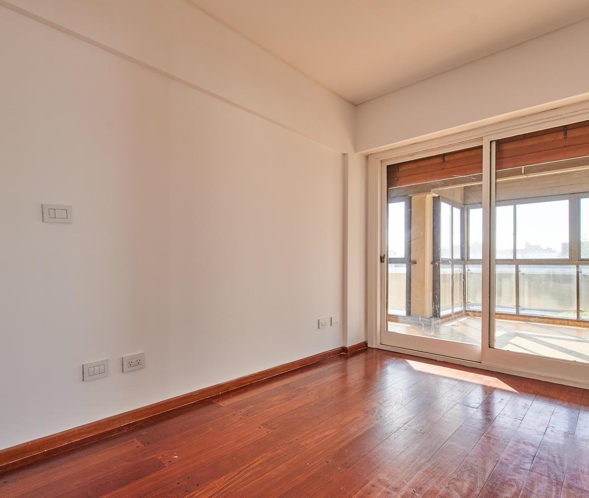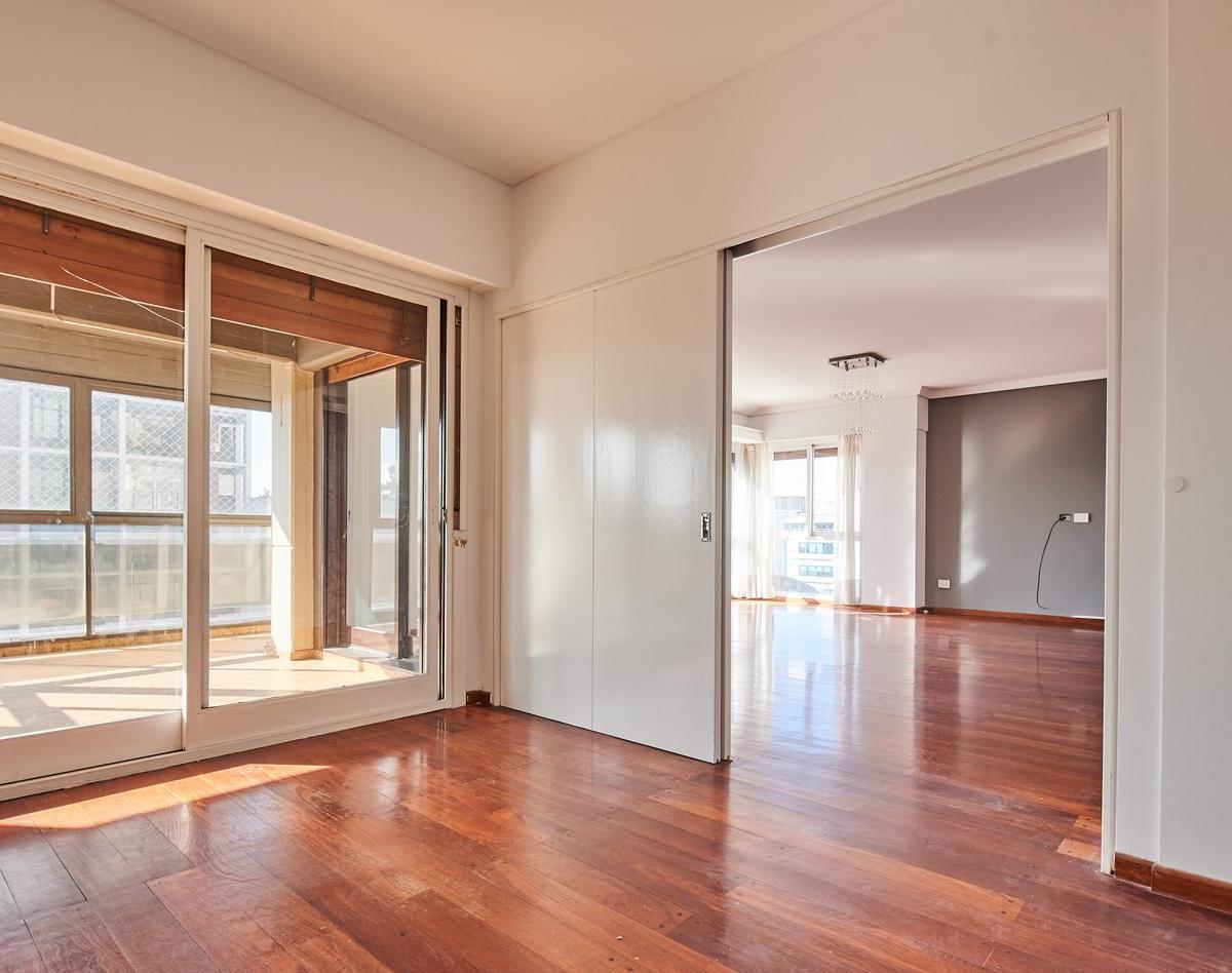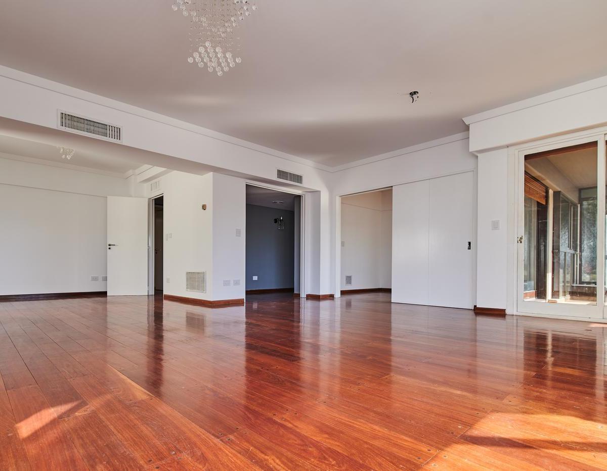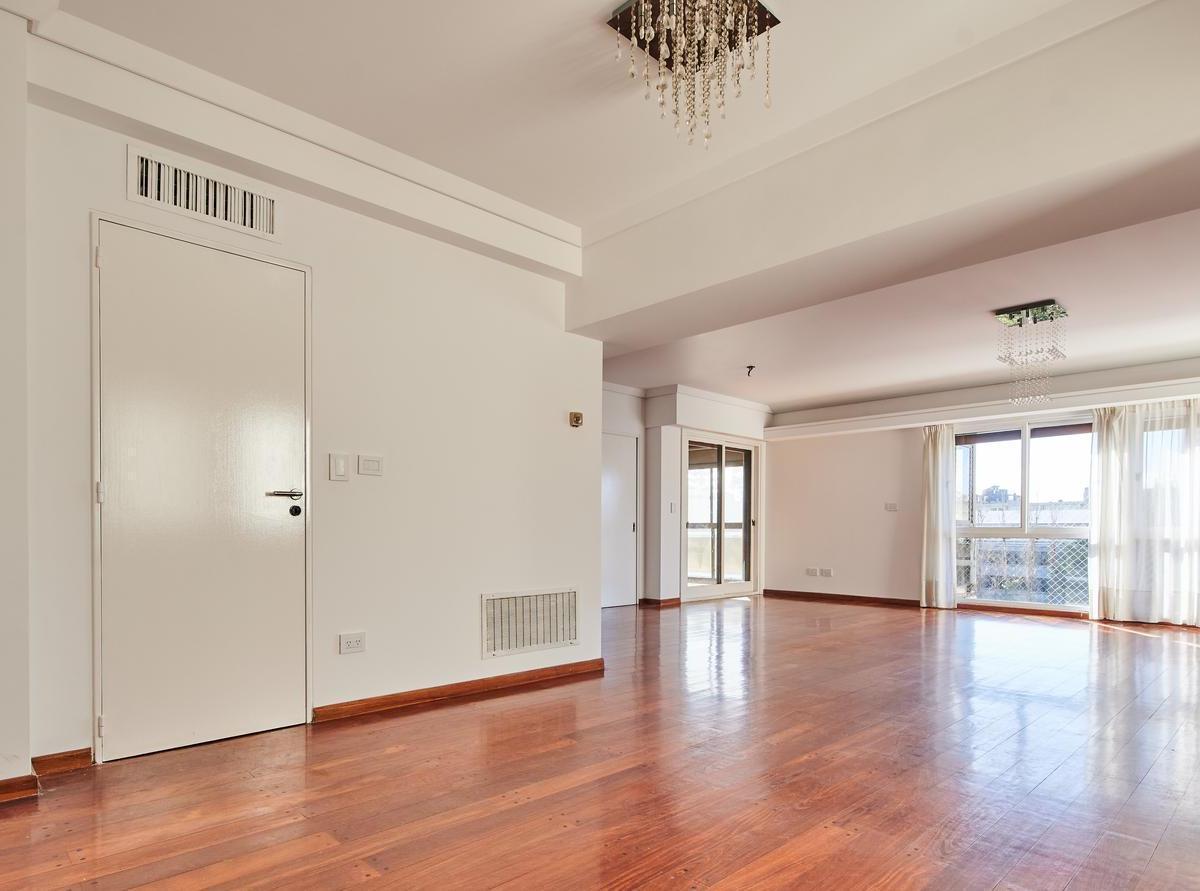 Полуэтажная квартира площадью 205 m² находится на 4-м этаже башни Torre Cinque у Av. Del Libertador (район Olivos). В планировке 3 спальни: главная с master suite, гардеробной и сауной, ещё 2 спальни; в квартире 2 ванные комнаты, гостевой туалет и отдельная комната для прислуги с собственной ванной. Центральная система кондиционирования (холод/тепло), паркетная отделка, в том числе в зоне гостиной и прихожей, кухня с кухонной мебелью. Есть закрытый балкон-терраса и два (закреплённых) крытых парк
