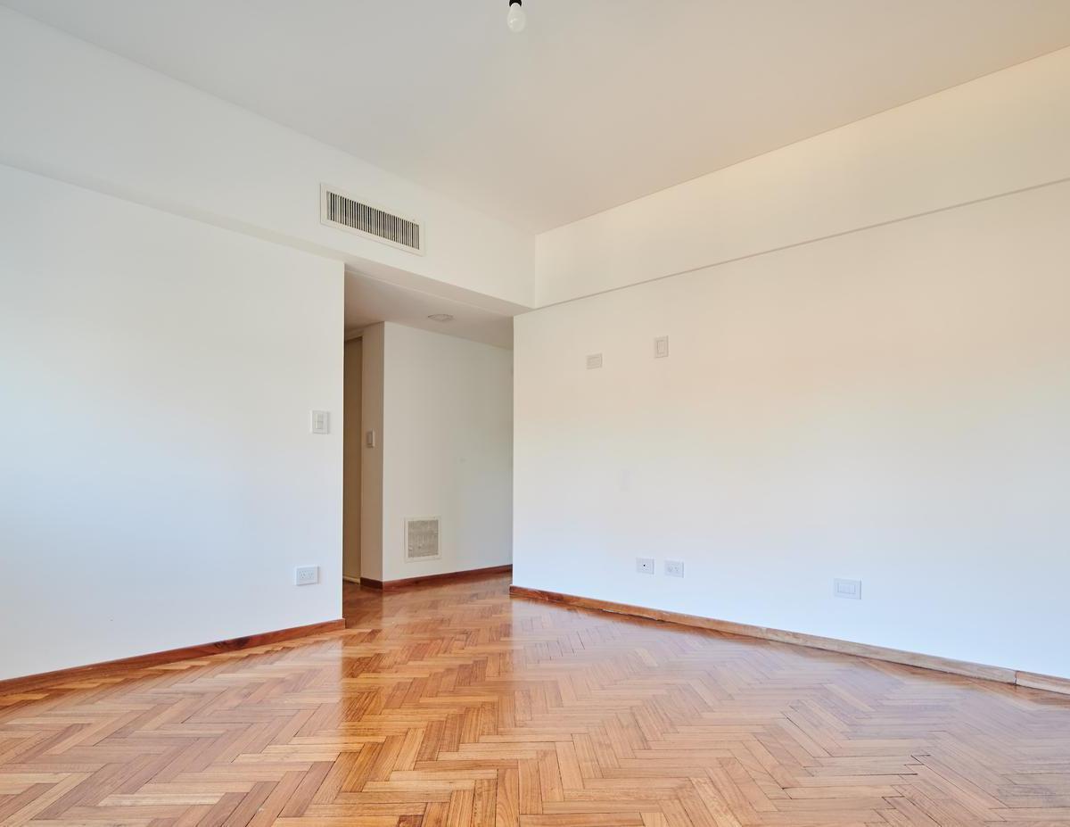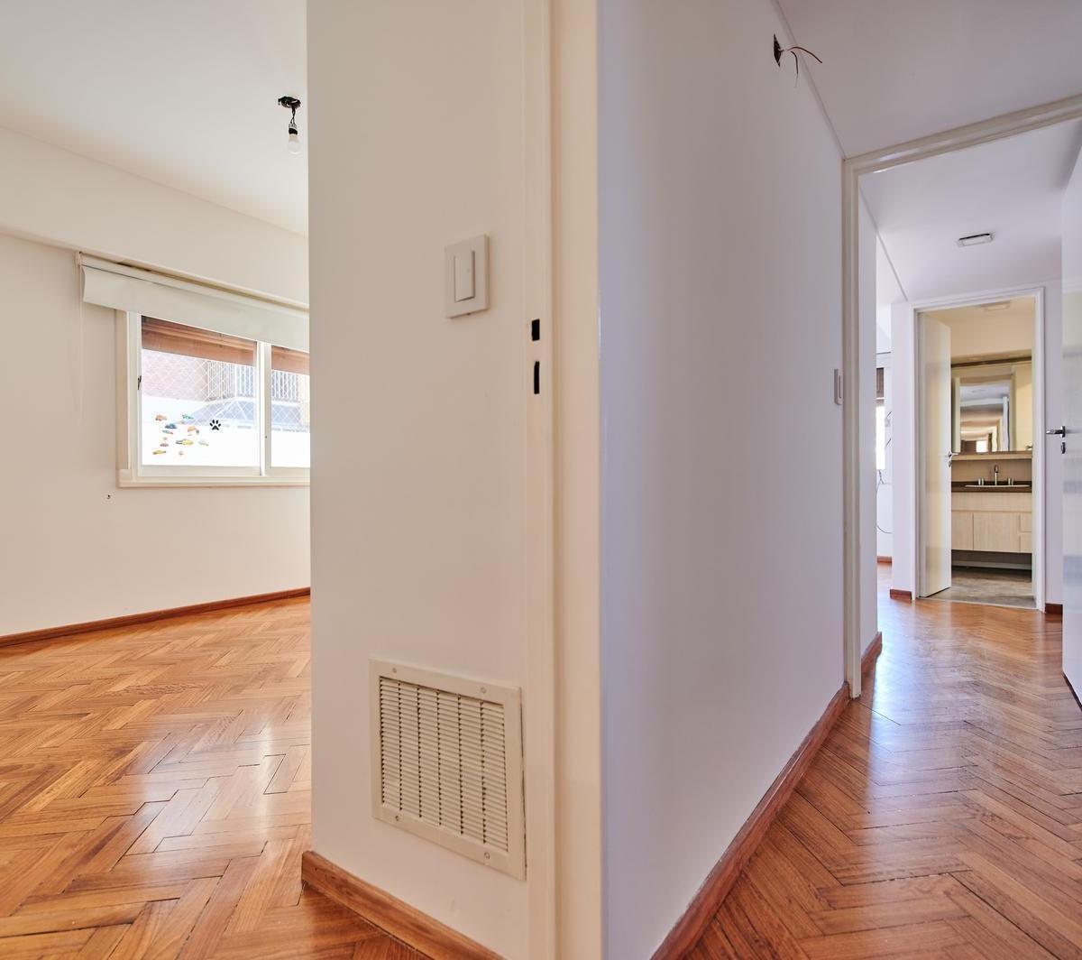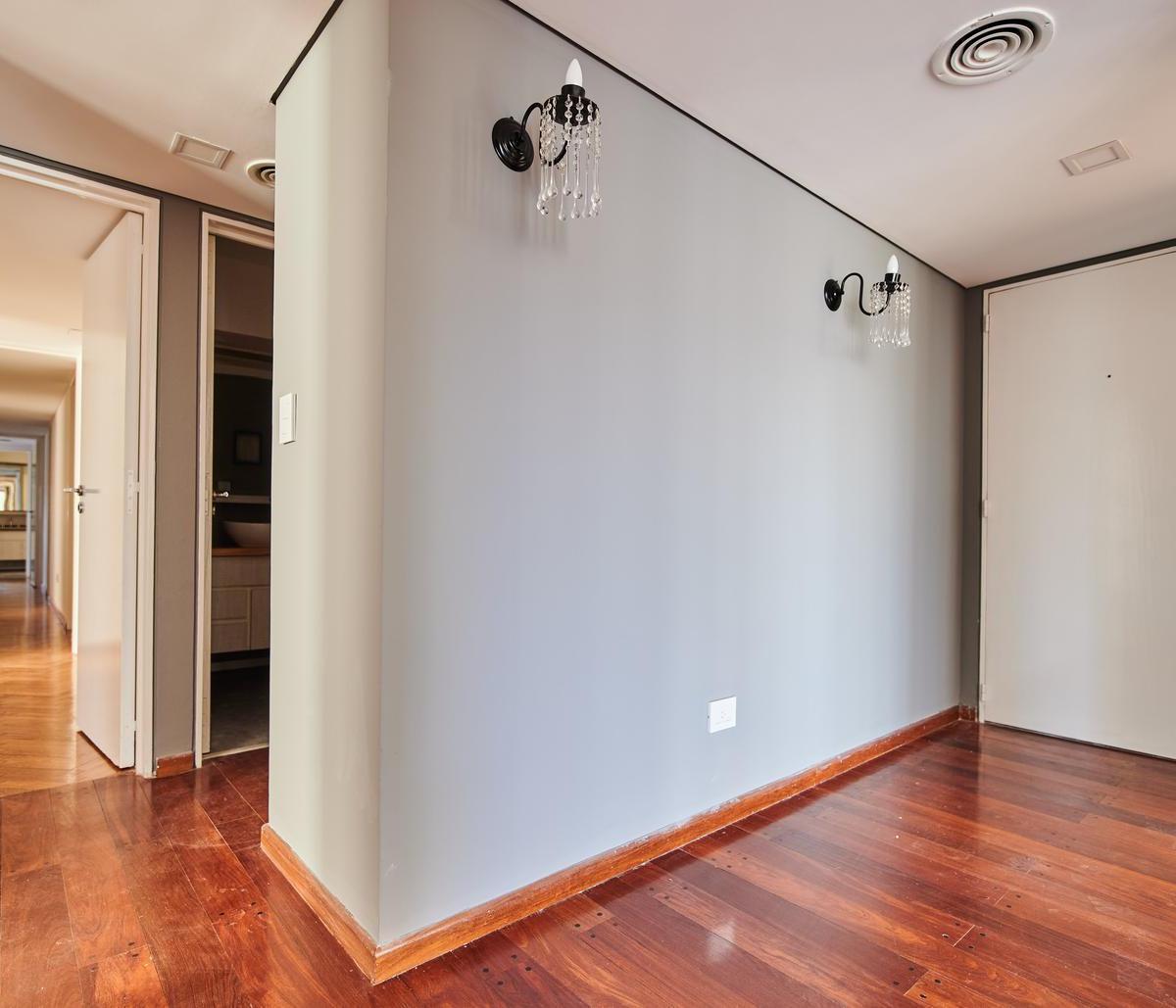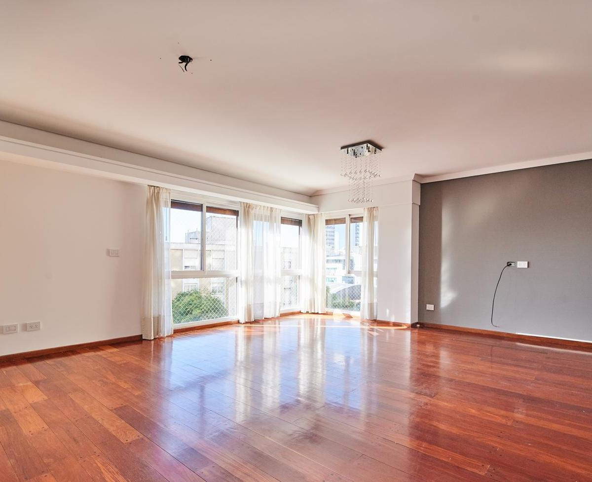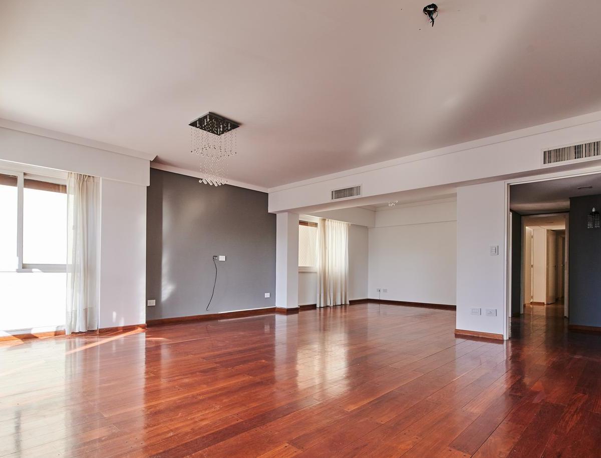 Полуэтажная квартира площадью 205 m² находится на 4-м этаже башни Torre Cinque у Av. Del Libertador (район Olivos). В планировке 3 спальни: главная с master suite, гардеробной и сауной, ещё 2 спальни; в квартире 2 ванные комнаты, гостевой туалет и отдельная комната для прислуги с собственной ванной. Центральная система кондиционирования (холод/тепло), паркетная отделка, в том числе в зоне гостиной и прихожей, кухня с кухонной мебелью. Есть закрытый балкон-терраса и два (закреплённых) крытых парк