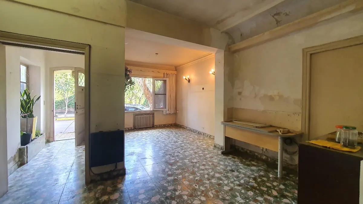 Квартира в Olivos площадью 300 m², двухэтажная, с окнами на улицу (угловое расположение на Hernán Wineberg y Carlos Villate). Планировка включает гостиную на лицевой части, отдельную столовую и кухню-столовую, туалет, двор/сад по периметру спереди, задний двор и подвал. На втором этаже расположены 4 спальни на лицевой стороне, 2 полностью оборудованные ванные комнаты и терраса над внутренним двором; предусмотрен гараж на 2 автомобиля. Требуется ремонт, подходит под профессиональную деятельность.