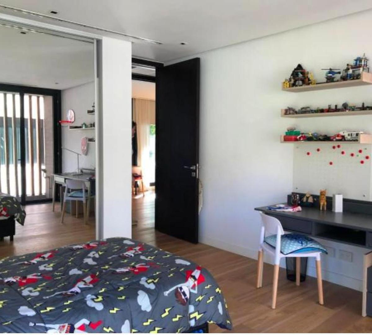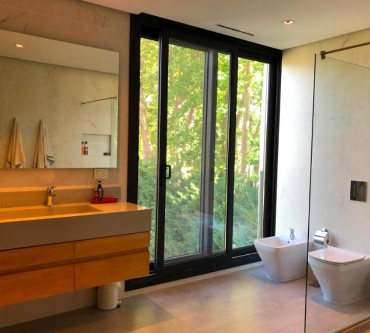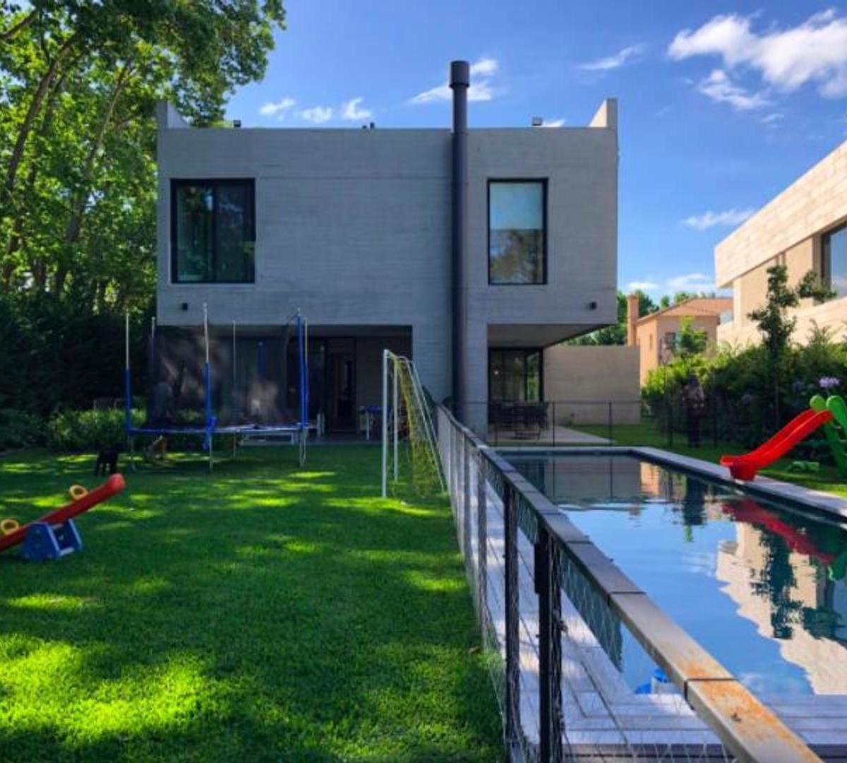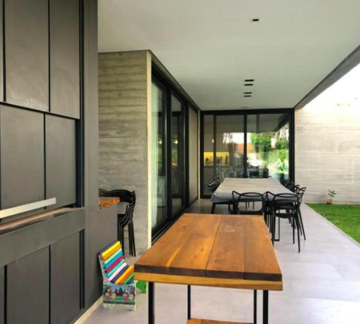 Дом в Beccar, район Los Miradores. На первом этаже: просторная гостиная и столовая с панорамным остеклением, гостевой санузел с ручной росписью на стенах, кухня с барной стойкой и семейная зона с обеденным пространством, две галереи. В одной галерее предусмотрена гостиная, в другой — зона гриля; на участке — большой стол. На втором этаже 5 спален: master suite и 4 semisuites, плюс отдельная семейная зона. Подвал включает общую гостиную для жильцов (SUM), кладовую, помещения для персонала и праче