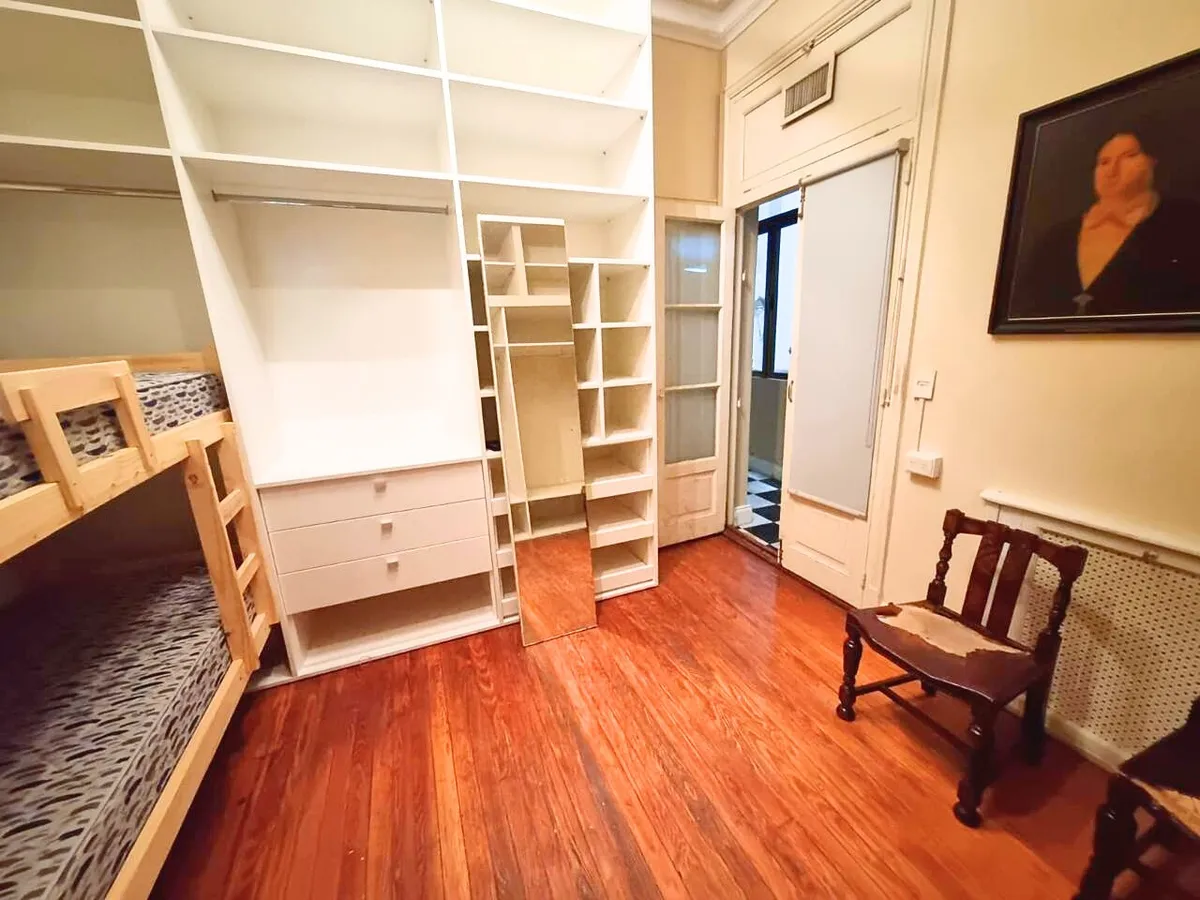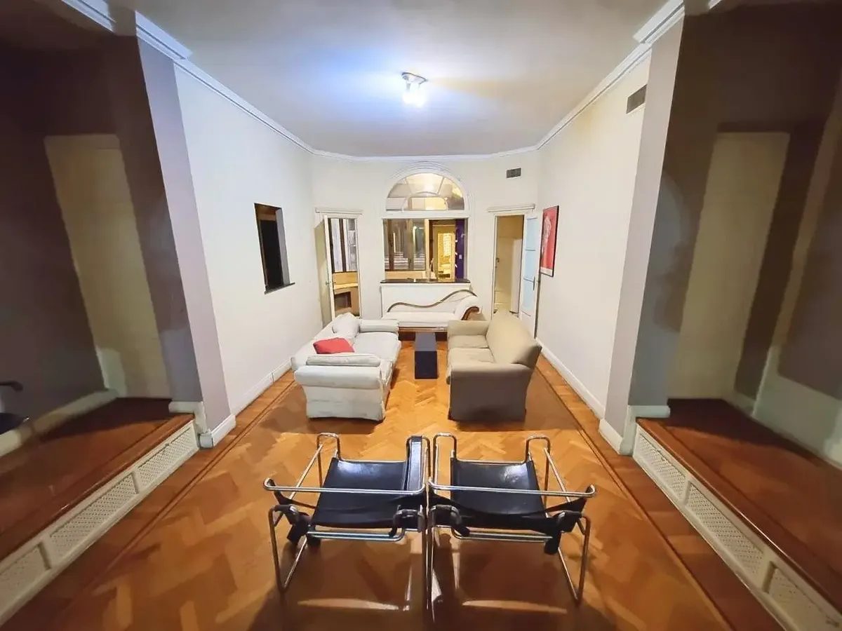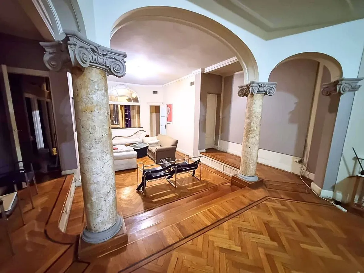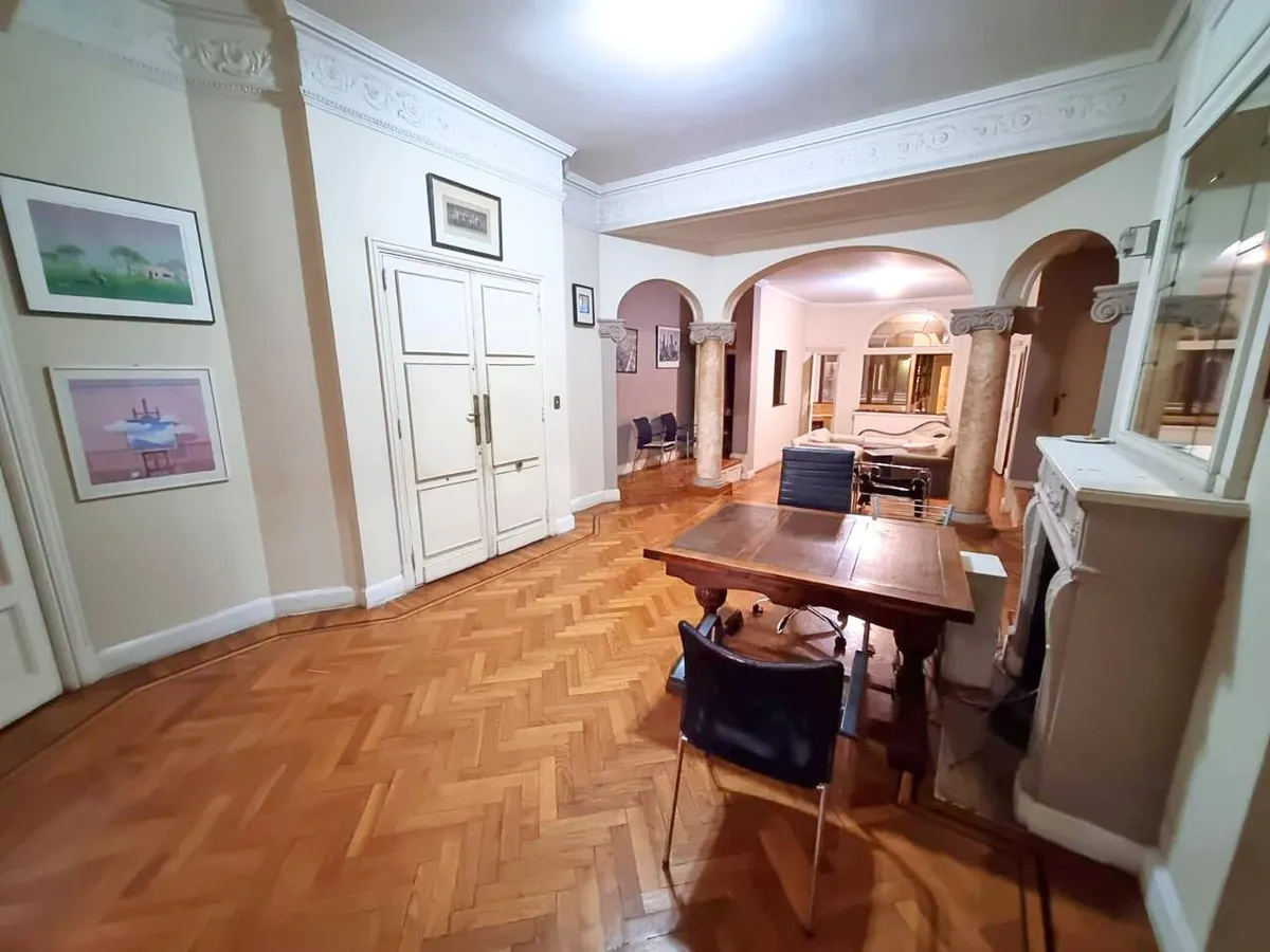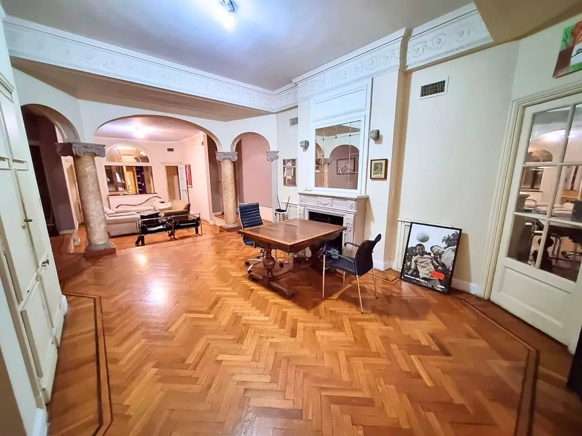 Квартира в старом здании в Retiro, 310 m², 4-й этаж между Suipacha и Carlos Pellegrini. Планировка выходит на улицу и во двор; есть частная площадка (palier privado). В квартире гостиная с камином, столовая с перепадом уровня в сторону улицы, примыкающий кабинет с выходом на балкон. Пять спален, три из них с ванными комнатами, гостевой туалет, кухня, служебная комната, вторая кухня и прачечный блок.