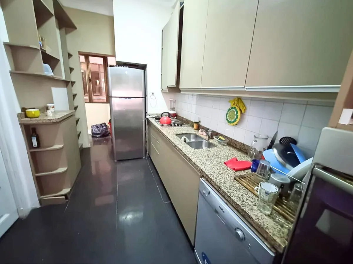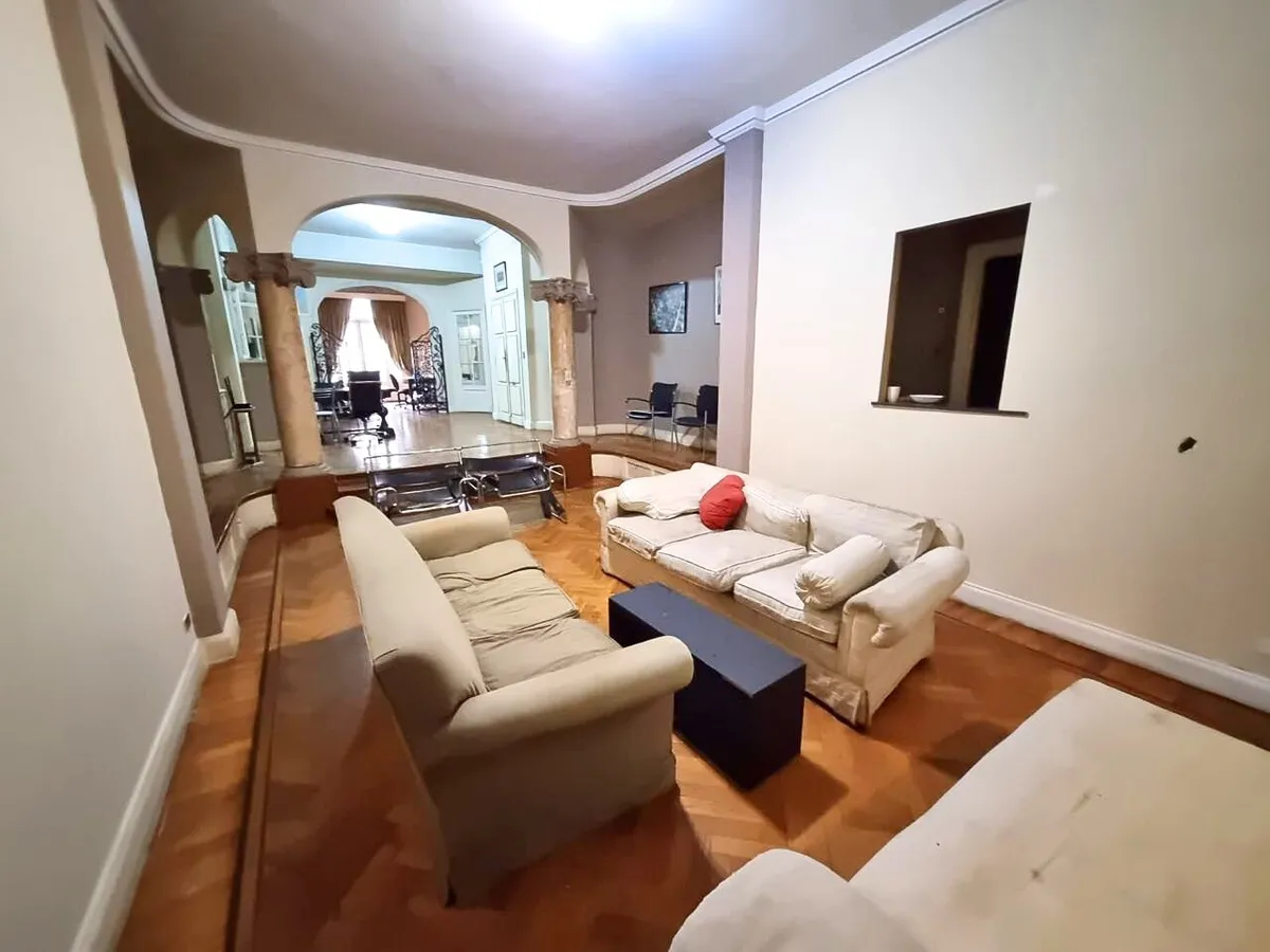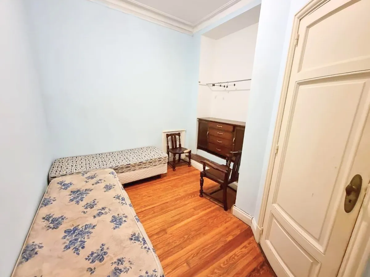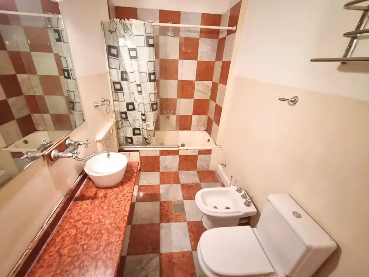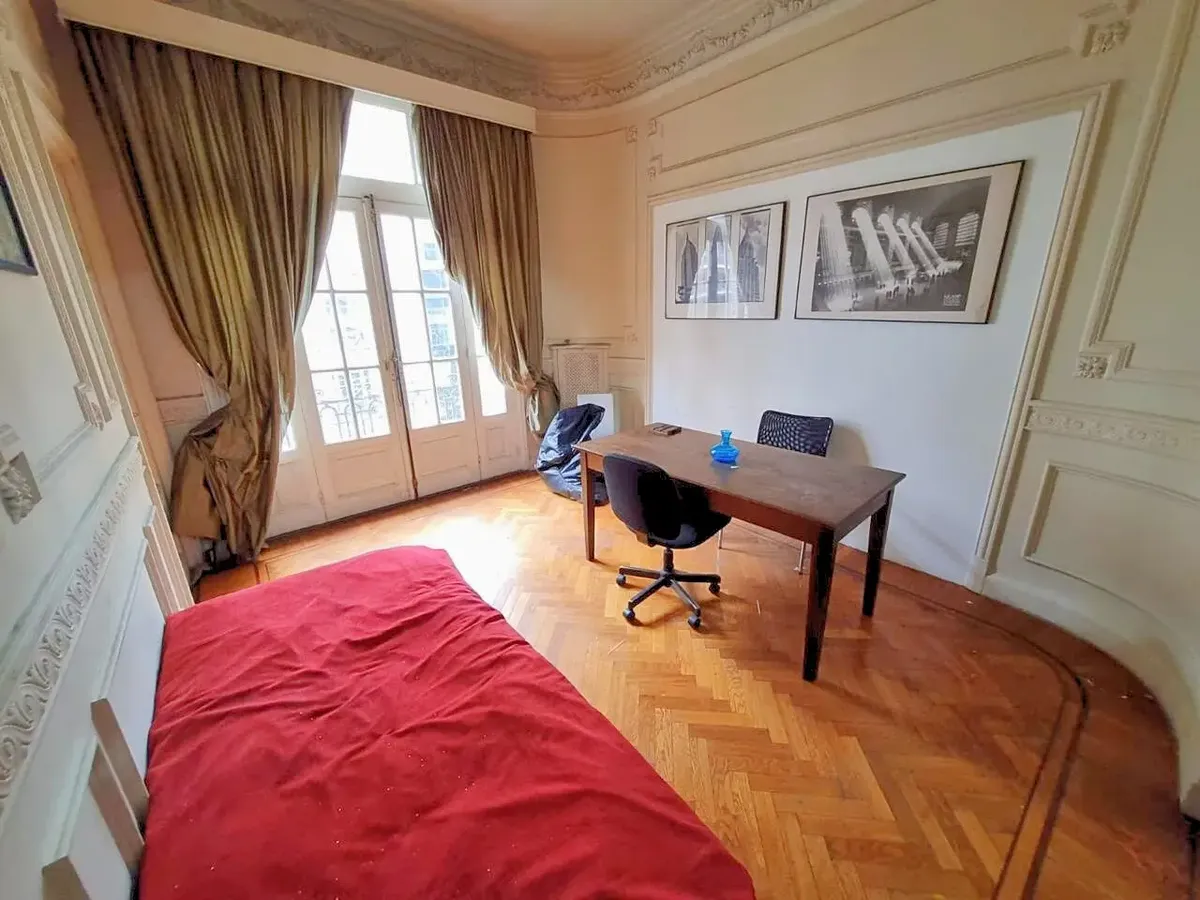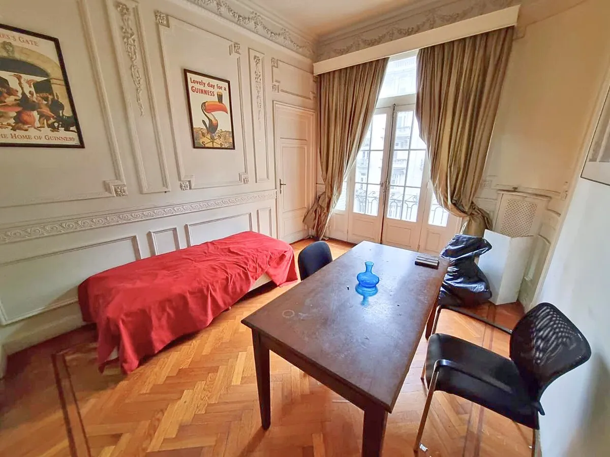 Квартира в старом здании в Retiro, 310 m², 4-й этаж между Suipacha и Carlos Pellegrini. Планировка выходит на улицу и во двор; есть частная площадка (palier privado). В квартире гостиная с камином, столовая с перепадом уровня в сторону улицы, примыкающий кабинет с выходом на балкон. Пять спален, три из них с ванными комнатами, гостевой туалет, кухня, служебная комната, вторая кухня и прачечный блок.
