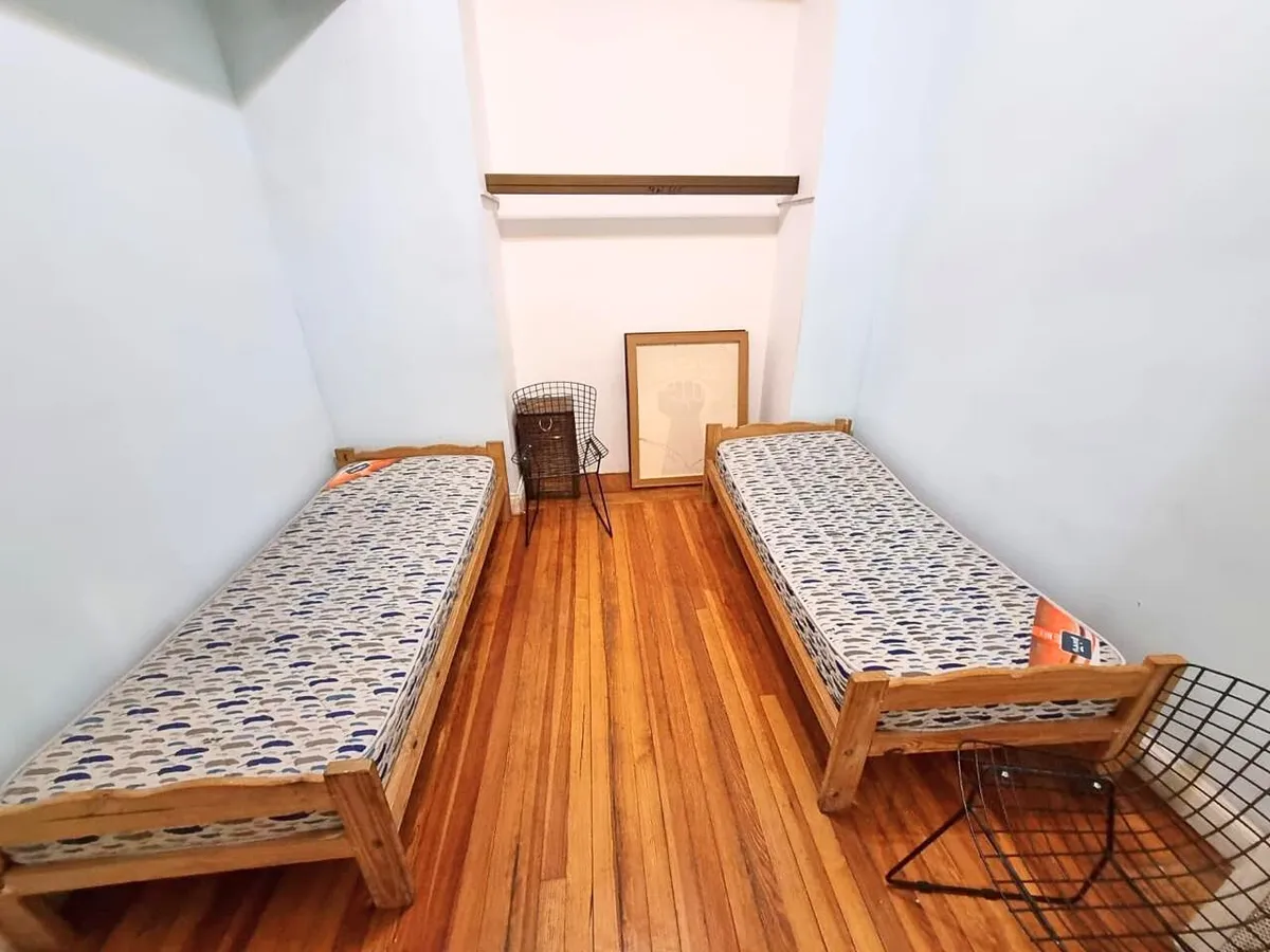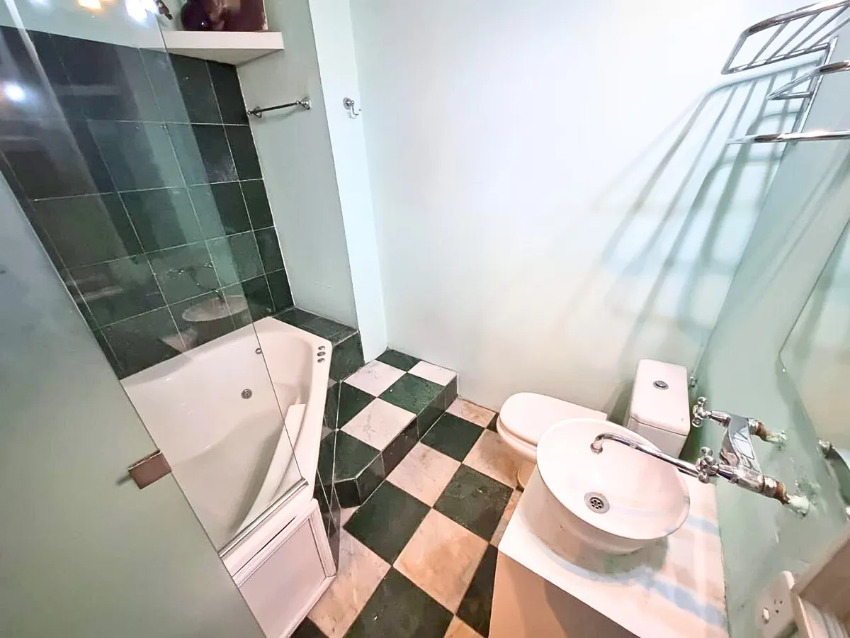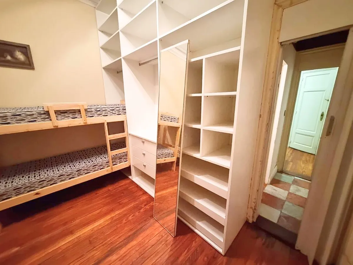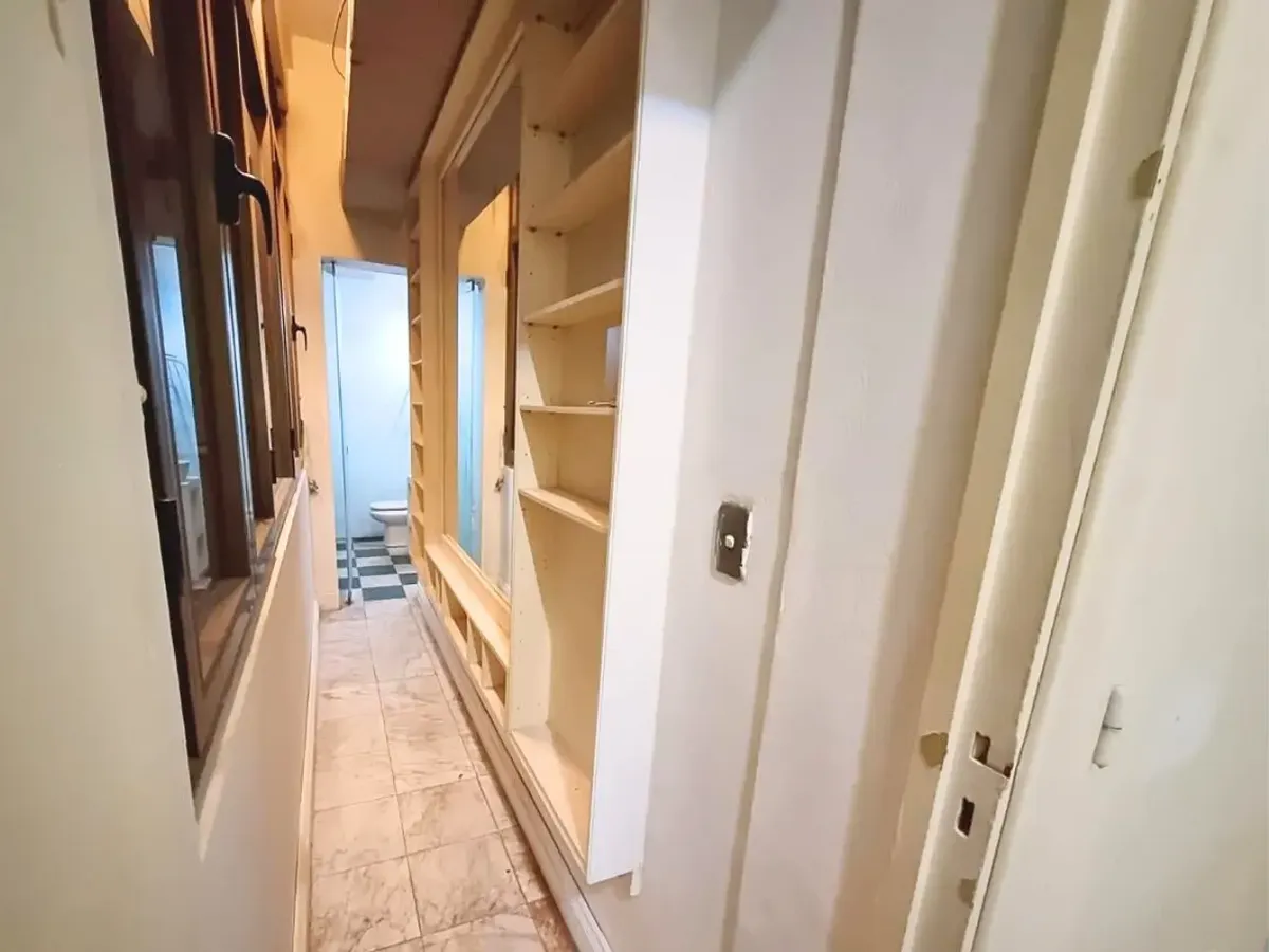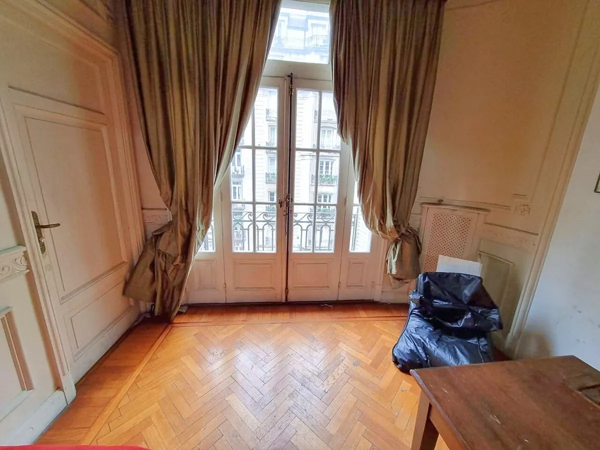 Квартира в старом здании в Retiro, 310 m², 4-й этаж между Suipacha и Carlos Pellegrini. Планировка выходит на улицу и во двор; есть частная площадка (palier privado). В квартире гостиная с камином, столовая с перепадом уровня в сторону улицы, примыкающий кабинет с выходом на балкон. Пять спален, три из них с ванными комнатами, гостевой туалет, кухня, служебная комната, вторая кухня и прачечный блок.