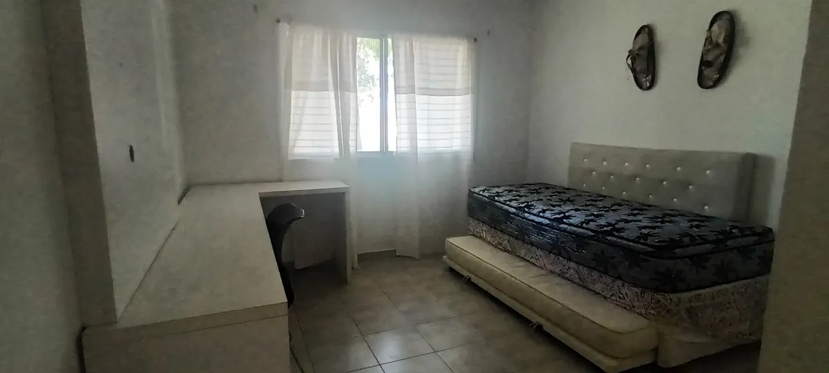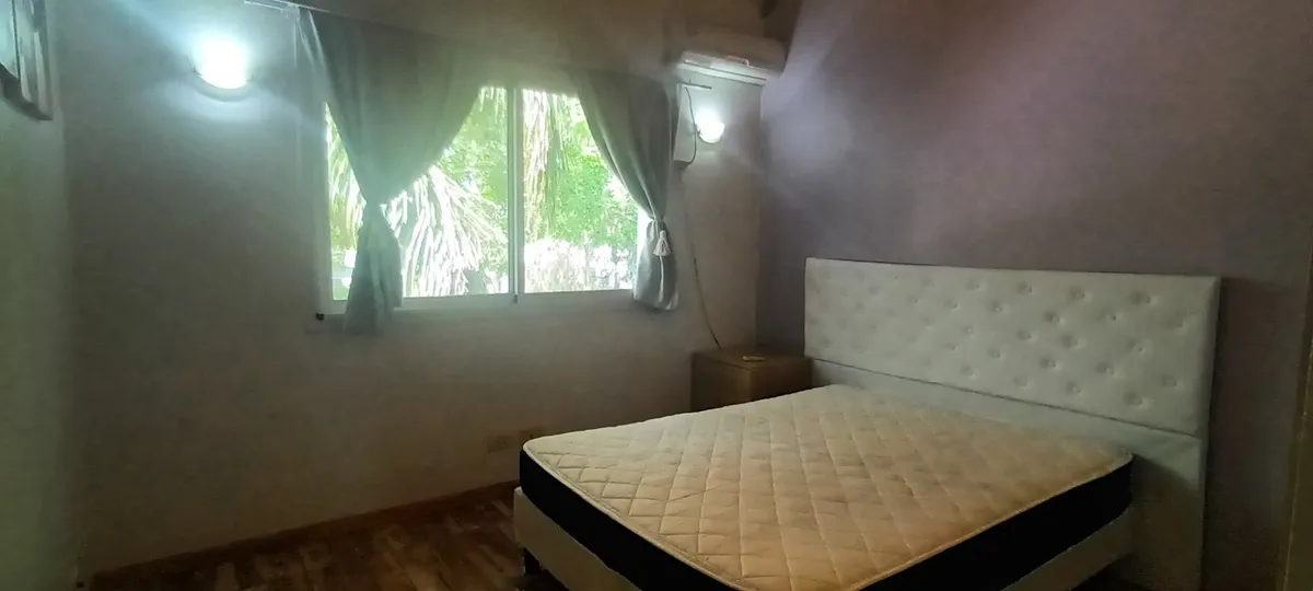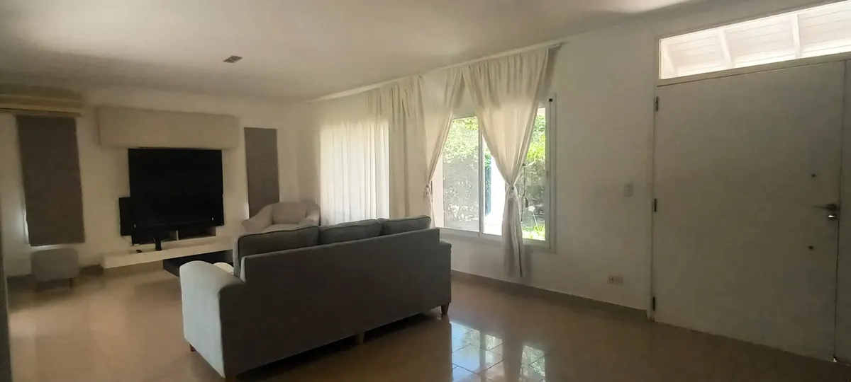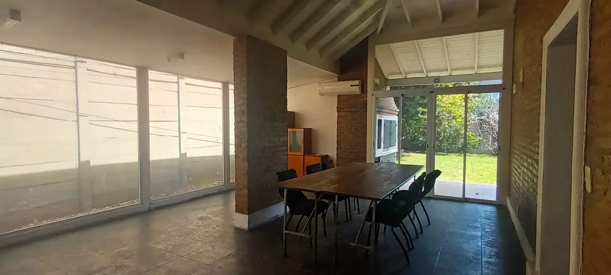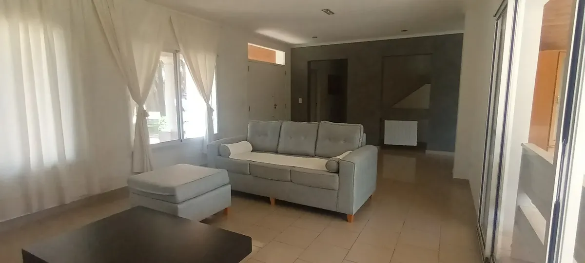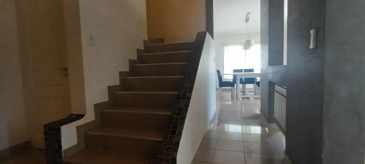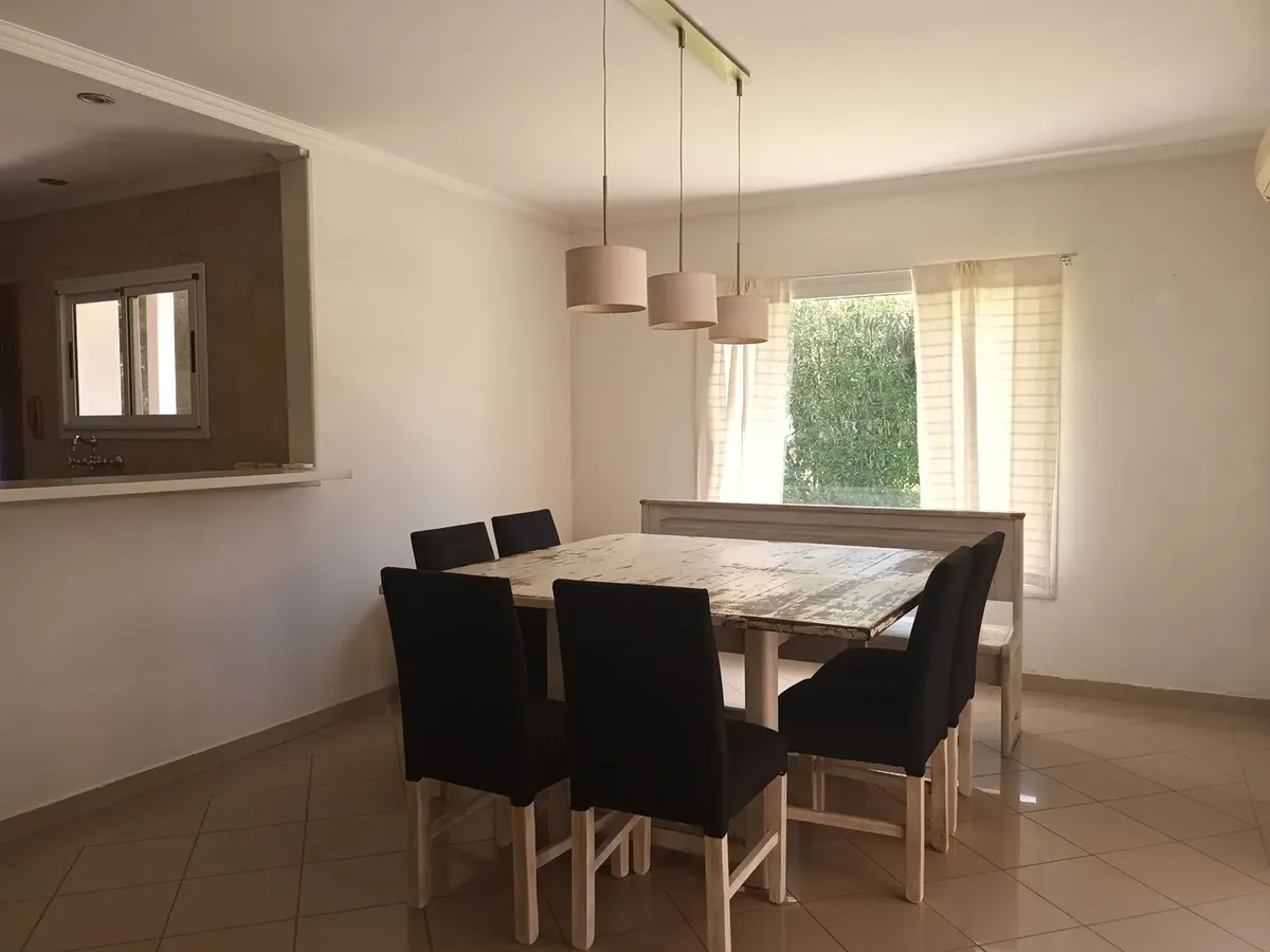 Дом на двух этажах в Valle Claro, Benavidez, Tigre. На первом этаже: гостиная с камином, столовая с барной стойкой, интегрированной с кухней, постирочная (стиральная машина), гостевой санузел с душем, спальня/кабинет с односпальной кроватью, а также отдельная комната с ванной. На втором этаже: 1 suite с выходом на балкон (двуспальная кровать), 2 спальни с двуспальными кроватями и отдельная полноценная ванная. Снаружи: благоустроенный сад, бассейн с зоной солярия, отопление радиаторами и кондицио