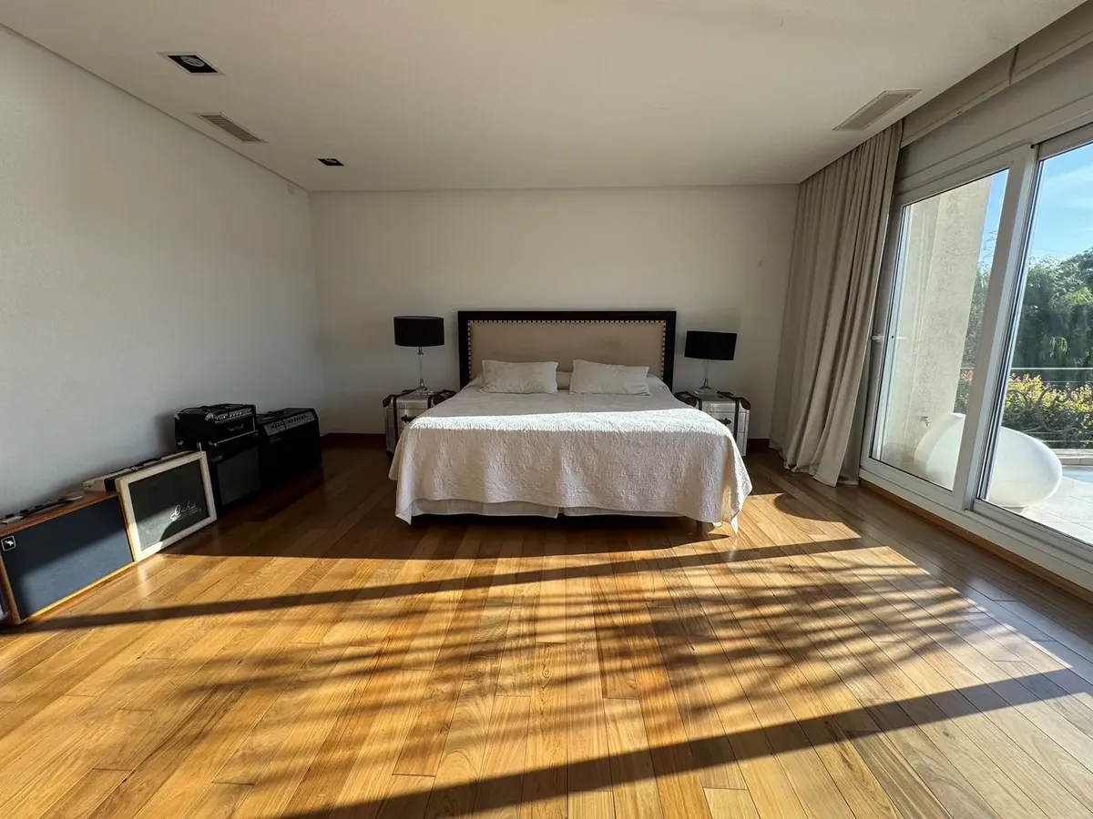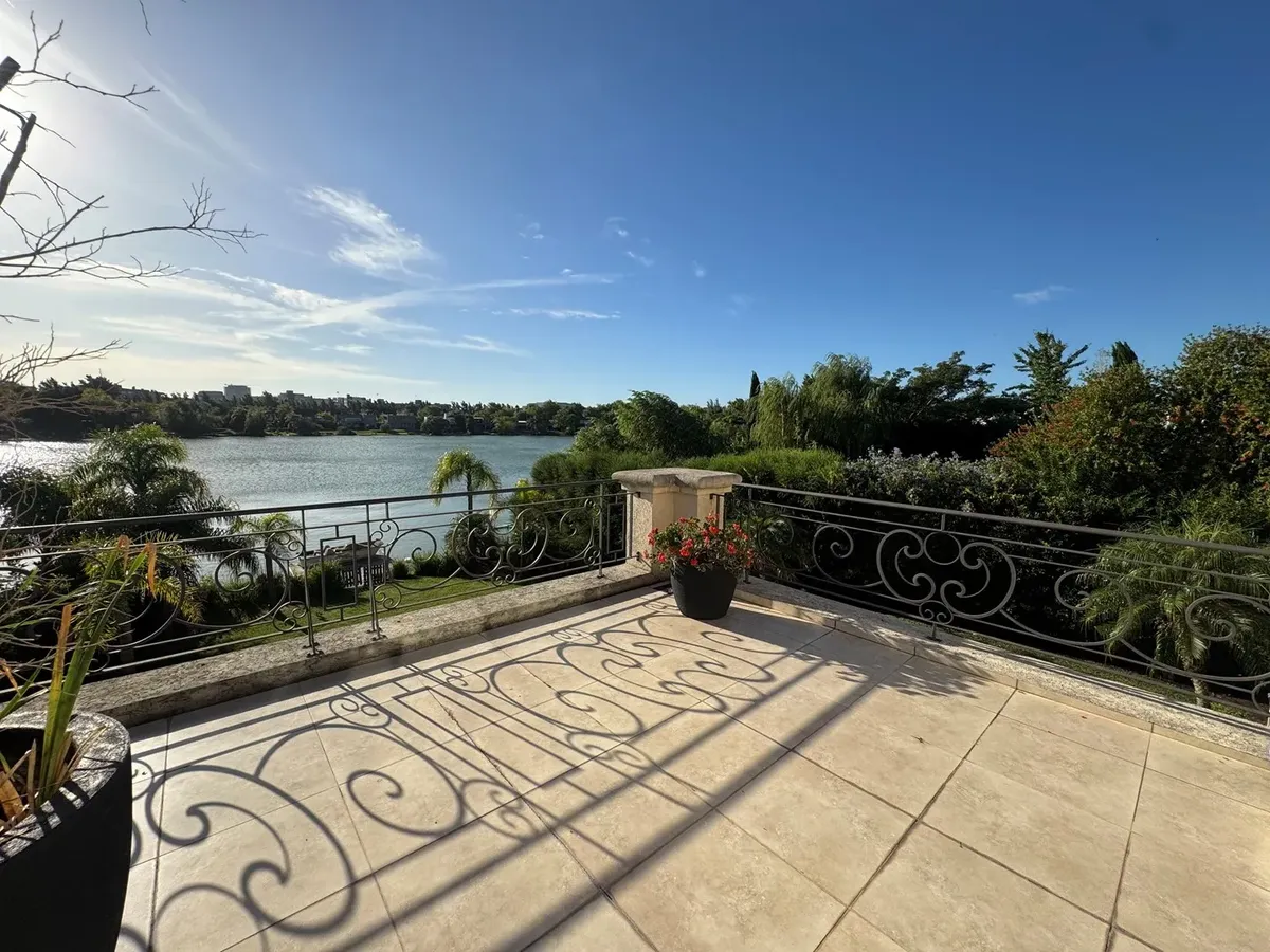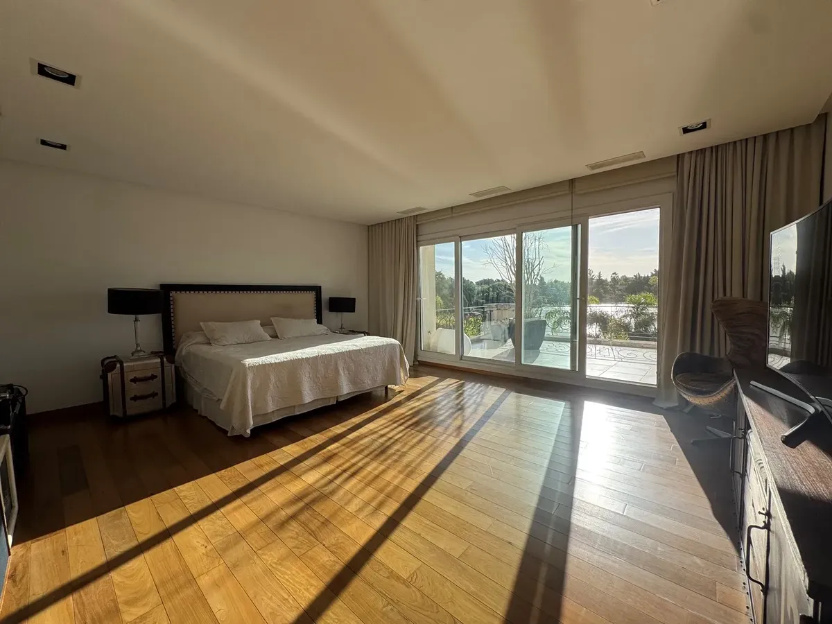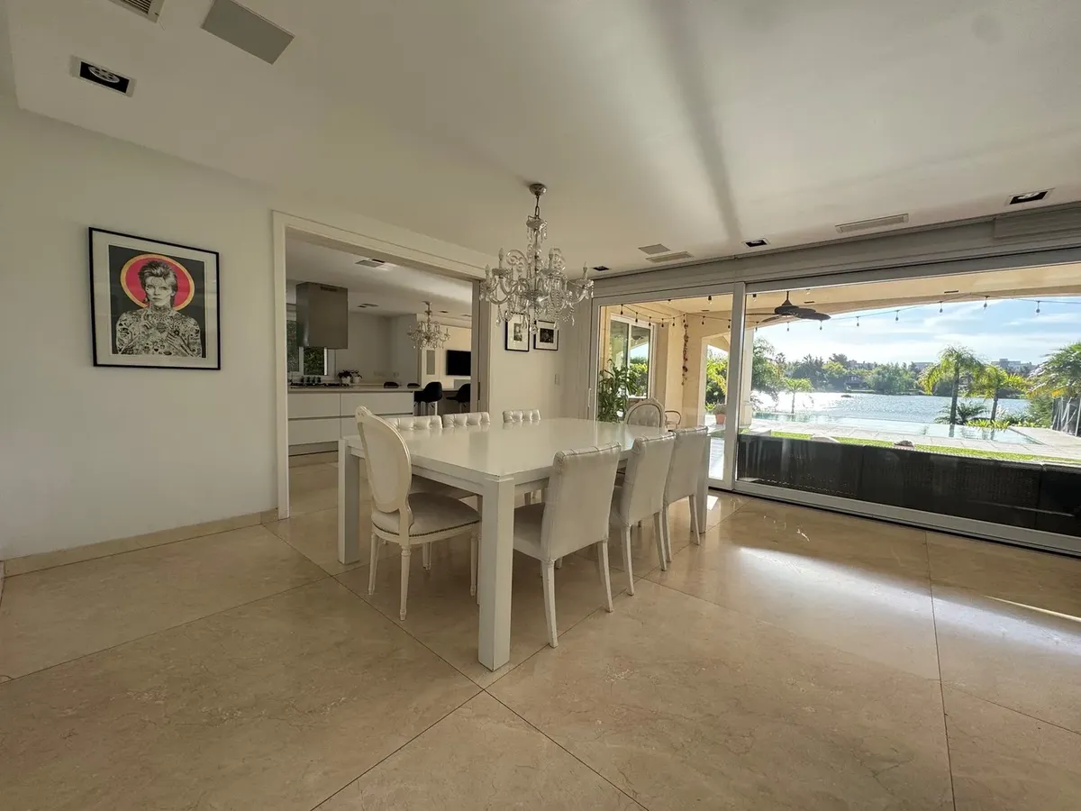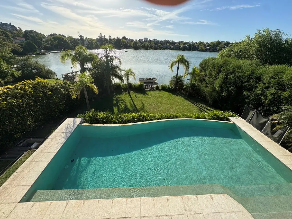Дом в аренду в Altamira, Rincón de Milberg, Tigre, на участке у лагуны. Два уровня; ориентация не указана. В планировке: 5 спален, основная suite с гардеробной, балконом в сторону сада и ванной с джакузи и двойным душем; на первом этаже гостиная-столовая с видом, большая кухня с островом и family, рабочий кабинет или playroom, гостевой туалет, ванная у бассейна, прачечная, служебная комната с ванной и отдельным входом. Есть собственный причал, бассейн, две крытые галереи, зона гриля с инокс-решё