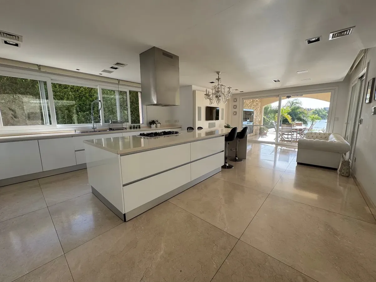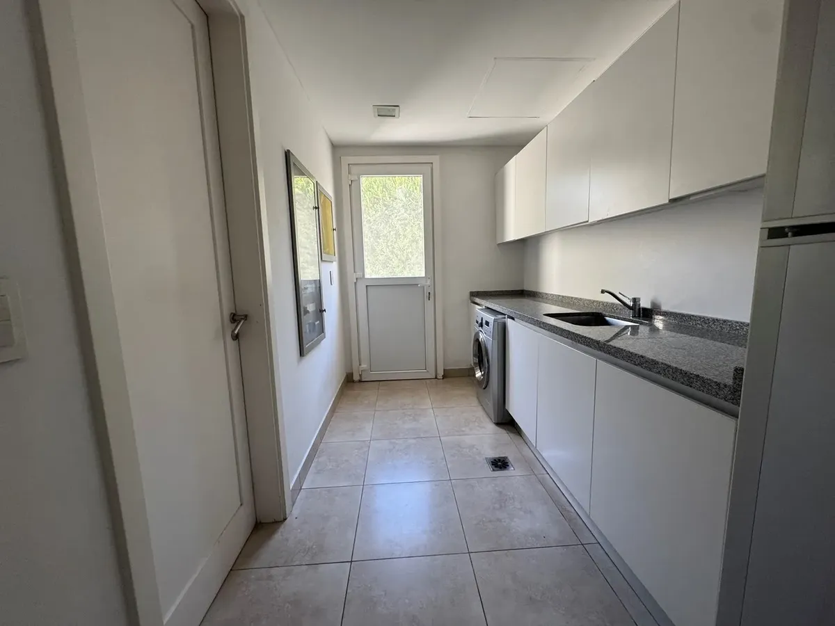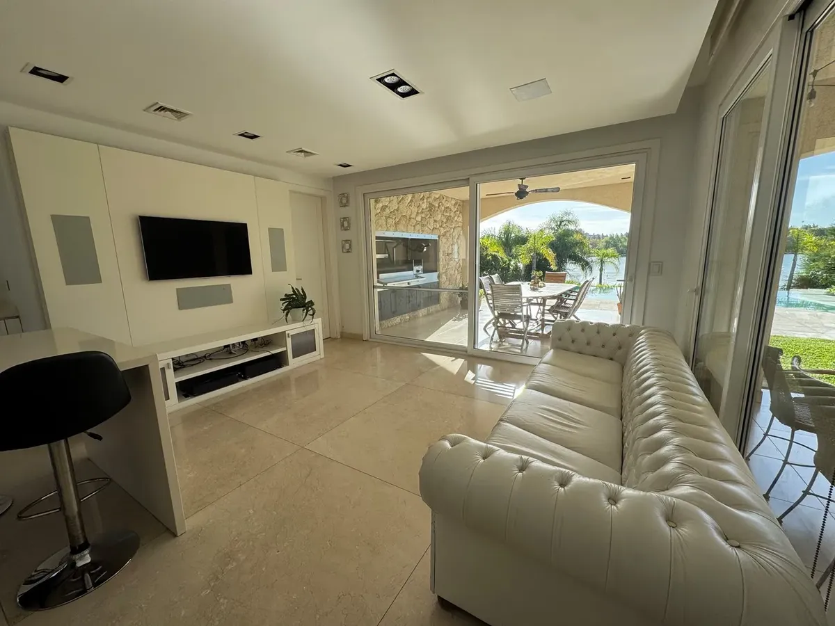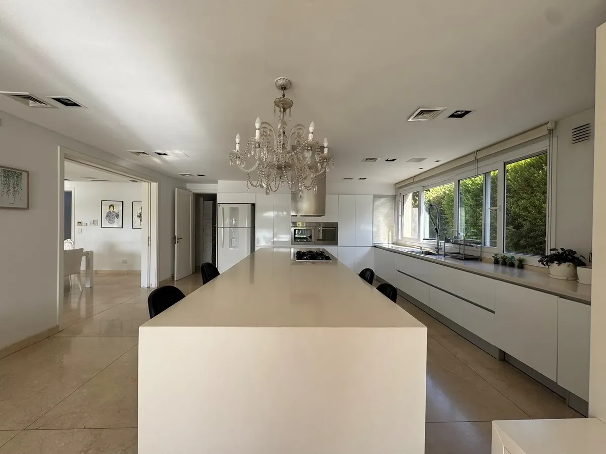 Дом в аренду в Altamira, Rincón de Milberg, Tigre, на участке у лагуны. Два уровня; ориентация не указана. В планировке: 5 спален, основная suite с гардеробной, балконом в сторону сада и ванной с джакузи и двойным душем; на первом этаже гостиная-столовая с видом, большая кухня с островом и family, рабочий кабинет или playroom, гостевой туалет, ванная у бассейна, прачечная, служебная комната с ванной и отдельным входом. Есть собственный причал, бассейн, две крытые галереи, зона гриля с инокс-решё
