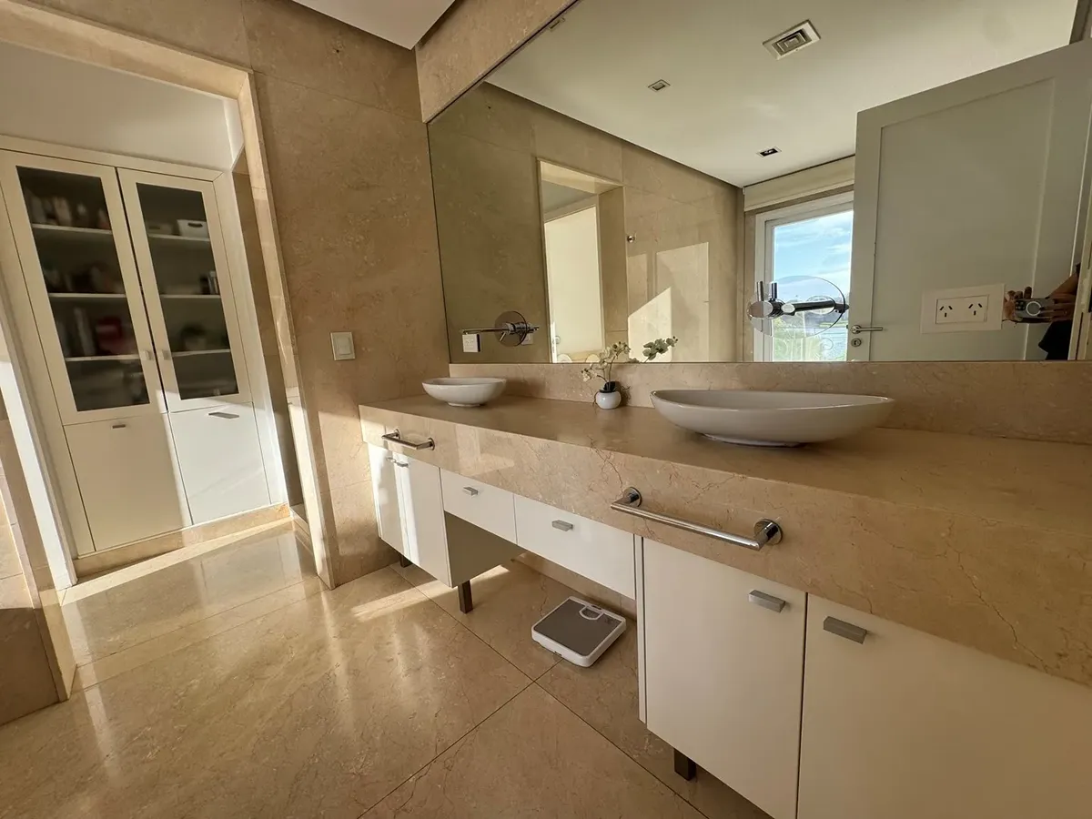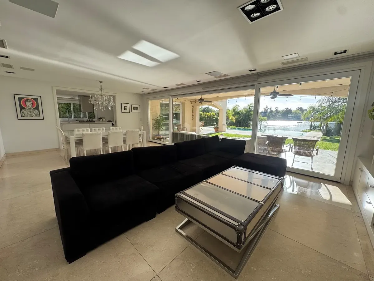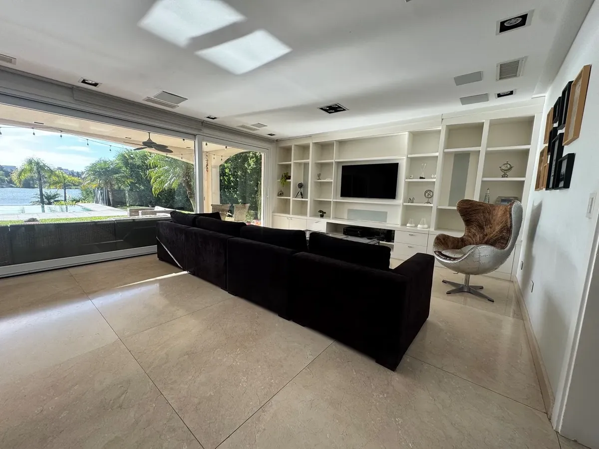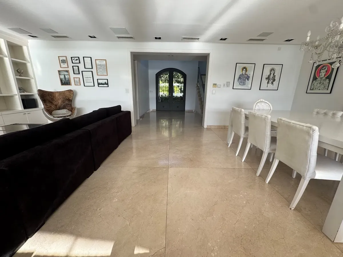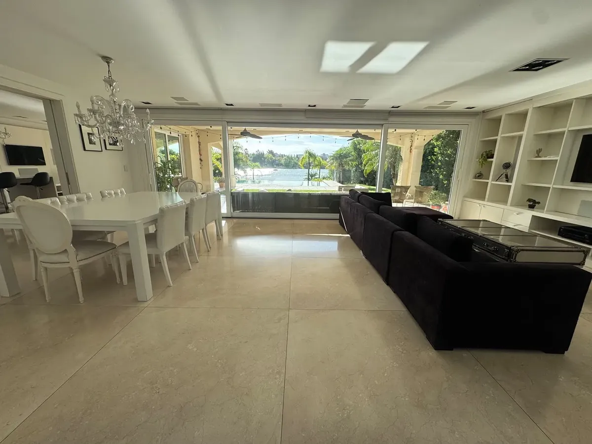 Дом в аренду в Altamira, Rincón de Milberg, Tigre, на участке у лагуны. Два уровня; ориентация не указана. В планировке: 5 спален, основная suite с гардеробной, балконом в сторону сада и ванной с джакузи и двойным душем; на первом этаже гостиная-столовая с видом, большая кухня с островом и family, рабочий кабинет или playroom, гостевой туалет, ванная у бассейна, прачечная, служебная комната с ванной и отдельным входом. Есть собственный причал, бассейн, две крытые галереи, зона гриля с инокс-решё