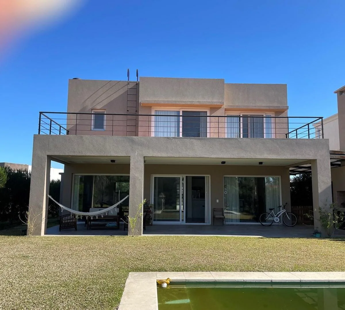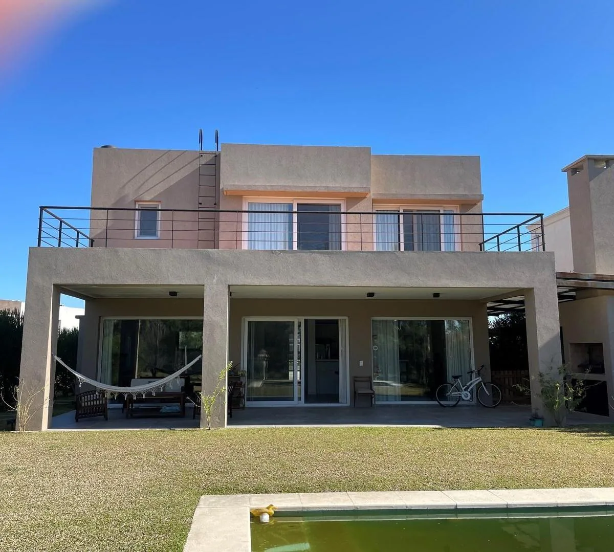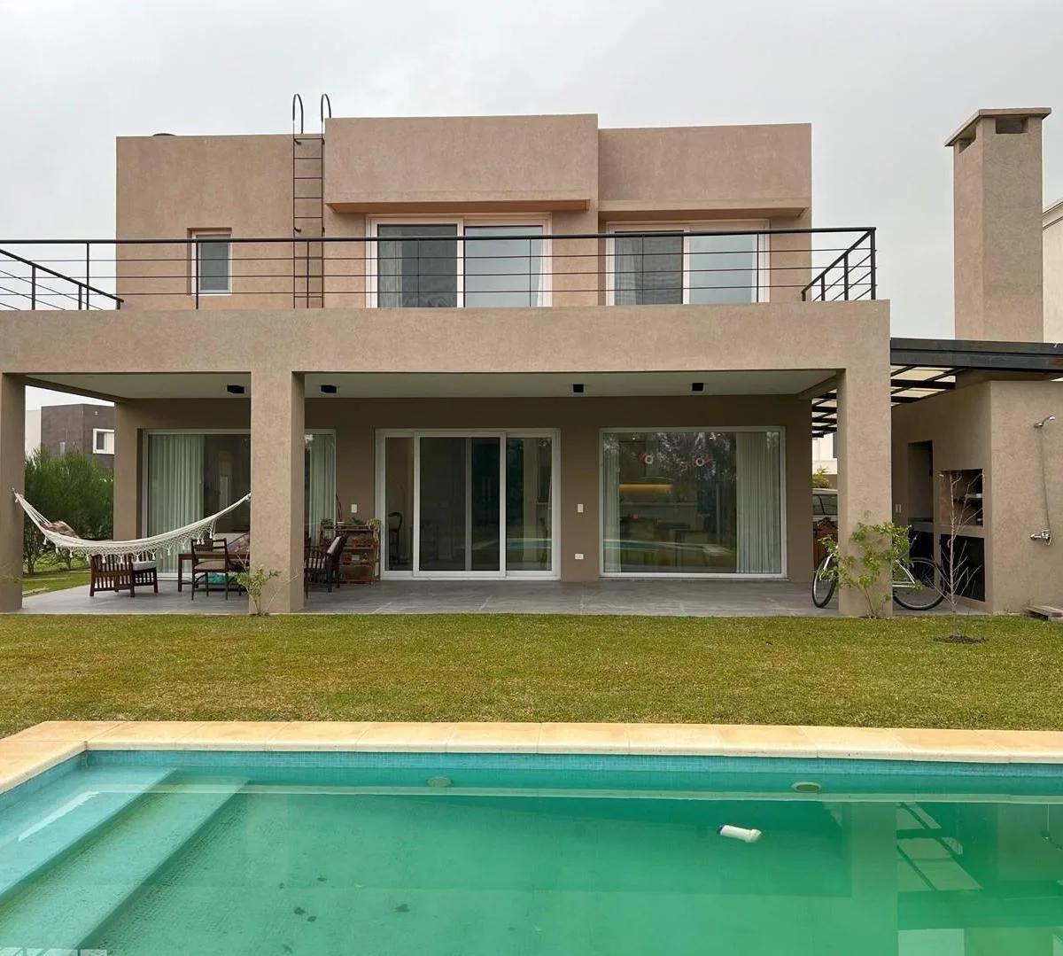 Дом в аренду в Barrio Los Castaños, Nordelta, Tigre. Площадь и состав по m² не указаны. Двухэтажный дом включает просторную гостиную-столовую с интегрированной кухней, гостевой туалет с душем, TV-зону/игровую комнату или 5-е спальню, а также здание для прислуги с собственной ванной и отдельную прачечную. На втором этаже: главная спальня en suite с гардеробной и выходом на большую террасу, 2 спальни в полу-сьюте, 1 junior suite и зона отдыха/игровая или кабинет. Внешняя часть: крытая пергола для
