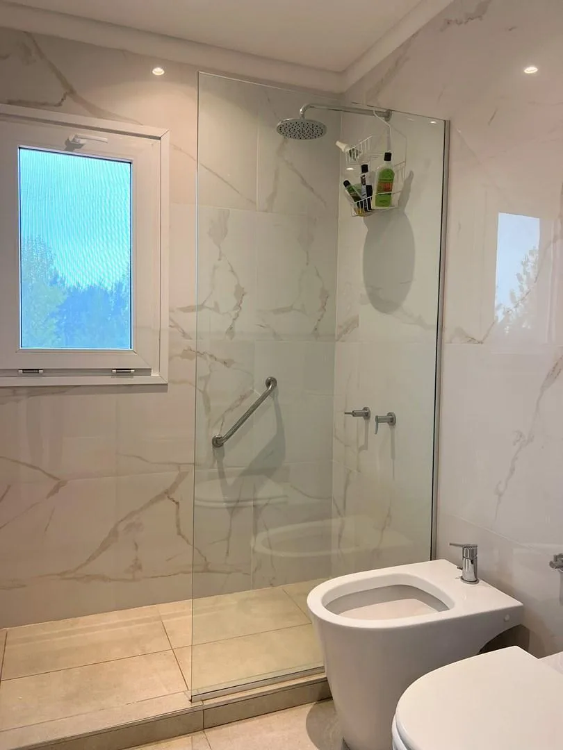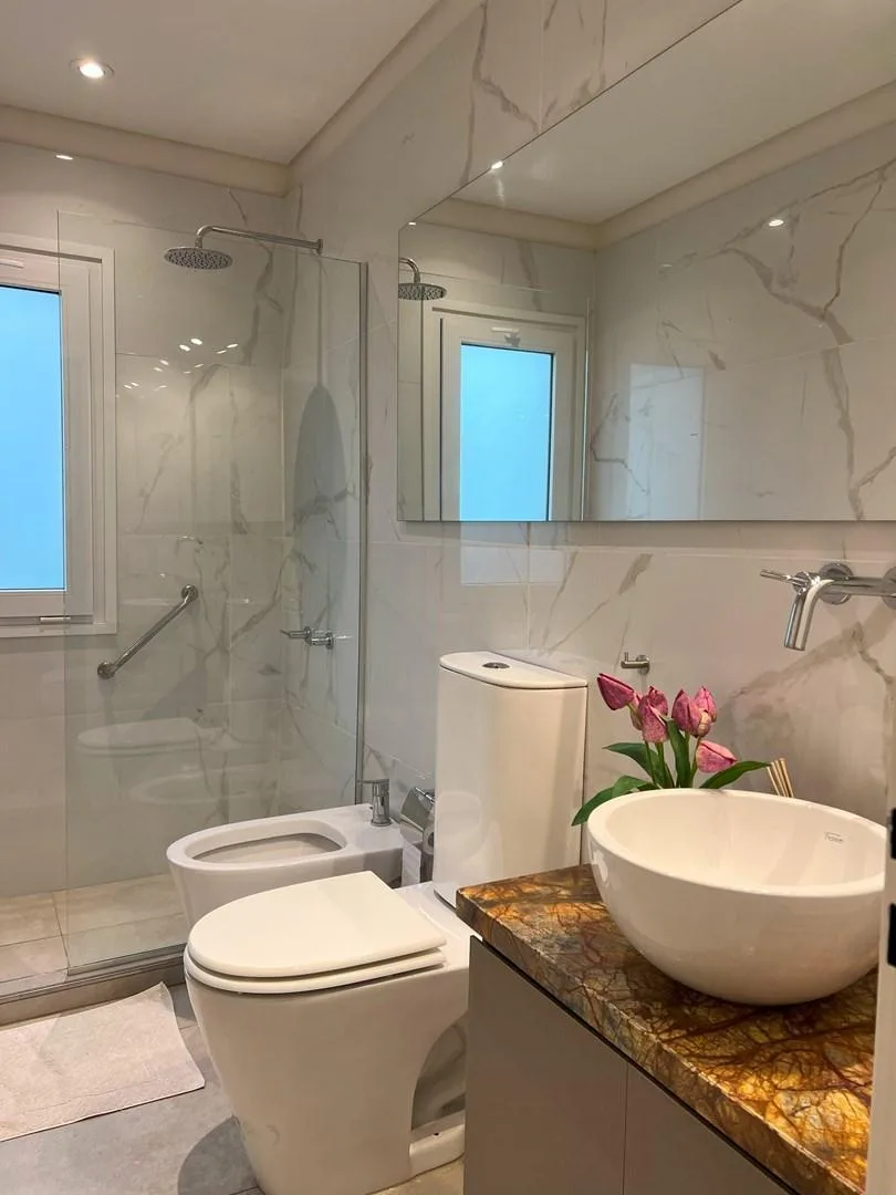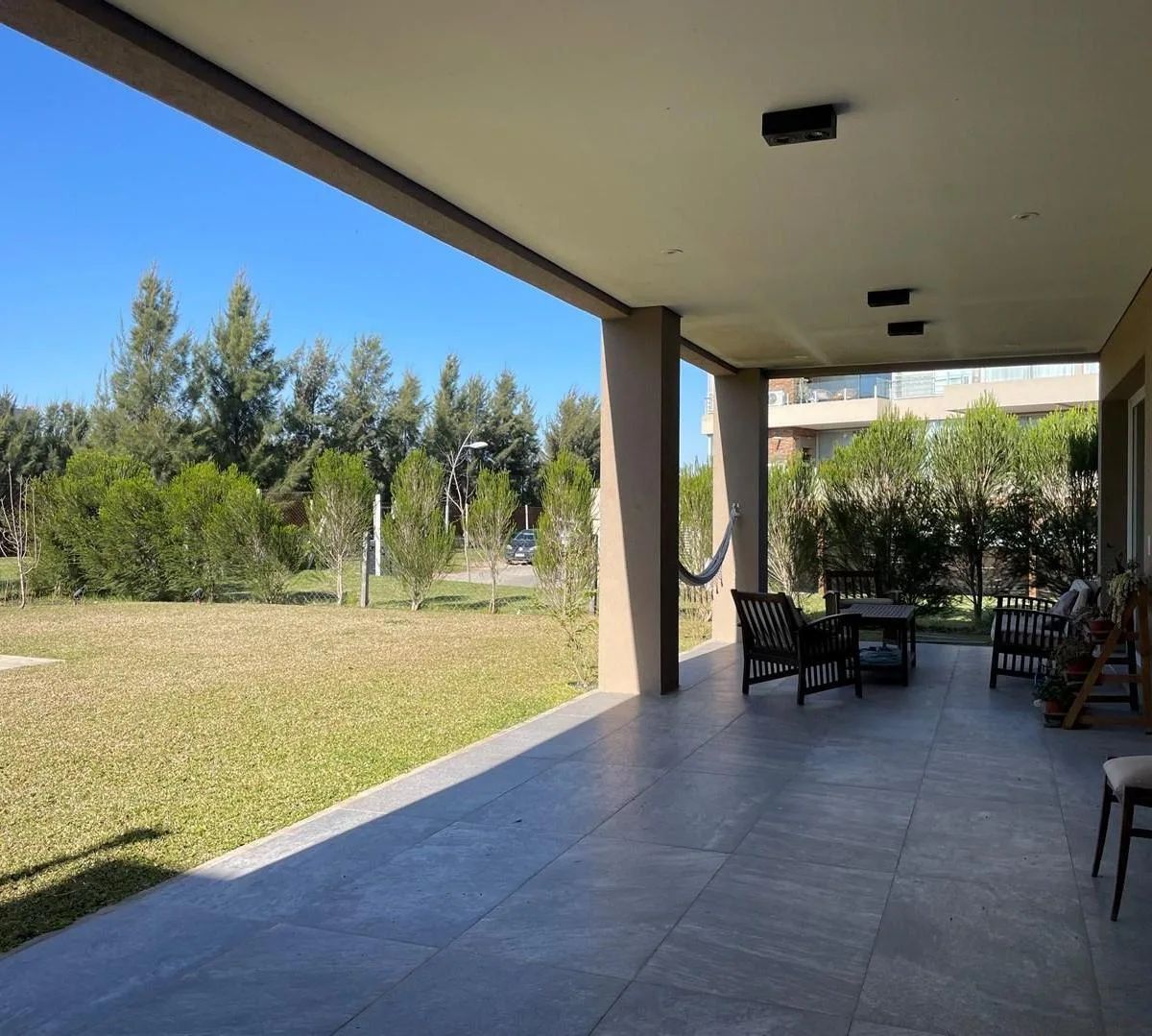 Дом в аренду в Barrio Los Castaños, Nordelta, Tigre. Площадь и состав по m² не указаны. Двухэтажный дом включает просторную гостиную-столовую с интегрированной кухней, гостевой туалет с душем, TV-зону/игровую комнату или 5-е спальню, а также здание для прислуги с собственной ванной и отдельную прачечную. На втором этаже: главная спальня en suite с гардеробной и выходом на большую террасу, 2 спальни в полу-сьюте, 1 junior suite и зона отдыха/игровая или кабинет. Внешняя часть: крытая пергола для
