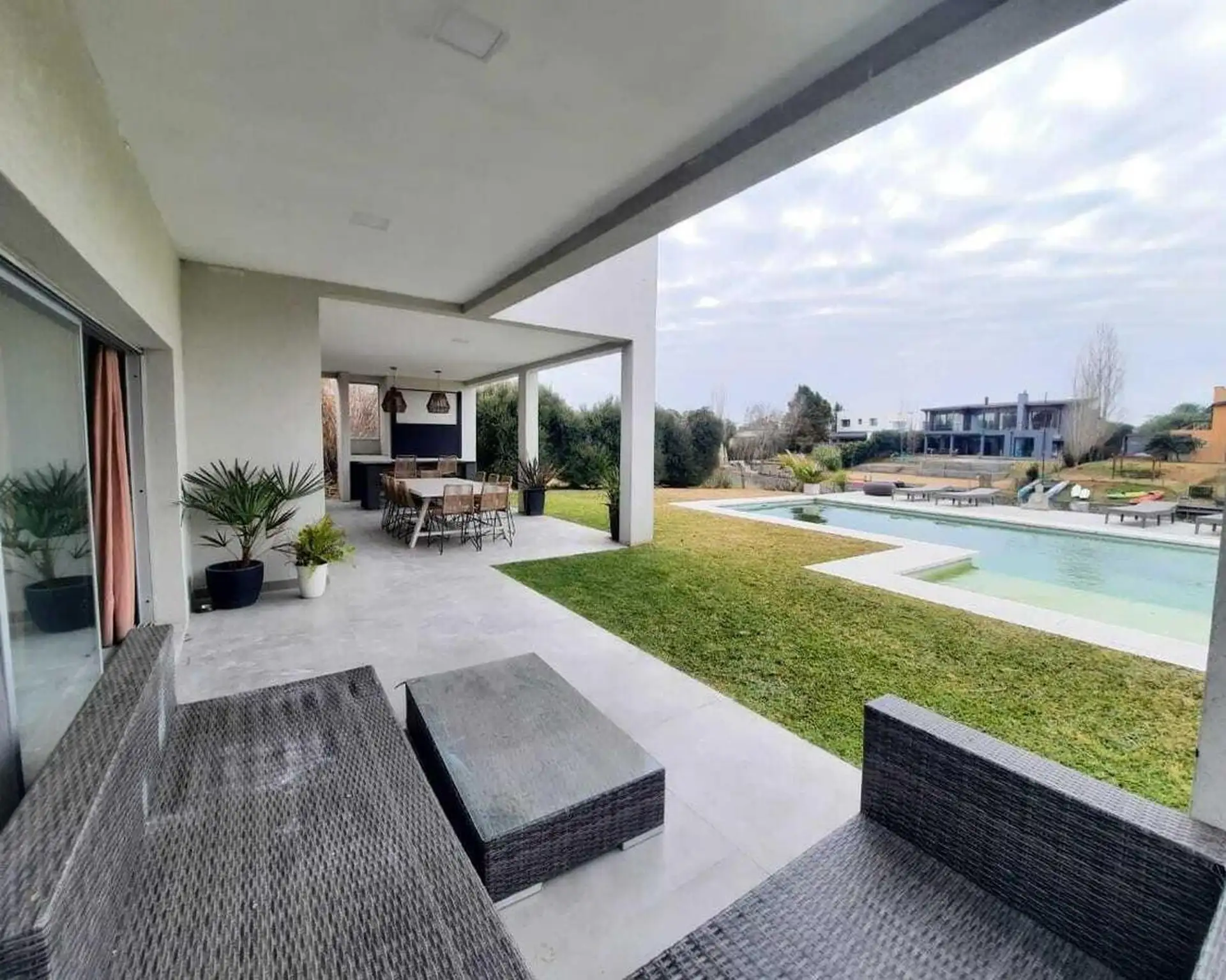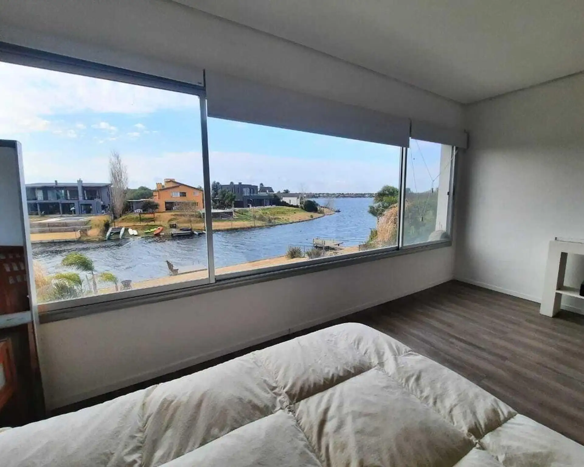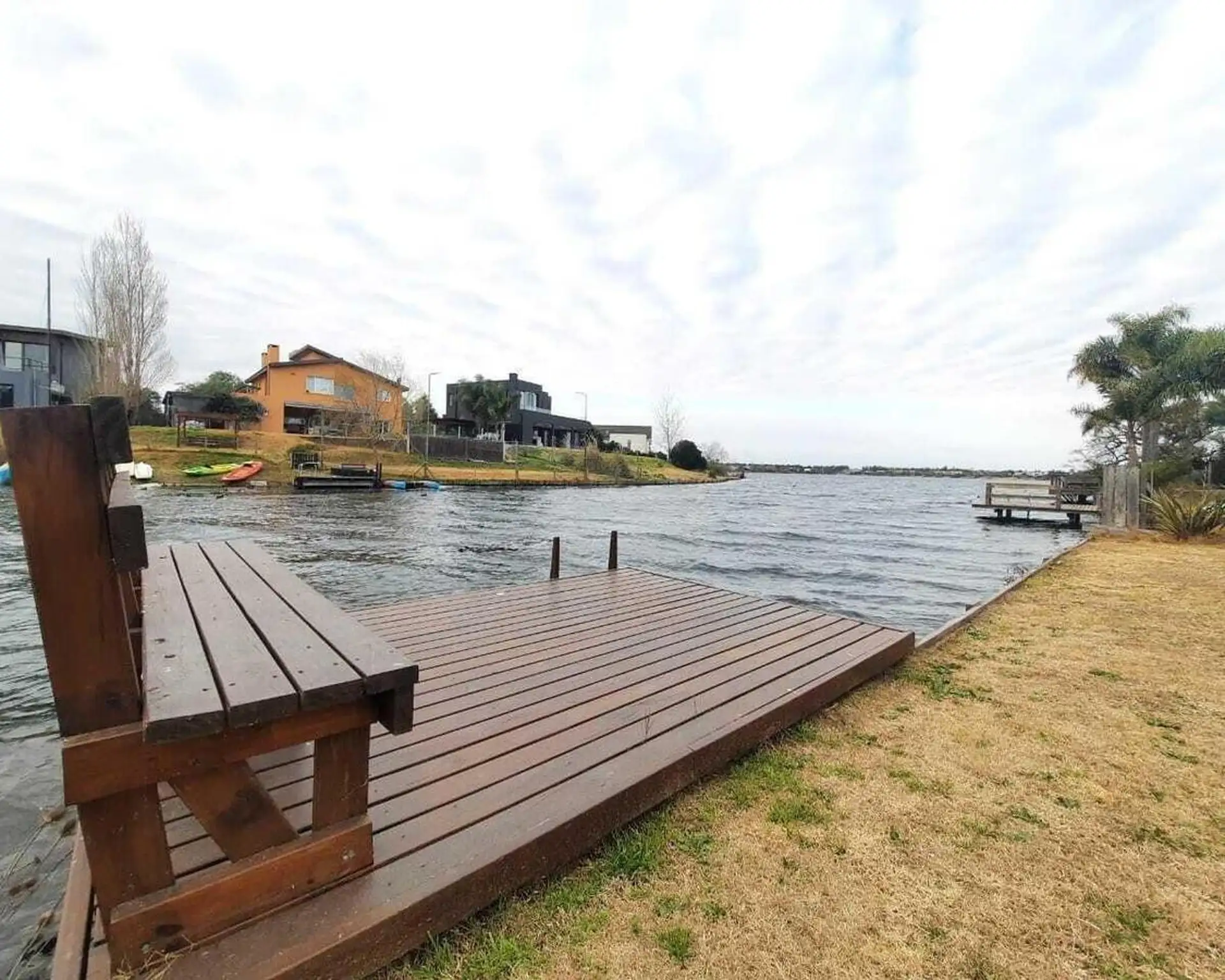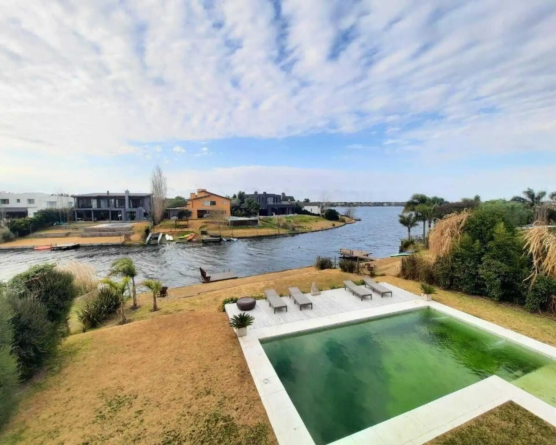 Дом в Santa Clara в Tigre, на 2 этажах. На первом этаже гостиная и обеденная зона с высокими потолками, гостевой туалет, обеденная зона с видом на сад и отдельная зона living с видом на лагуну; кухня с мебелью нижнего и верхнего яруса и центральным островом, большая комната для прислуги с ванной и отдельной прачечной, а также спальня или кабинет. На втором этаже 3 спальни, одна из них с ванной (suite) и видом на лагуну, отдельная ванная для двух других, гардероб, зона сауны. На улице полукрытая