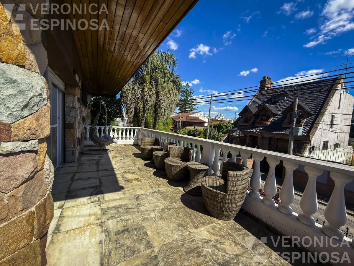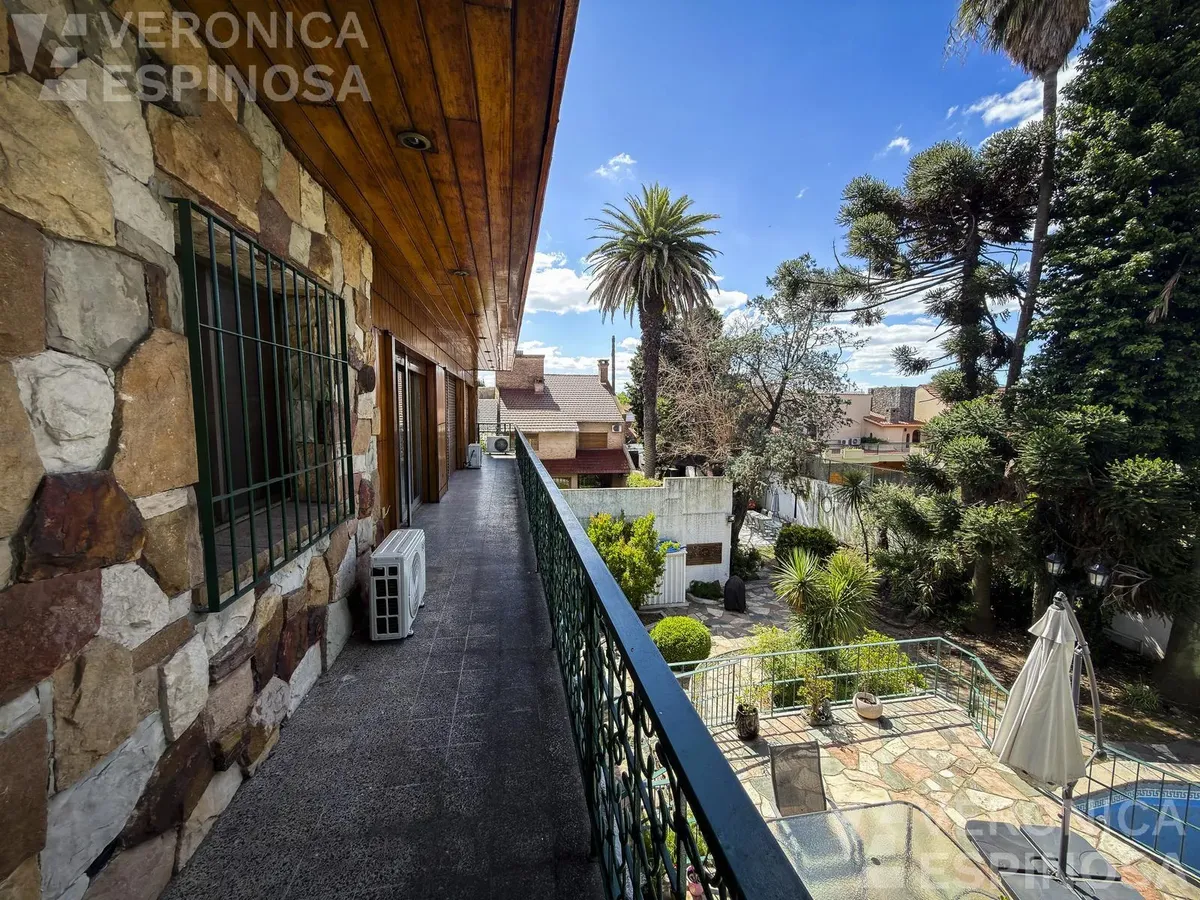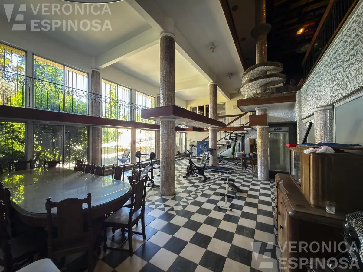 Резиденция в Villa Sarmiento в Morón, на двух участках с двойным въездом (Córdova и Pedro Castelli). В доме более 1.000 m² крытых помещений, 6+ спален, 2 гостиные, столовая-кухня с выходом в парк. В главном люксе есть гардеробная, ванная и балкон; всего 6 ванных комнат (включая туалеты). Также предусмотрены тренажёрный зал, прачечная и отдельное помещение для глажки, балконы-террасы с видом на парк, места для нескольких автомобилей с автоматизированным доступом. На территории: бассейн, зона грил