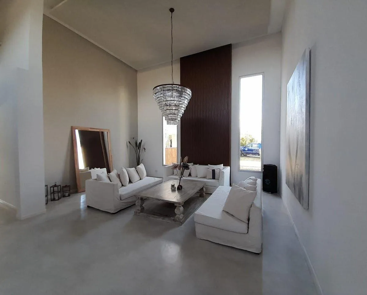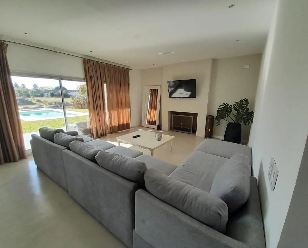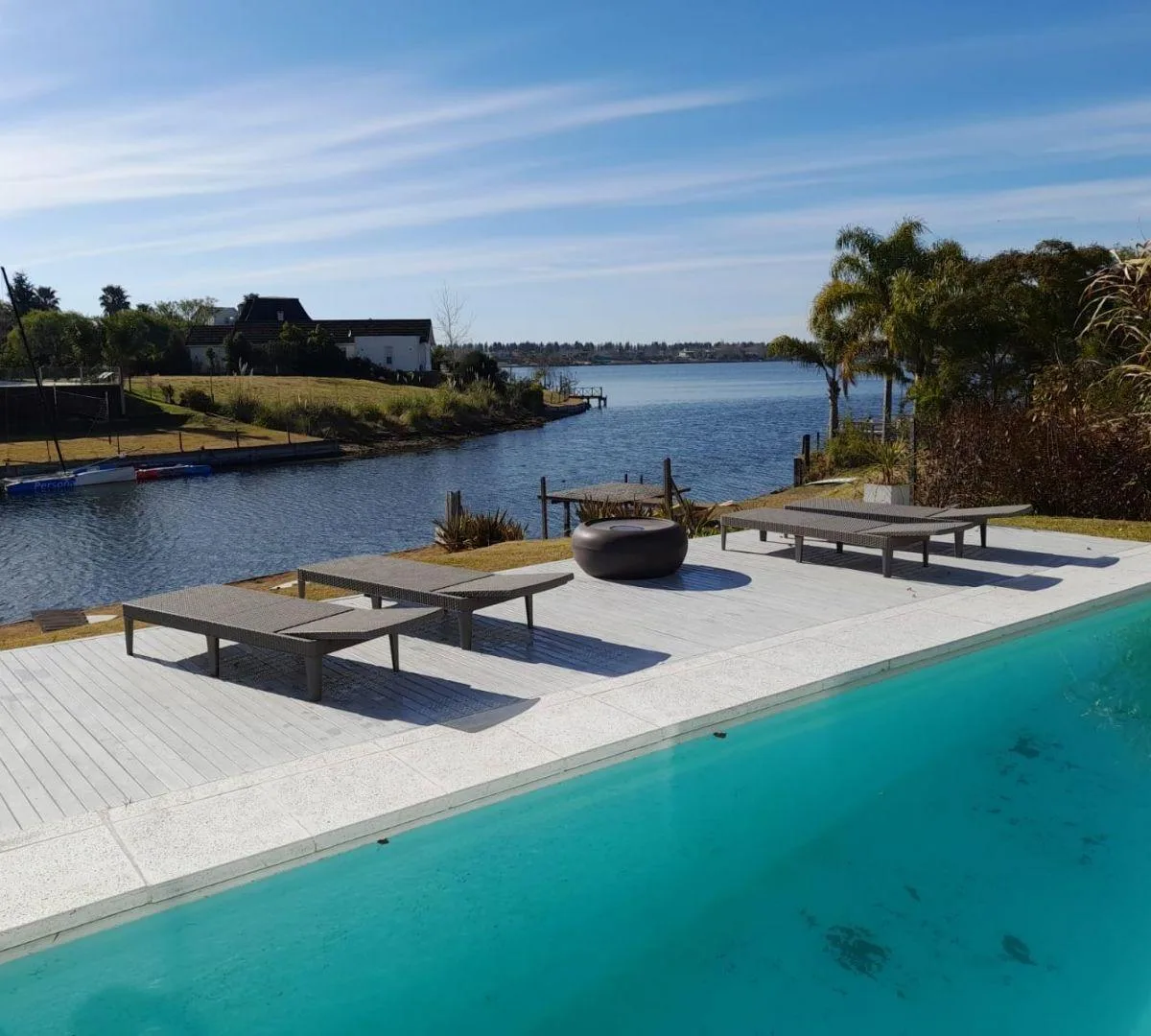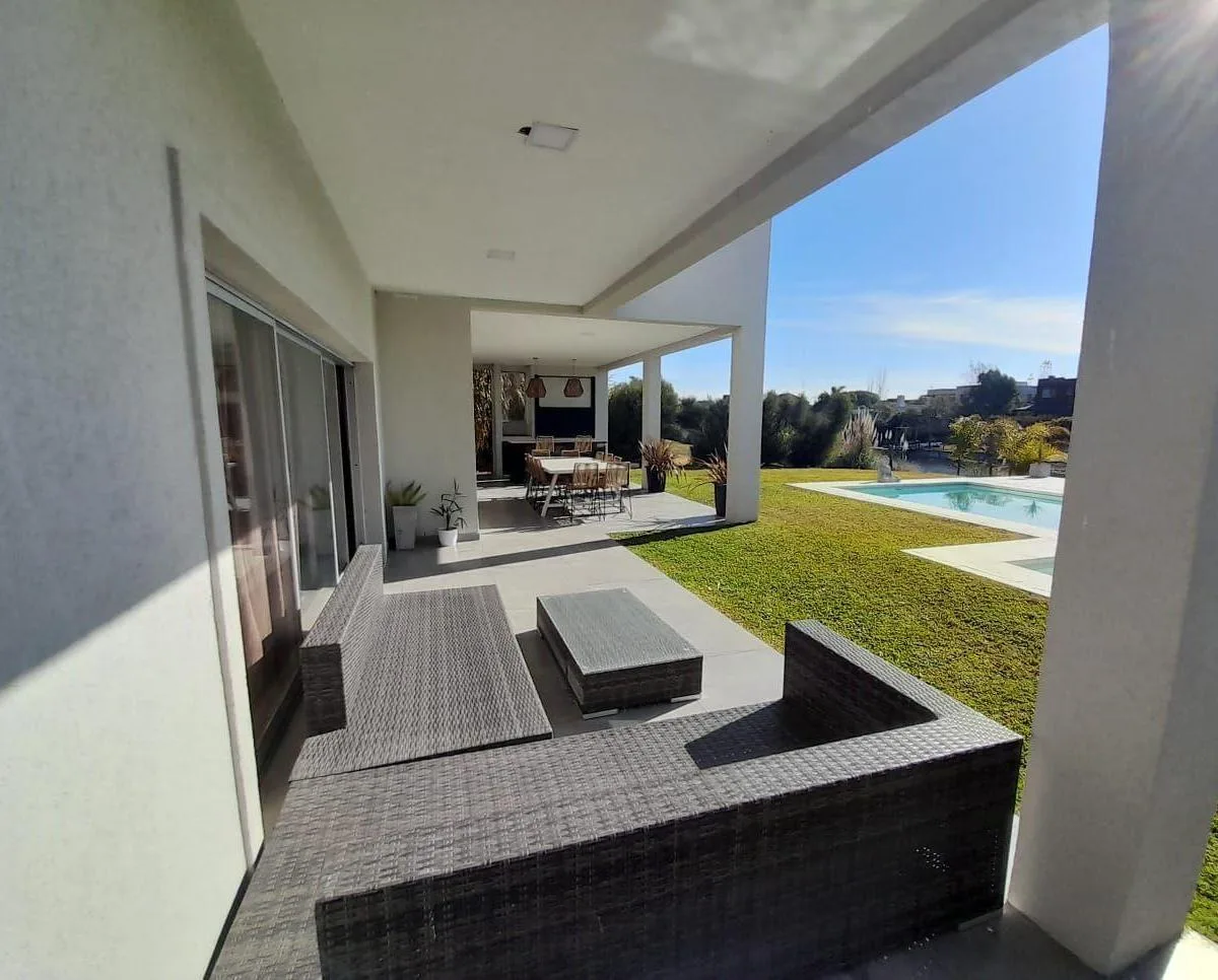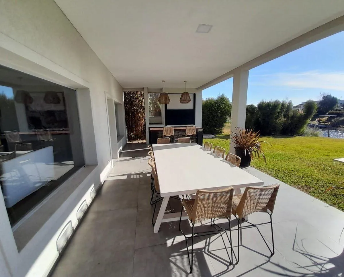 Дом в Santa Clara (Villanueva) в Tigre на 2 уровнях: 6 спален. На первом этаже кухня с обеденной зоной, гостиная-столовая с двойной высотой, гостевой туалет, сауна, постирочная и подсобное помещение под 4-ю спальню. Также предусмотрены кабинет или 5-я спальня, широкая галерея с уличной мебелью и зоной гриля, а в саду установлены парковка и система полива. На втором этаже 3 спальни, главная со своей ванной комнатой; две остальные спальни делят одну общую ванную. Есть бассейн и пирс, двойное (закр