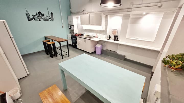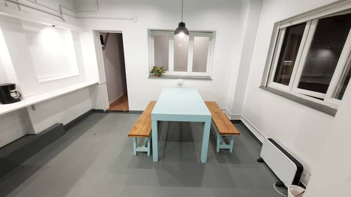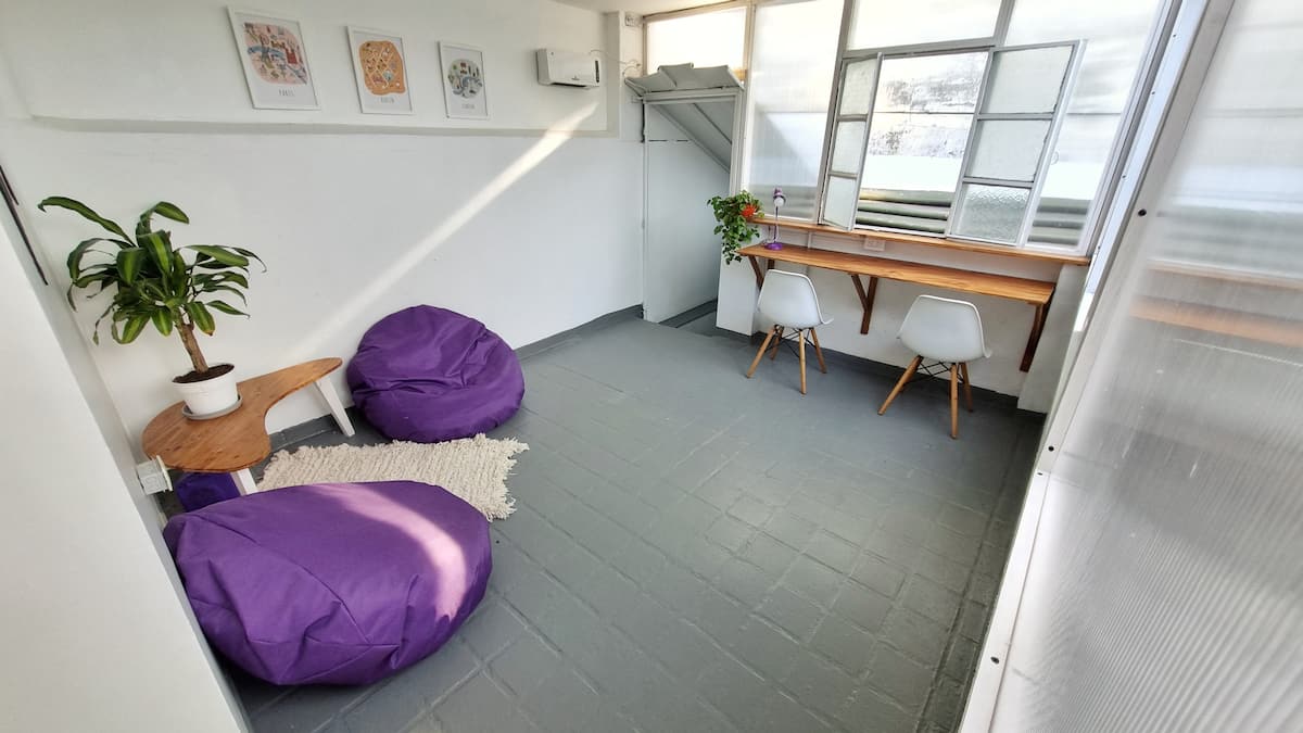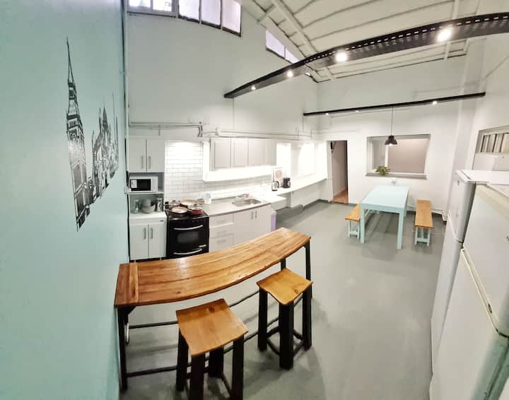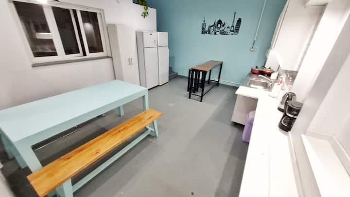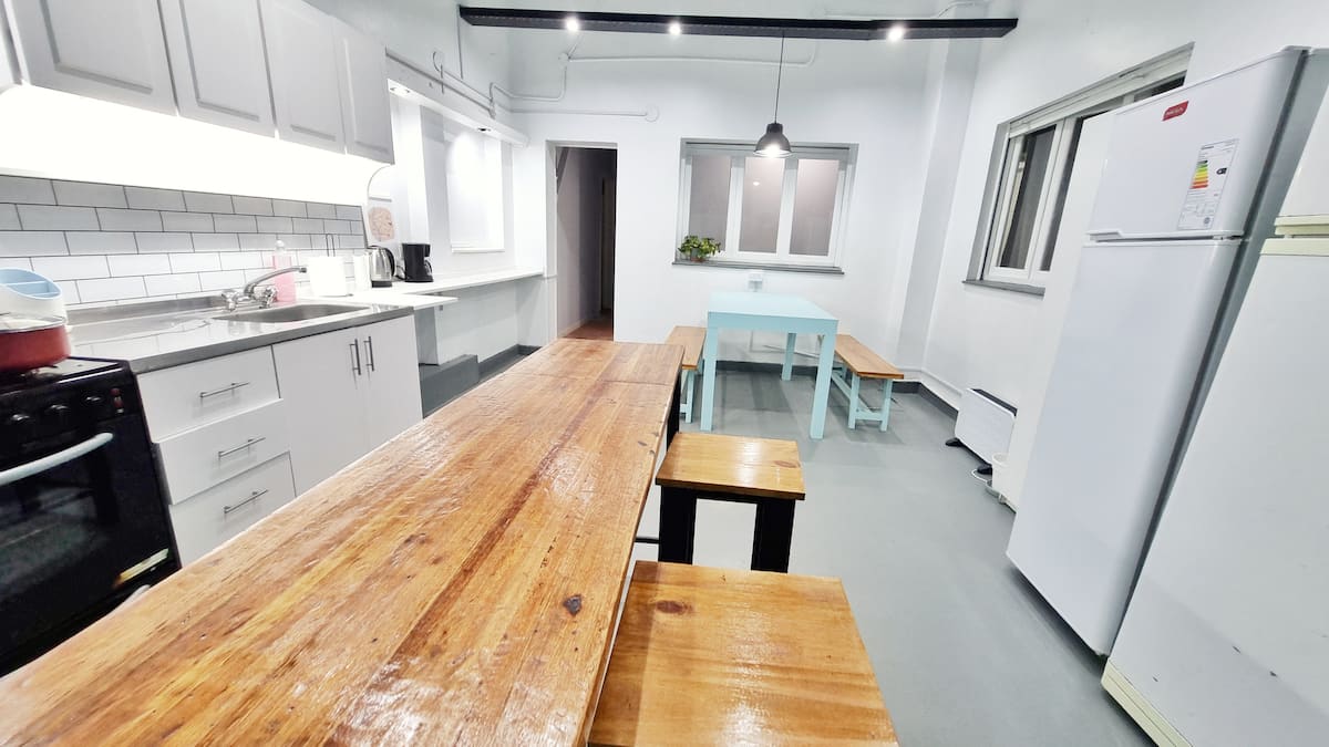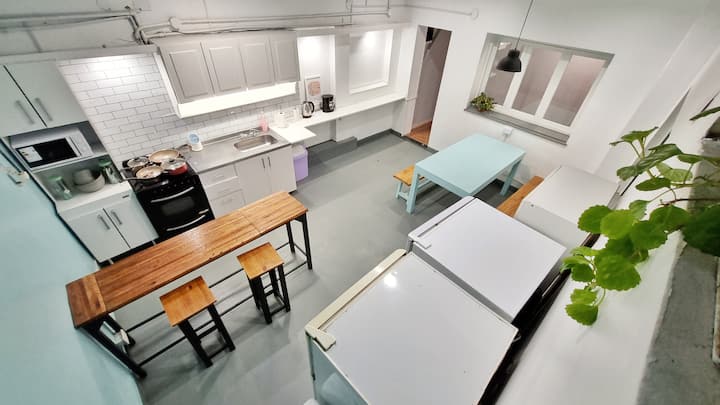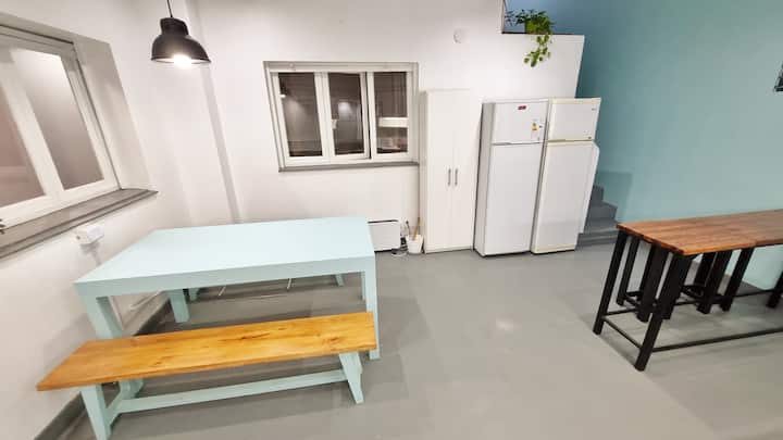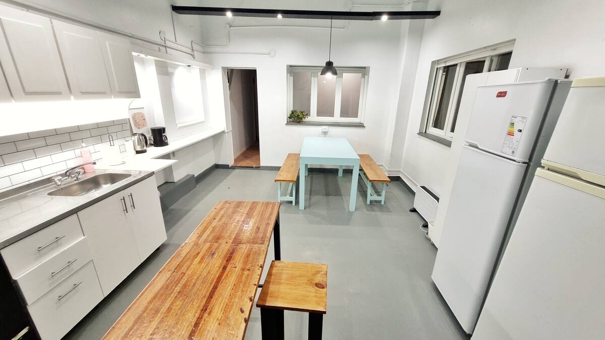 Дом с 7 приватными комнатами: в каждой установлены двуспальная кровать, шкаф, рабочий стол со стулом, вентилятор и отопление. Пять комнат имеют отдельные полные ванные комнаты, ещё одна ванная комната общая. Есть обеденная зона и полностью оборудованная кухня с 2 холодильниками, духовкой, микроволновой печью, стиральной машиной и кухонной утварью, а также холодильник(и) на кухне. На территории дома есть терраса с столами и зоной гриля; на цокольном этаже размещены 2 комнаты с дворовыми окнами и