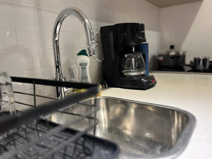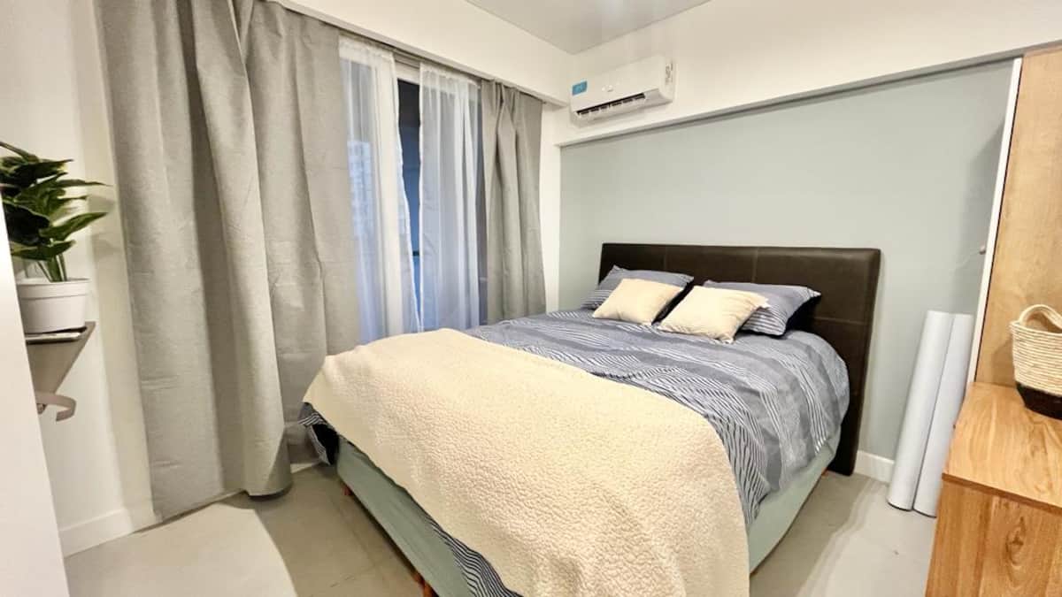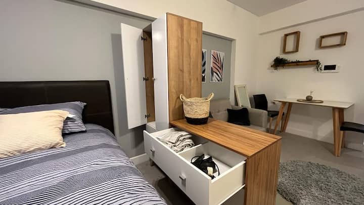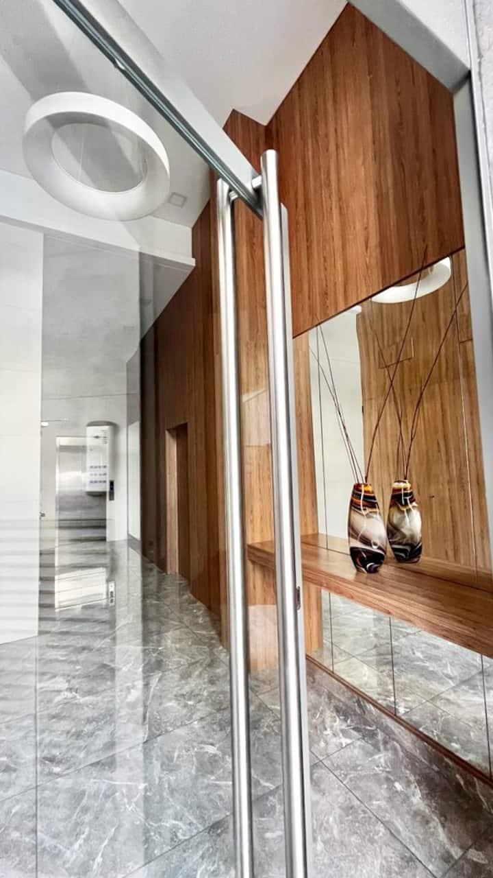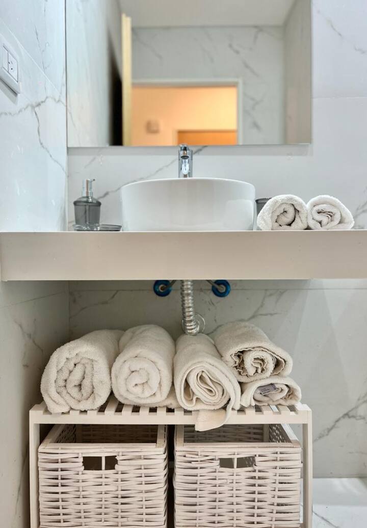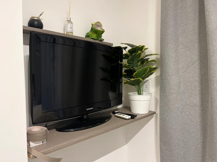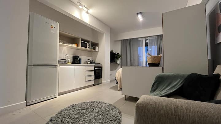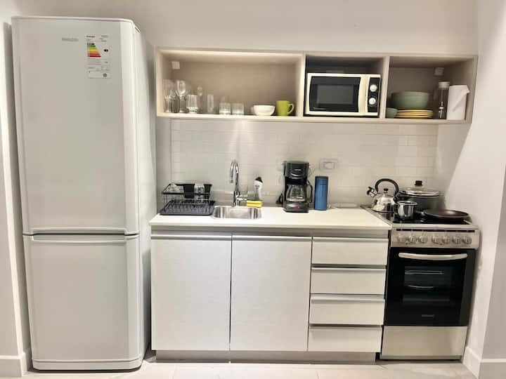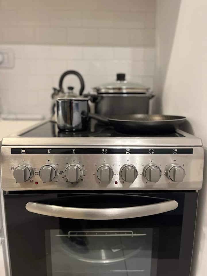 Квартира-студия рассчитана на 2–3 человека. Кровать размера queen и диван-кровать на 1 человека. Есть полностью оборудованная кухня с электроплитой, электрической духовкой Ariston, холодильником с морозильной камерой, микроволновой печью, кофеваркой, электрочайником, тостером и посудой. В квартире установлены кондиционер (холод/тепло), Wi‑Fi и кабельное телевидение.