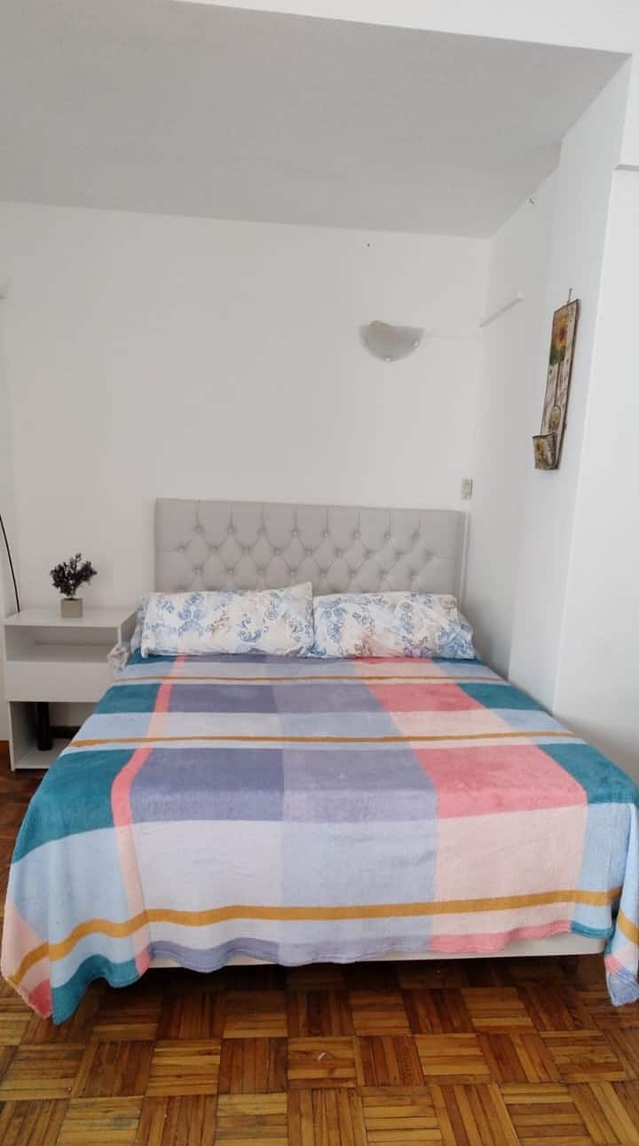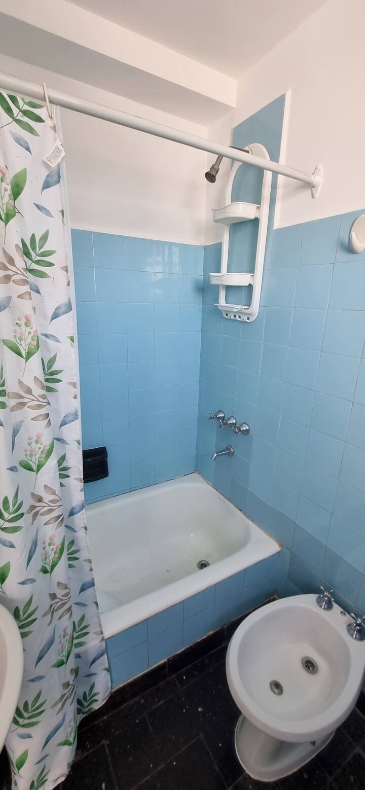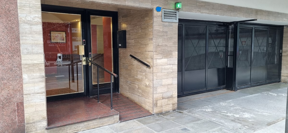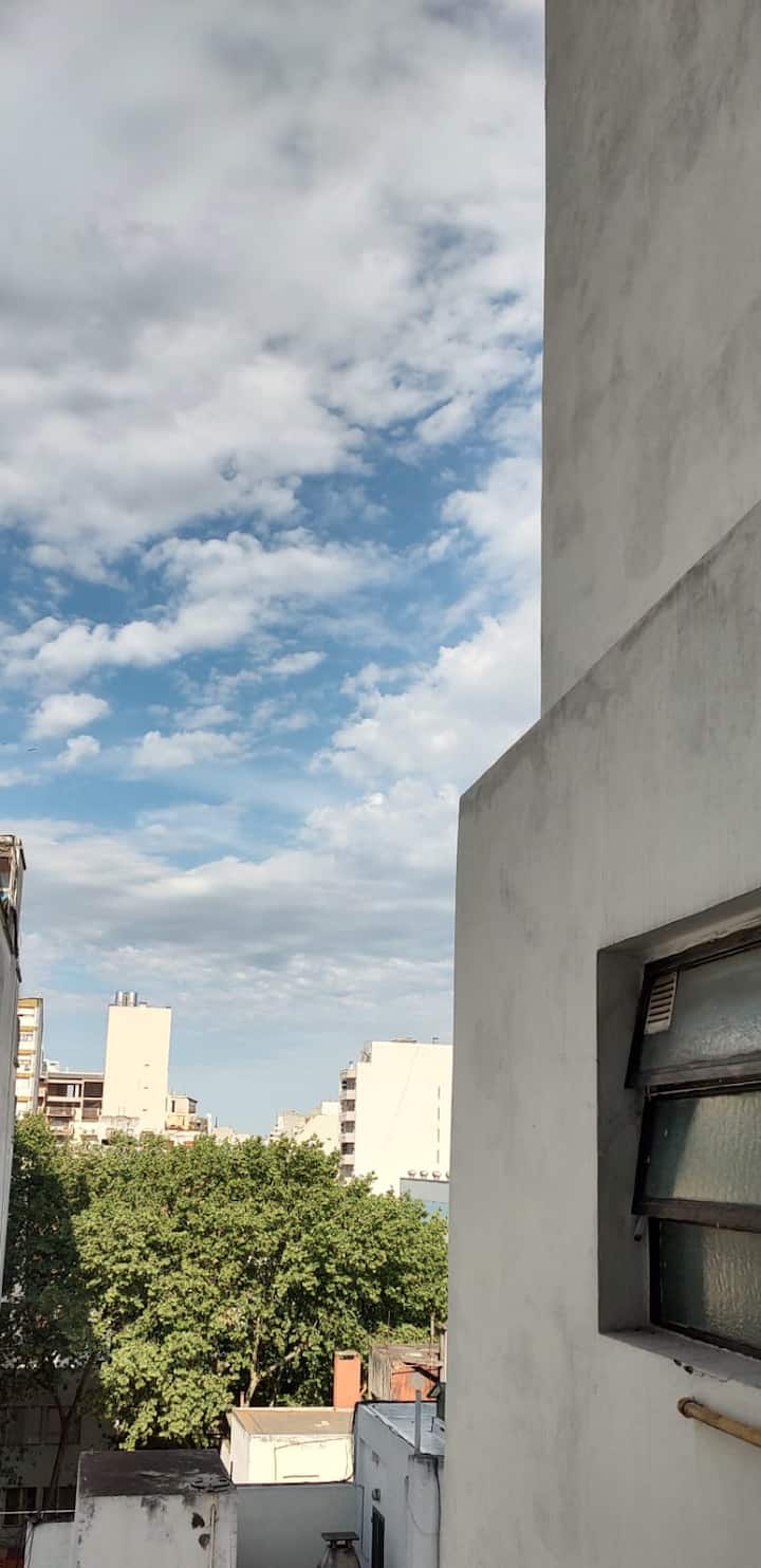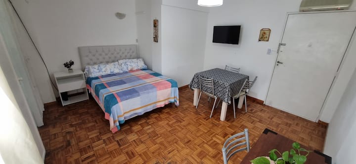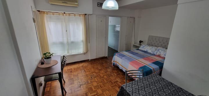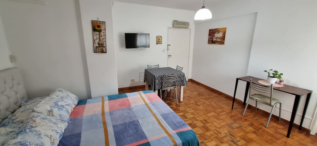 Меблированная квартира-студия в Almagro, сторона дома с окнами во двор. В помещении установлены кондиционер холод/тепло, обогреватель, Wi‑Fi (iPlan 300 Mb) и Smart TV. В комнате есть двуспальная кровать, стол на 4 места, небольшой рабочий стол и 2 больших встроенных/гардеробных шкафа. Отдельная кухня с холодильником, газовой плитой и стиральной машиной. Горячая вода от газового водонагревателя. В ванной с ванной предусмотрены полотенца и постельное бельё. Уборка проводится по окончании проживани