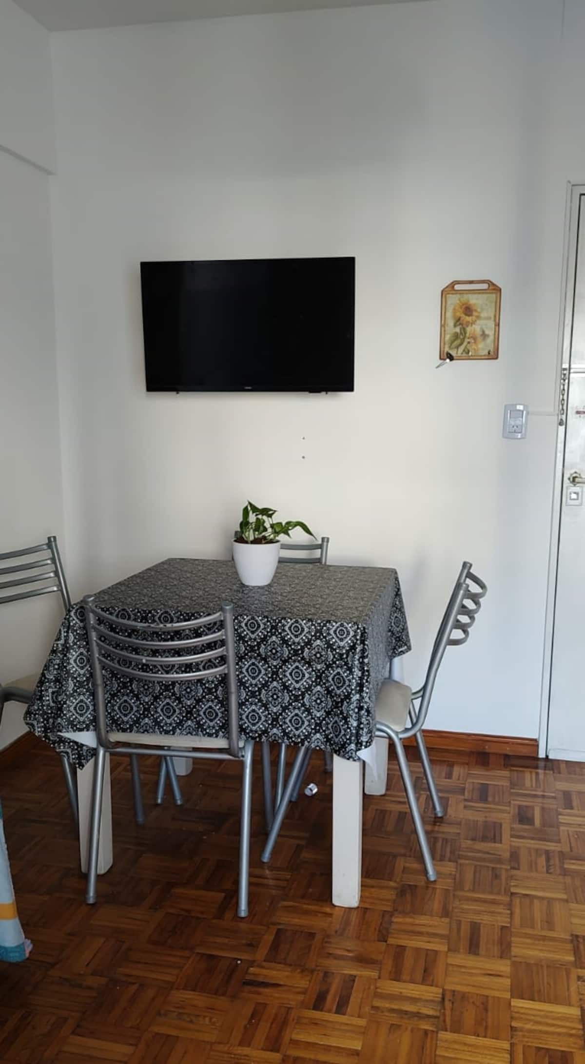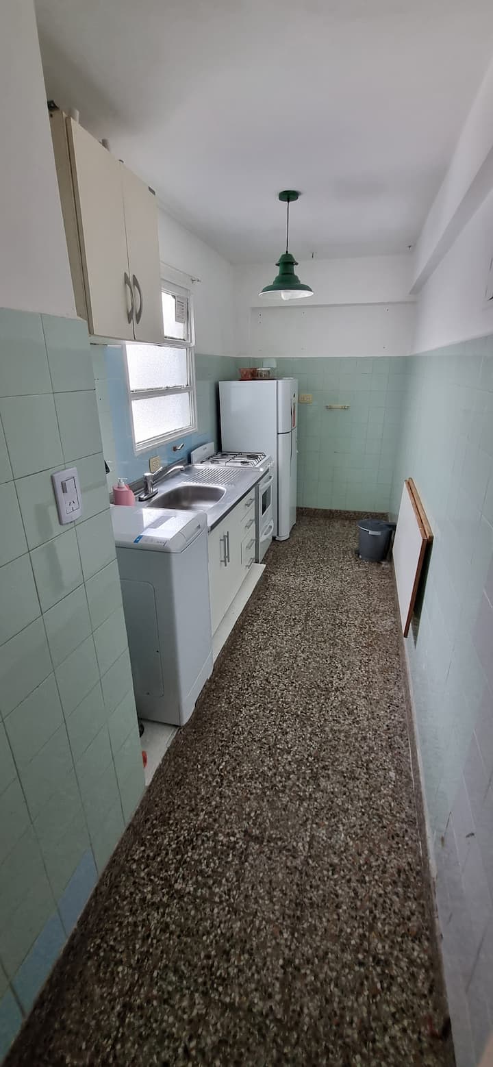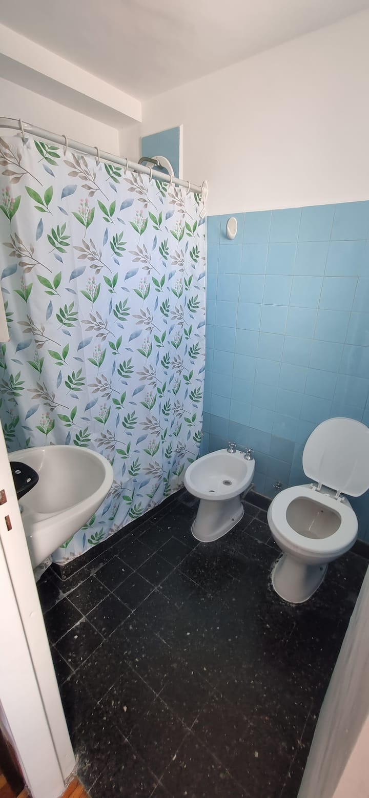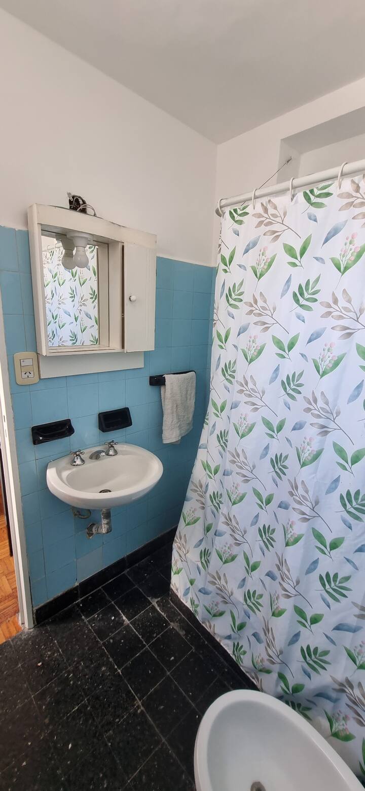 Меблированная квартира-студия в Almagro, сторона дома с окнами во двор. В помещении установлены кондиционер холод/тепло, обогреватель, Wi‑Fi (iPlan 300 Mb) и Smart TV. В комнате есть двуспальная кровать, стол на 4 места, небольшой рабочий стол и 2 больших встроенных/гардеробных шкафа. Отдельная кухня с холодильником, газовой плитой и стиральной машиной. Горячая вода от газового водонагревателя. В ванной с ванной предусмотрены полотенца и постельное бельё. Уборка проводится по окончании проживани