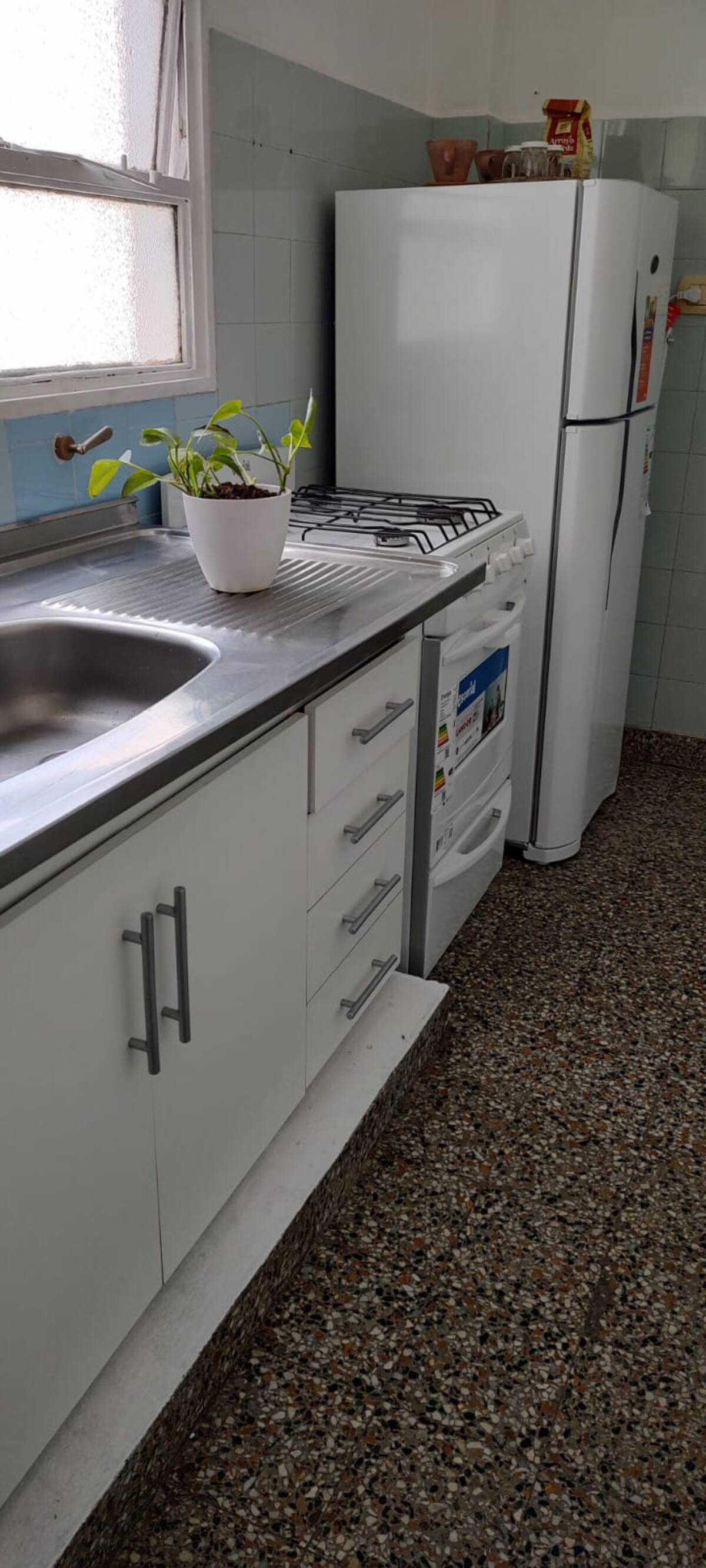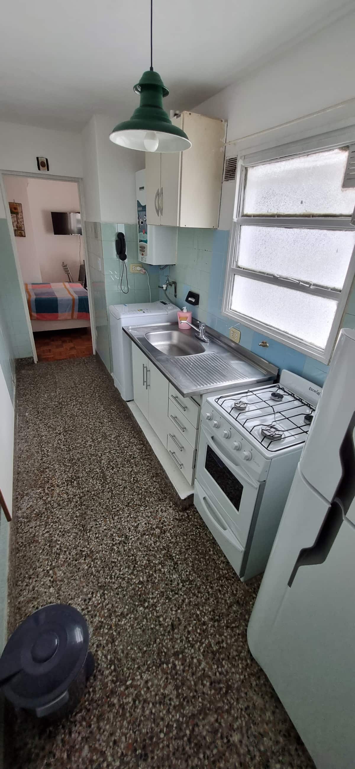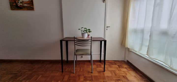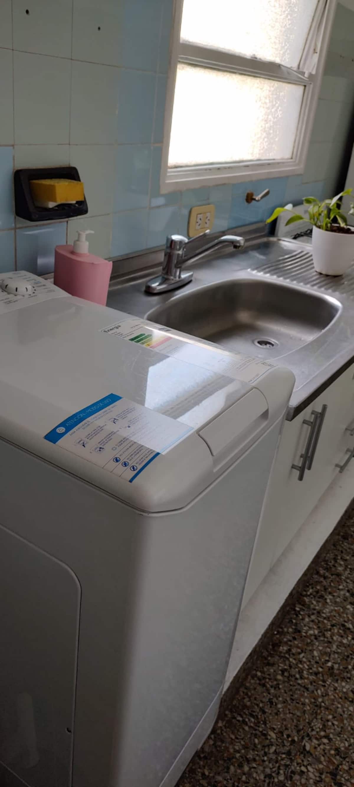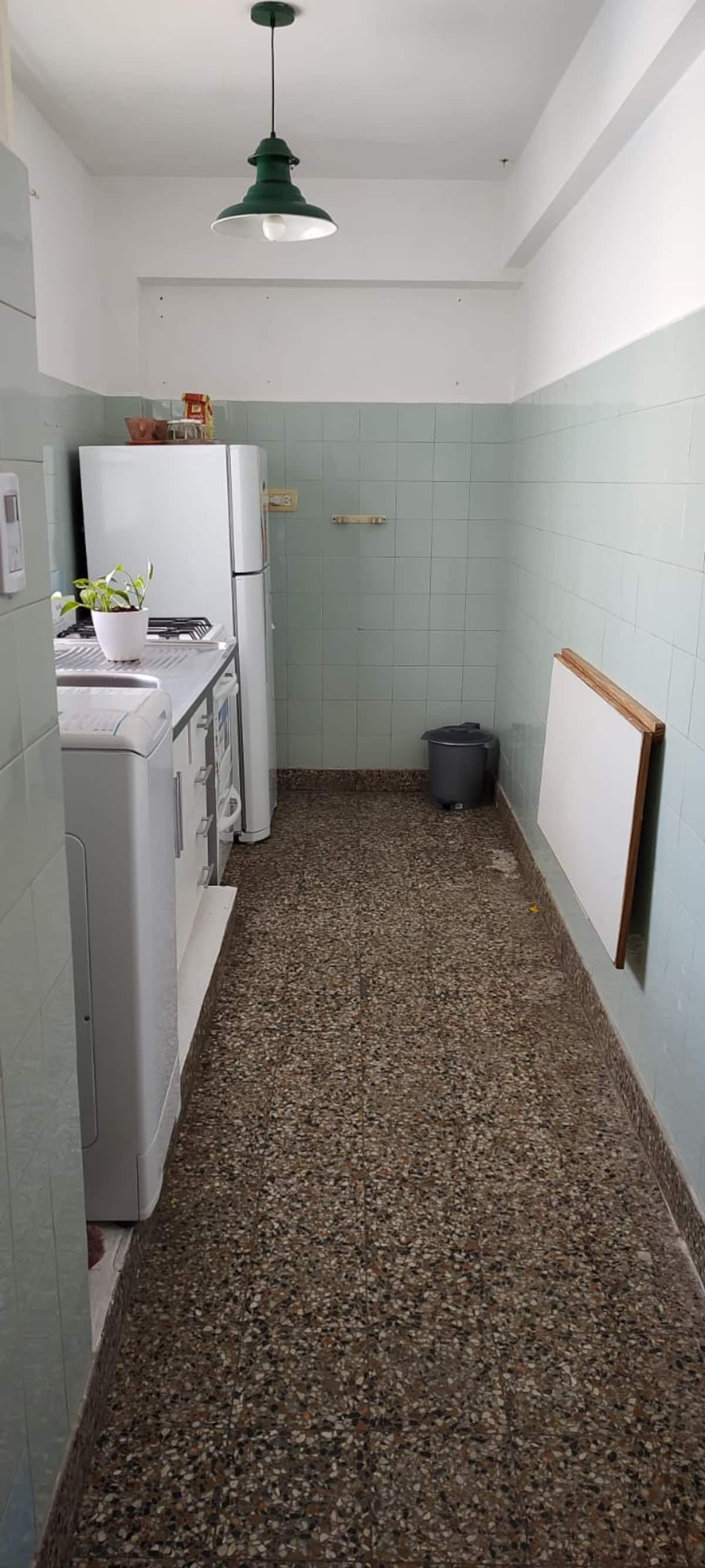 Меблированная квартира-студия в Almagro, сторона дома с окнами во двор. В помещении установлены кондиционер холод/тепло, обогреватель, Wi‑Fi (iPlan 300 Mb) и Smart TV. В комнате есть двуспальная кровать, стол на 4 места, небольшой рабочий стол и 2 больших встроенных/гардеробных шкафа. Отдельная кухня с холодильником, газовой плитой и стиральной машиной. Горячая вода от газового водонагревателя. В ванной с ванной предусмотрены полотенца и постельное бельё. Уборка проводится по окончании проживани