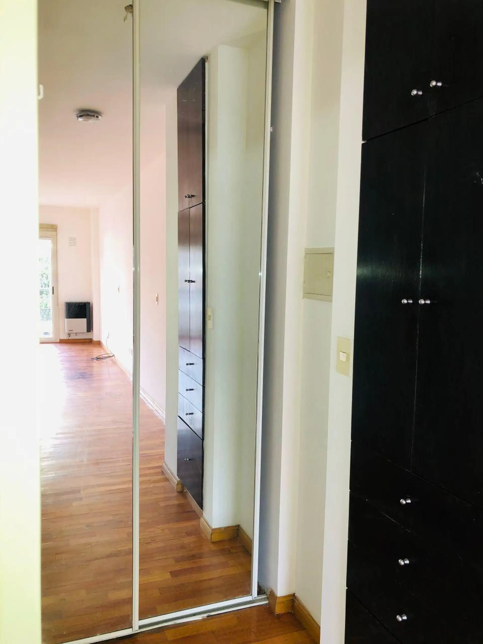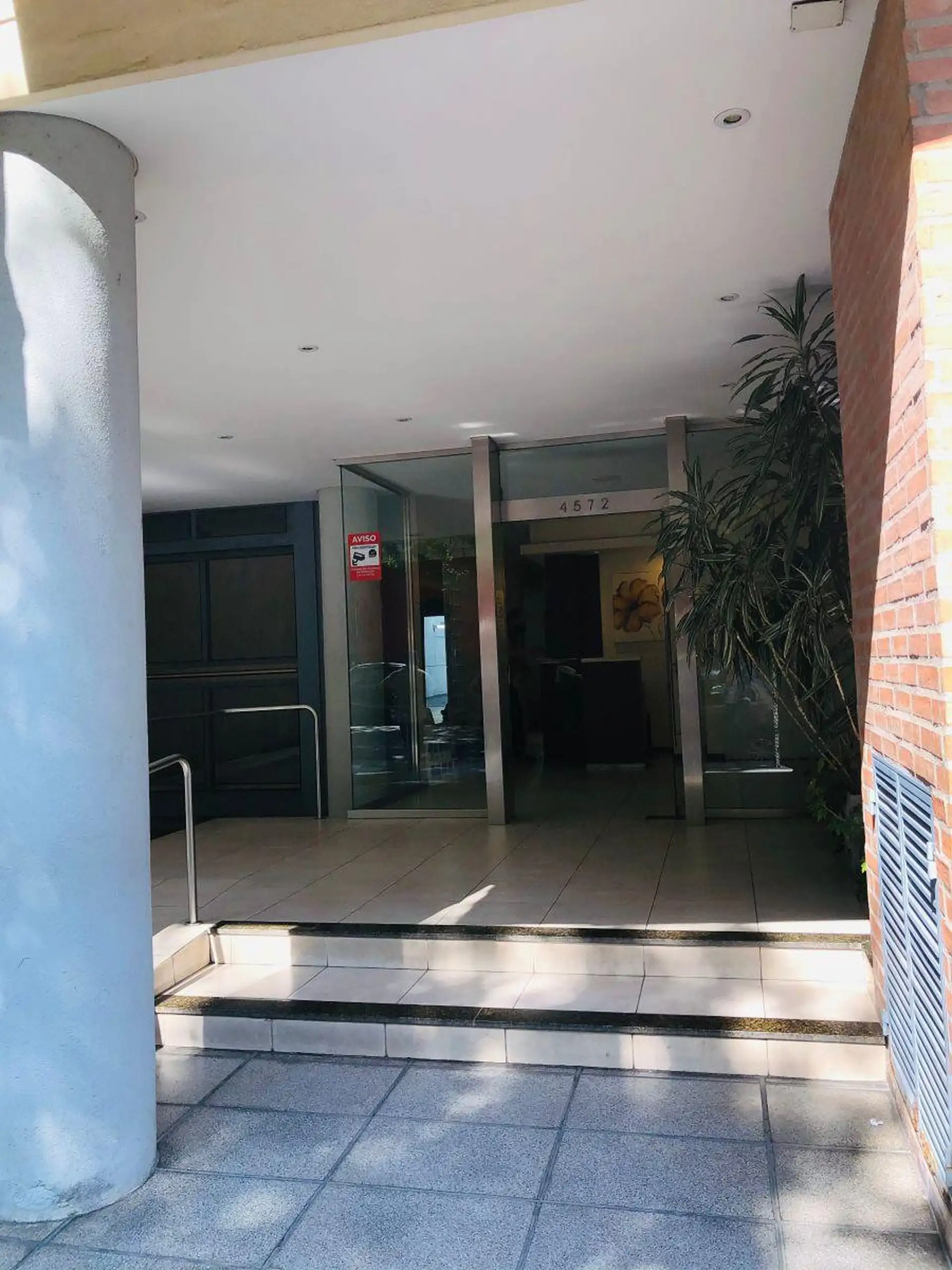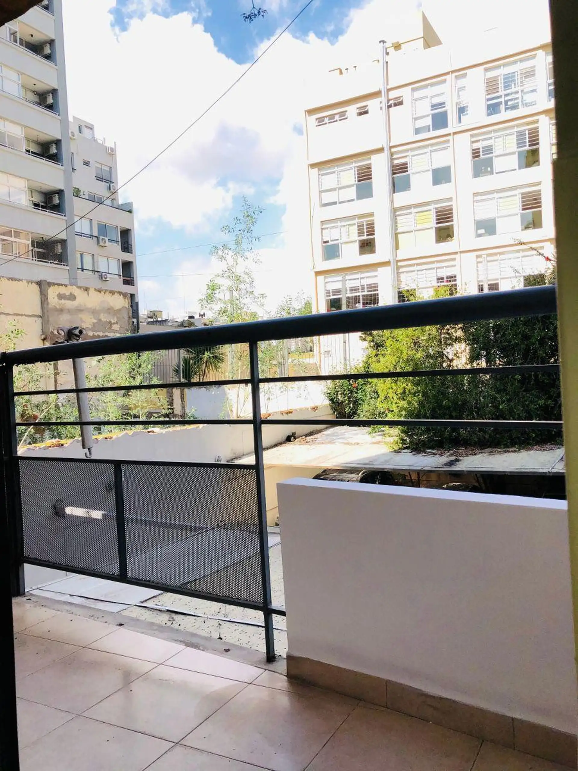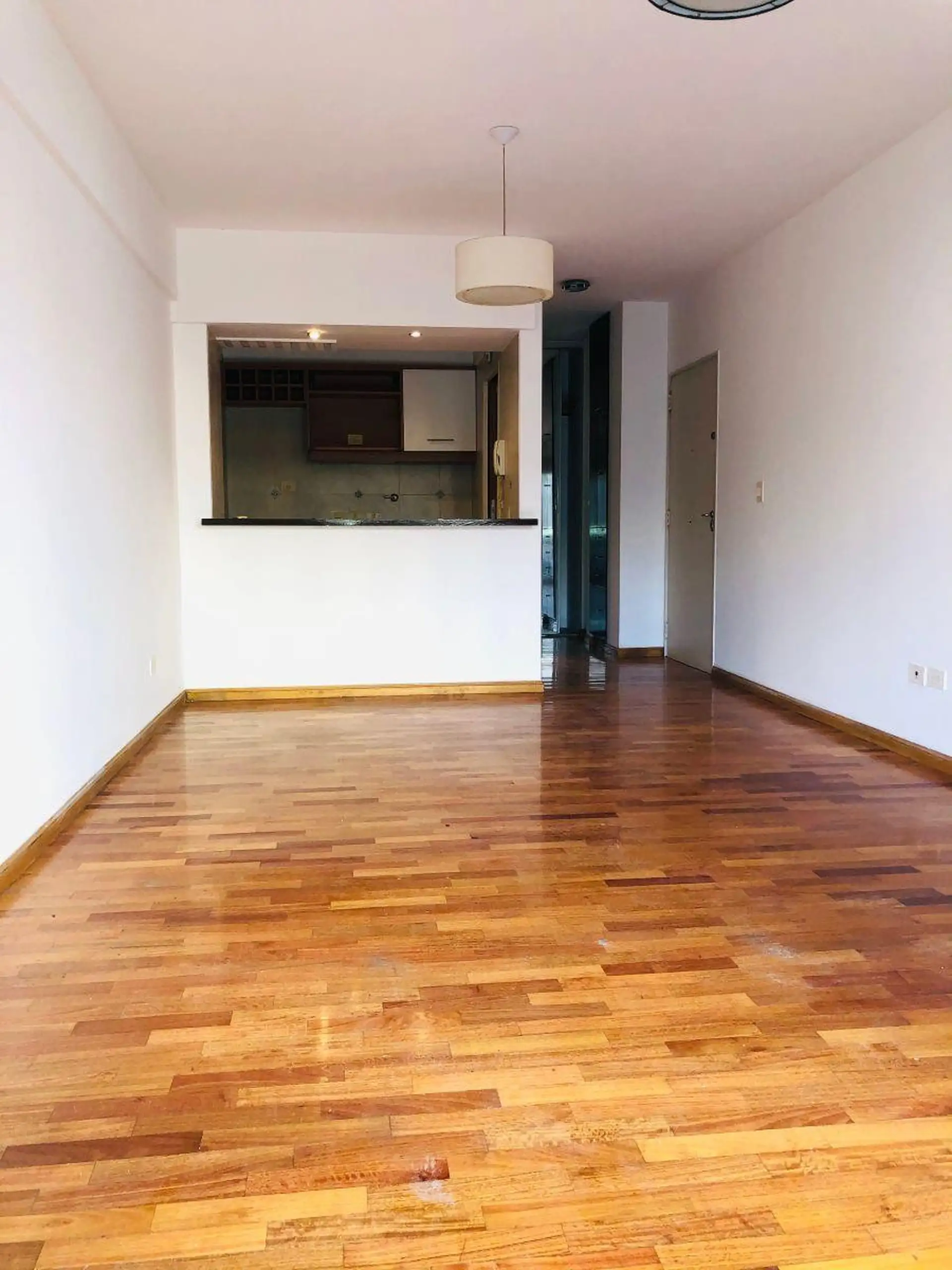 Квартира-студия с окнами во двор (contrafrente) и выходом на балкон. Внутри предусмотрены полноценная ванная, полуинтегрированная кухня с отдельным размещением, разделённым барной стойкой-подсобной зоной, и место для холодильника. Установлены встроенный шкаф с двухстворчатой зеркальной дверцей, паркетные полы; горячая вода — централизованная через котёл. Квартира сдаётся с покраской в белый цвет; в здании есть зона гриля (parrilla).