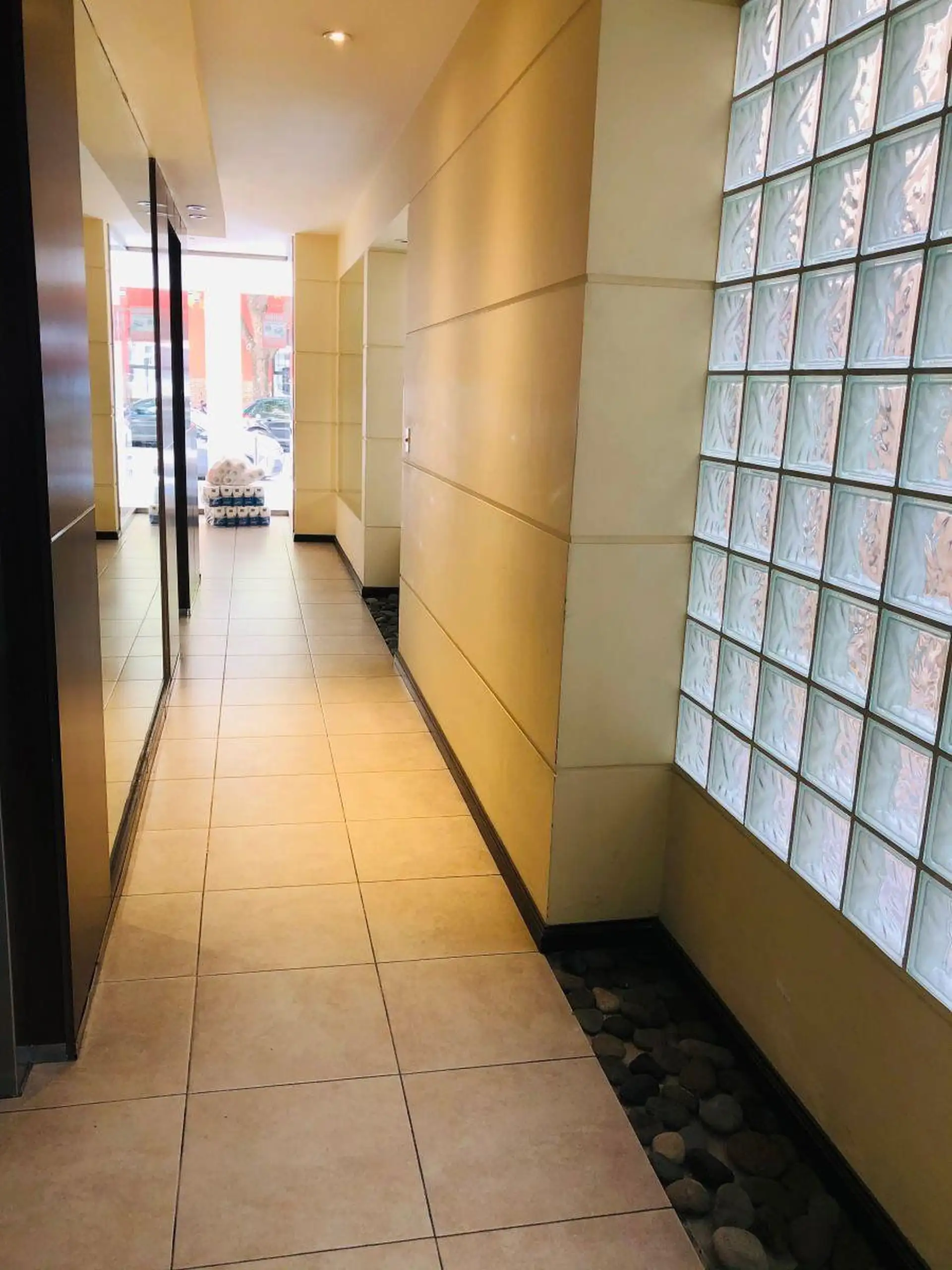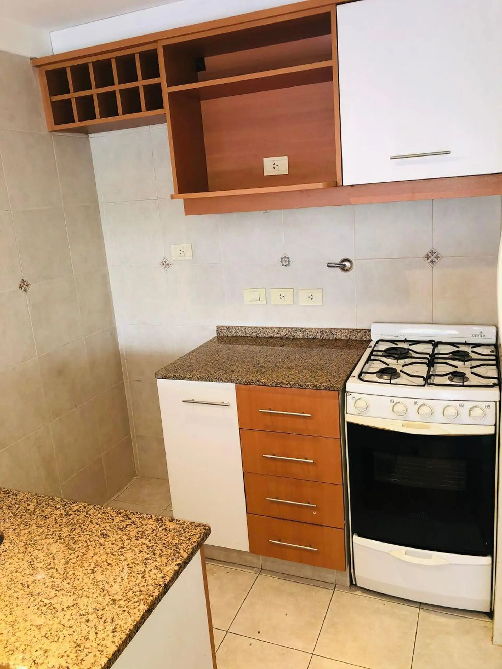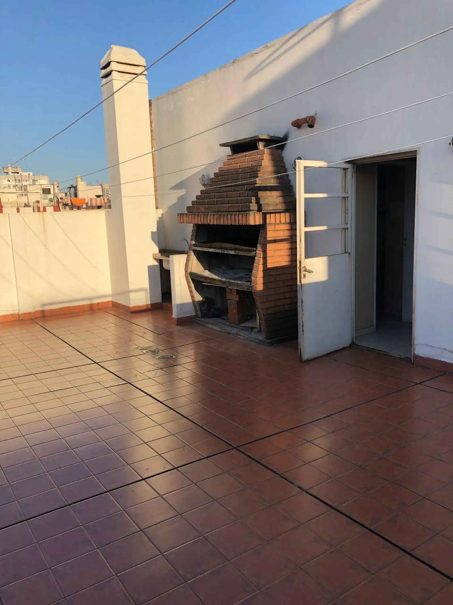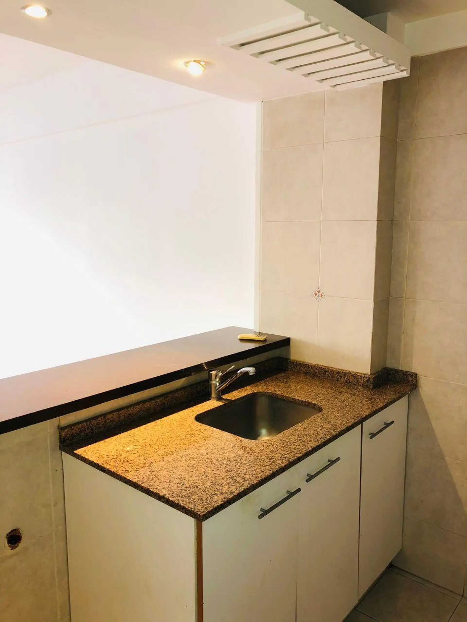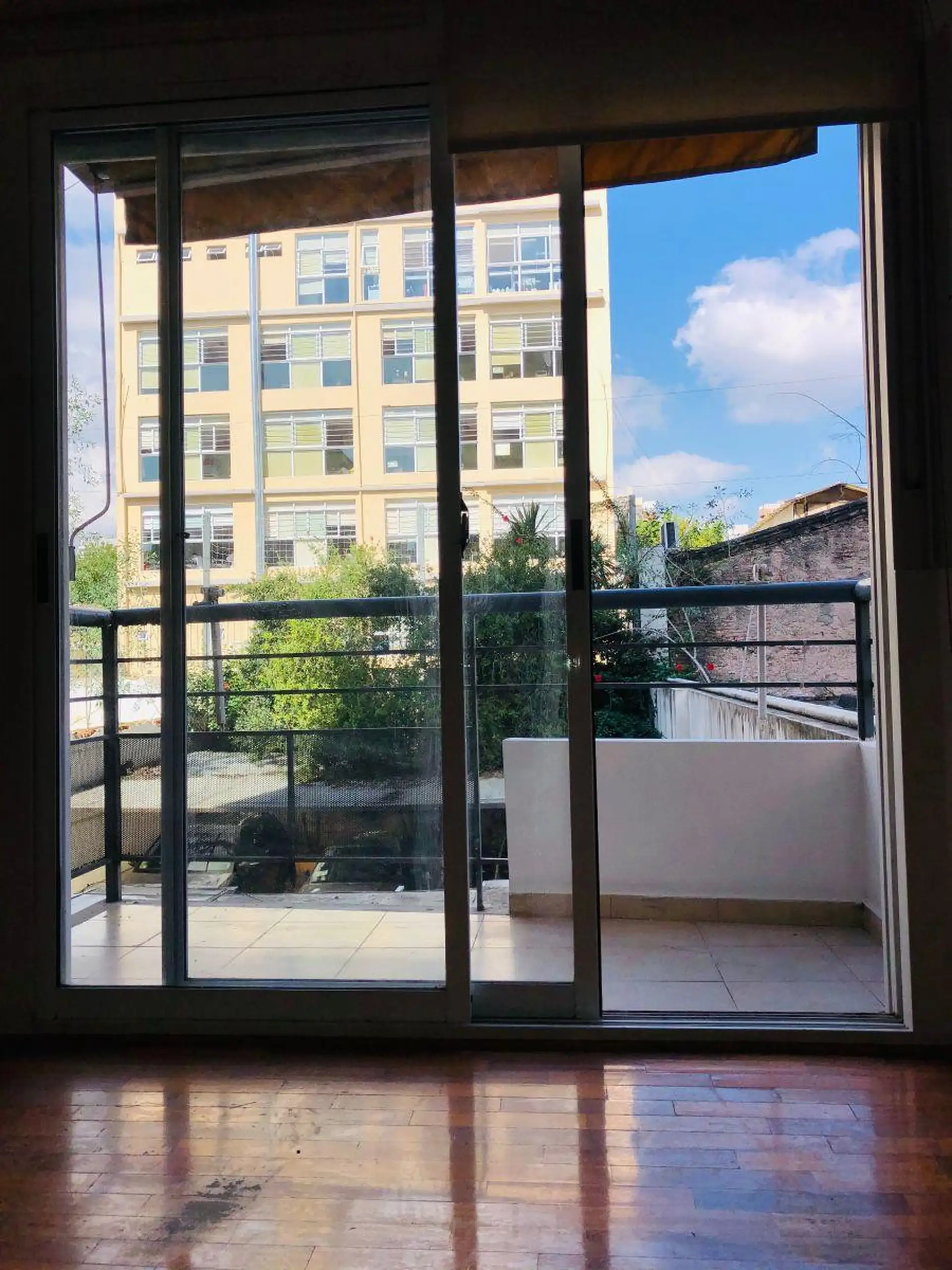 Квартира-студия с окнами во двор (contrafrente) и выходом на балкон. Внутри предусмотрены полноценная ванная, полуинтегрированная кухня с отдельным размещением, разделённым барной стойкой-подсобной зоной, и место для холодильника. Установлены встроенный шкаф с двухстворчатой зеркальной дверцей, паркетные полы; горячая вода — централизованная через котёл. Квартира сдаётся с покраской в белый цвет; в здании есть зона гриля (parrilla).