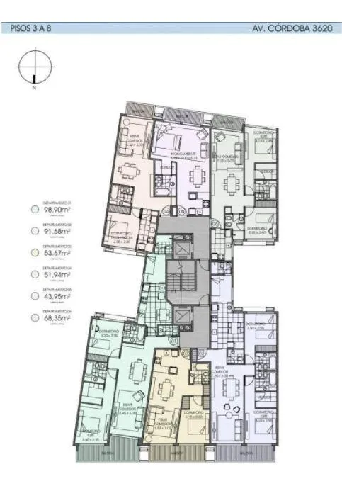 Квартира-студия 44 m² в Almagro, 3-й этаж, окна на балкон с открытым видом. Кухня полуинтегрированная, оборудованная; ванная комната; гардероб. В квартире полы из керамического/порцеланатного покрытия, электрические алюминиевые жалюзи во всех помещениях, индивидуальный тёплый пол с лучистым отоплением. В здании холл, 3 лифта, генератор, бассейн, солярий, общая гостиная для жильцов и тренажёрный зал. Указаны детали проекта Brukman & Mansilla, Balcón и немедленное вселение.