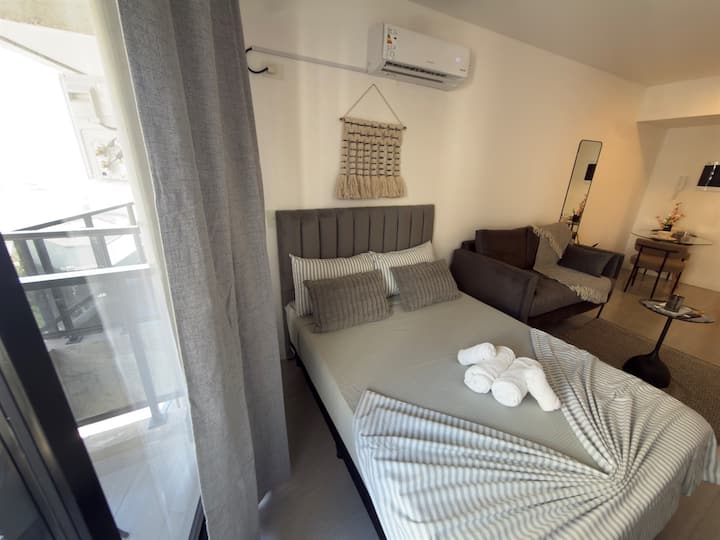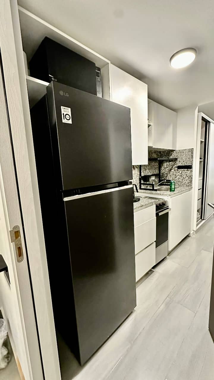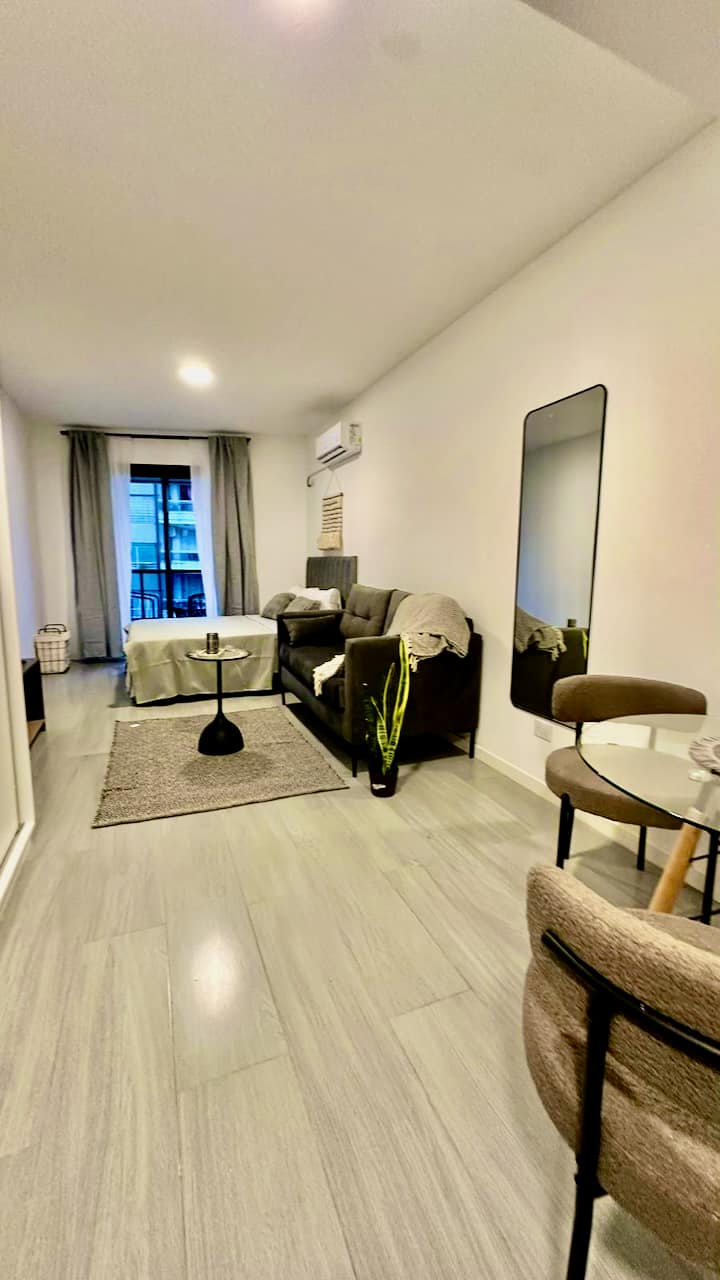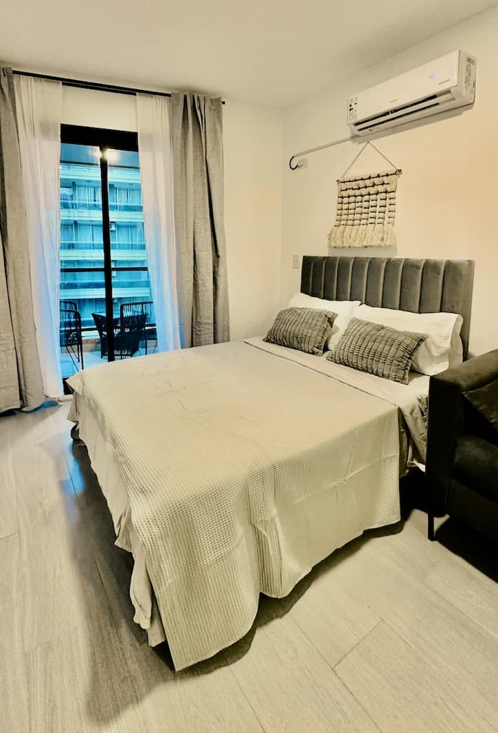 Квартира-студия на 9-м этаже в Palermo, с мебелью. Установлены холодильник Samsung, кондиционер и стиральная машина, в зоне гостиной телевизор TCL ULED 43” с поворотным креплением. В квартире 2 спальных места: кровать с матрасом Serta и раскладной односпальный диван-кровать. На кухне есть 2-конфорочная инфракрасная стеклокерамическая плита, большой аэрогриль на столешнице, тостер, кофеварка, чайник. В ванной угловой душ, фен, утюг и место для хранения; туалет с встроенным биде. Предусмотрены мес