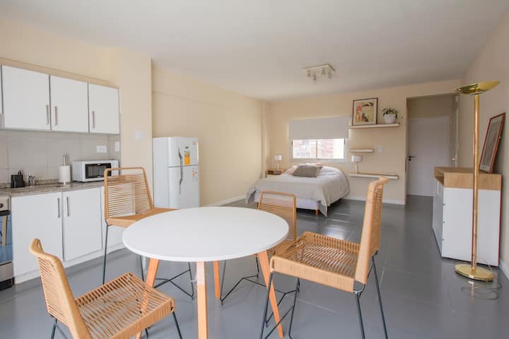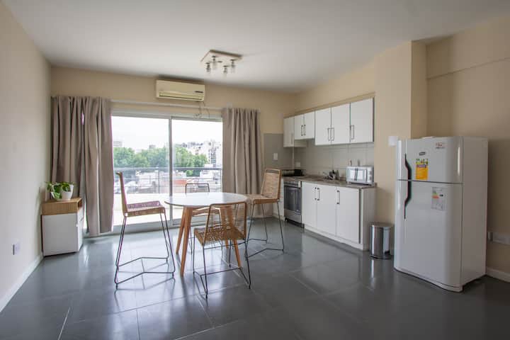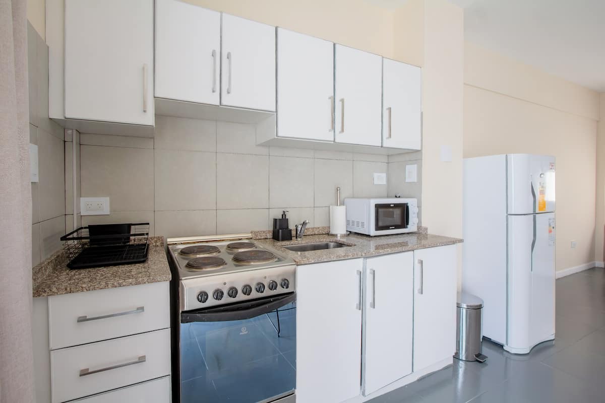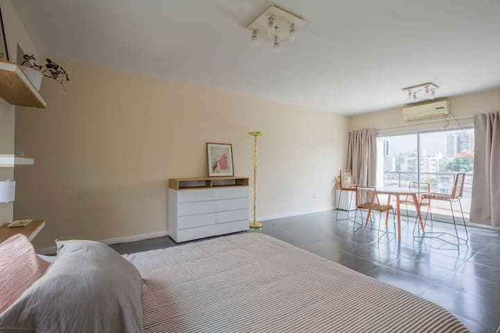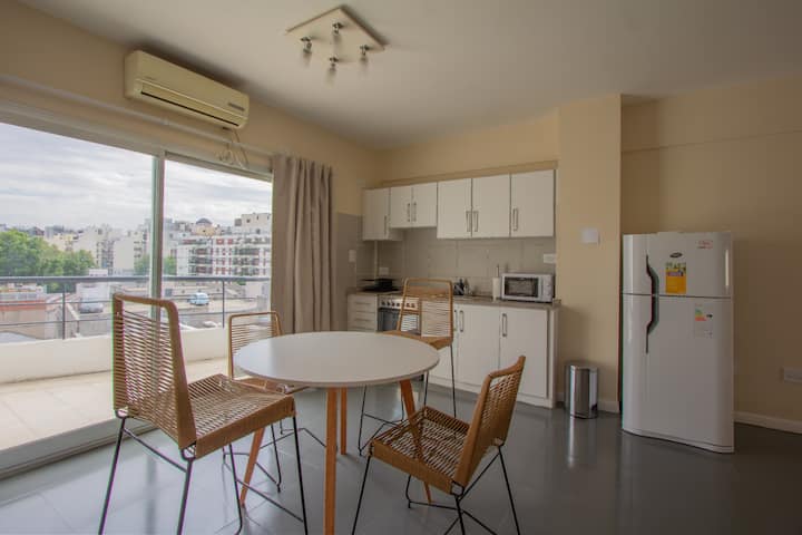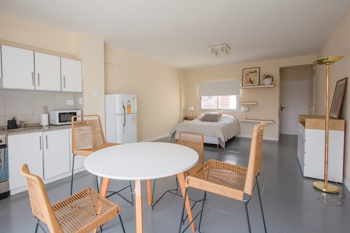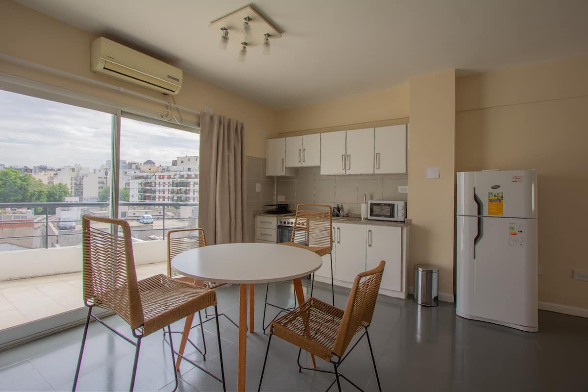 Квартира-студия площадью не указана, с террасой и видом. Окна выходят на террасу; в студии есть двуспальная кровать, обеденная зона, оборудованная кухня и полноценная ванная комната. В здании предусмотрена прачечная (laundry). Квартира оборудована и рассчитана на проживание 1–2 человек.