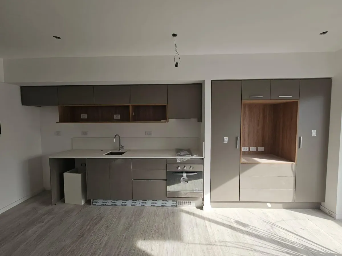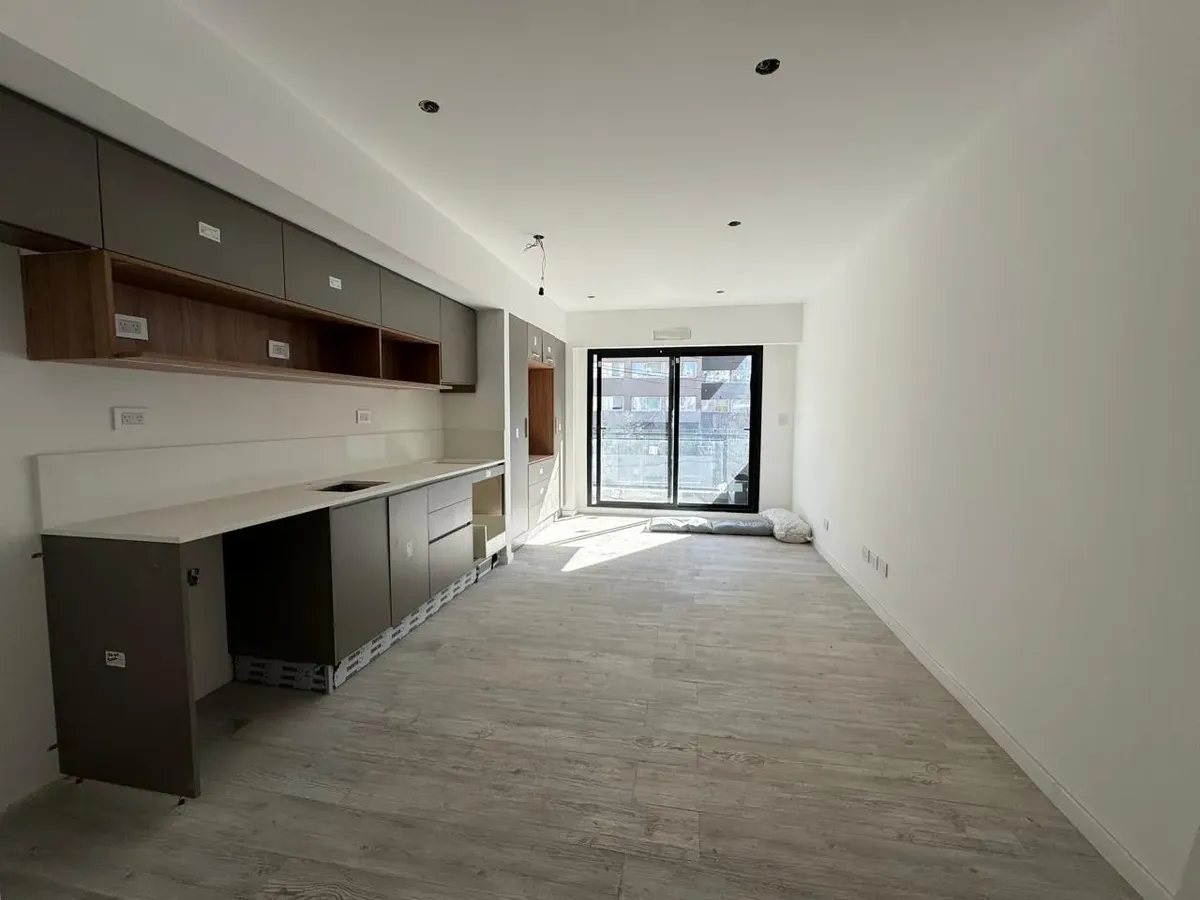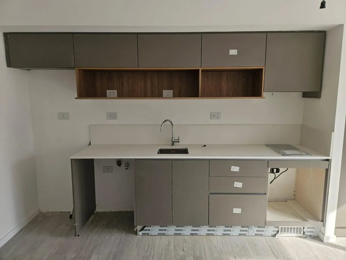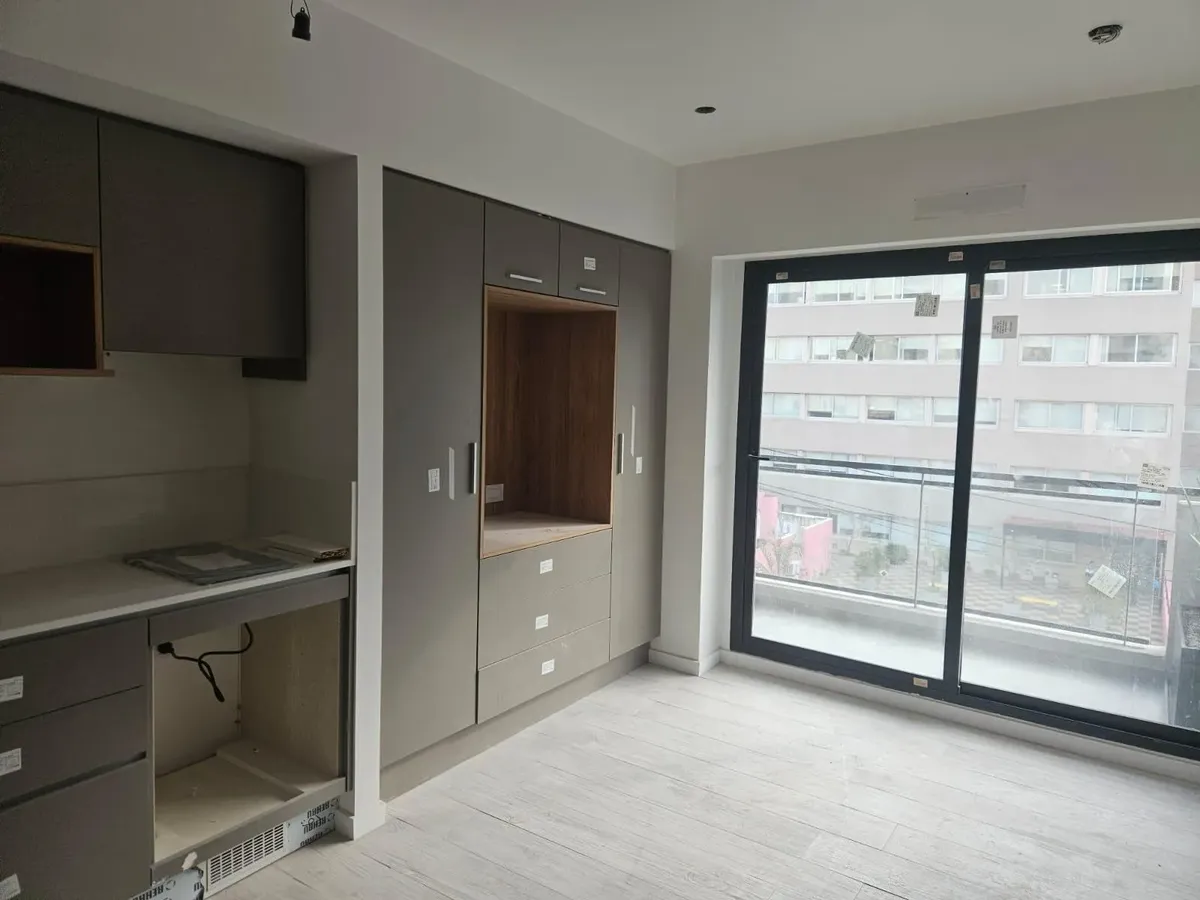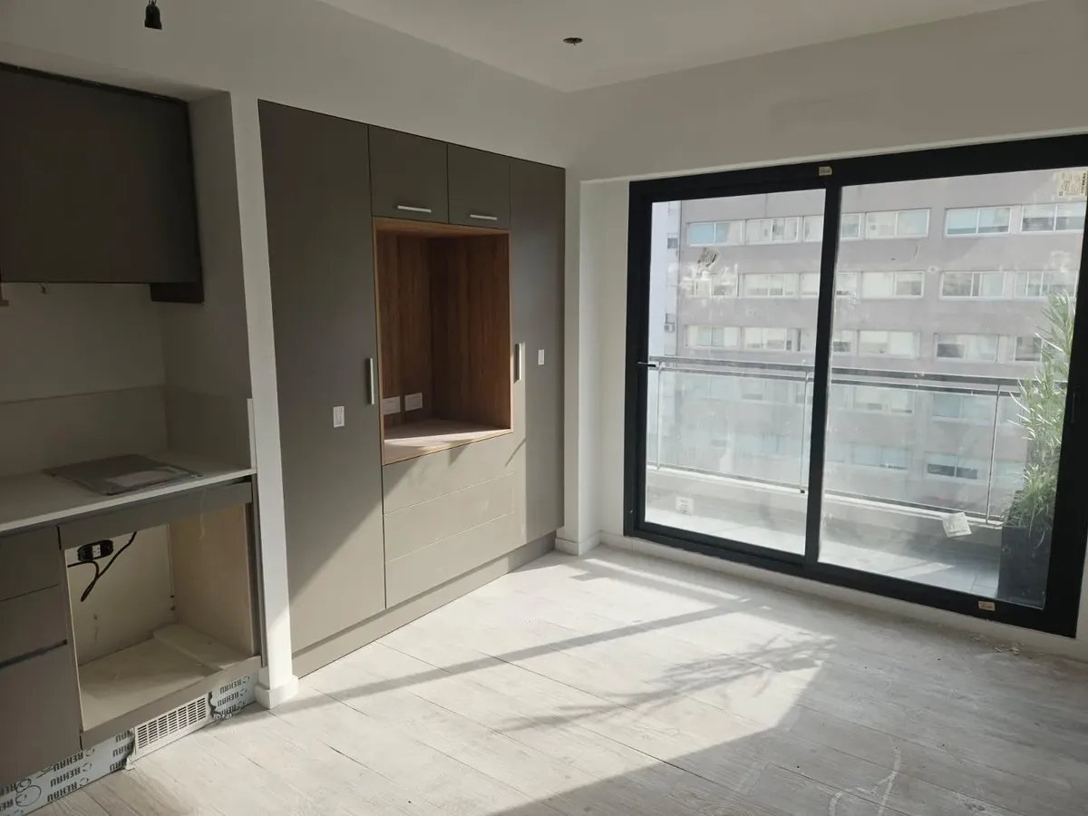 Квартира-студия в WeLive Venezuela в Monserrat. Окна на фасад, предусмотрены балконы и приватные террасы. Установлена кухонная столешница из purastone blanco nube, мойка из нержавеющей стали; нижние шкафы и навесные шкафы из меламина texturada; электрическая плита с 4 конфорками и электрическая духовка. Пол в зоне Estar - Comedor - Dormitorio — плавающий, под дерево; раздвижные фасады шкафов от пола до потолка с направляющими из алюминия; окна и балконные двери с алюминиевыми профилями чёрного ц