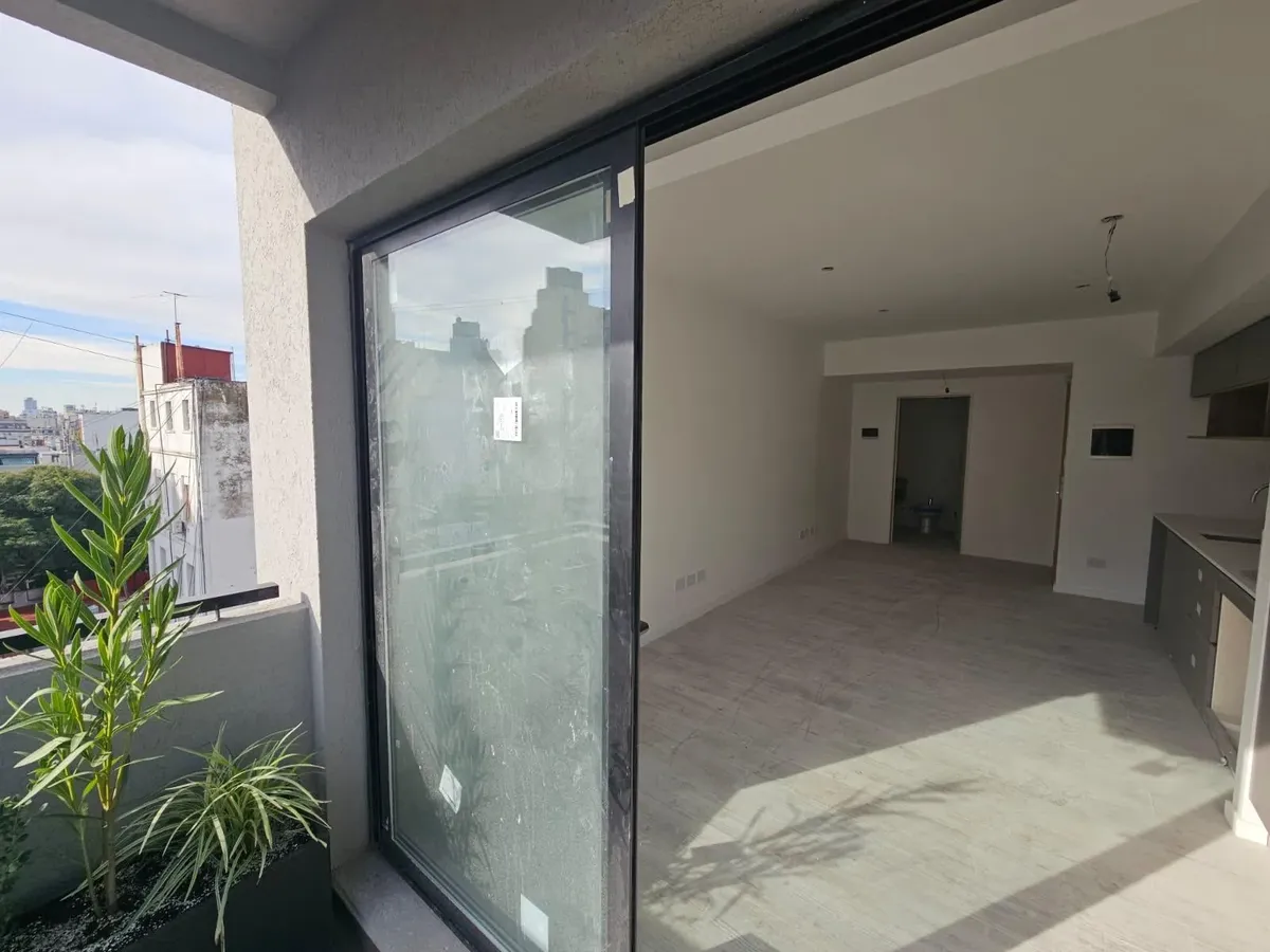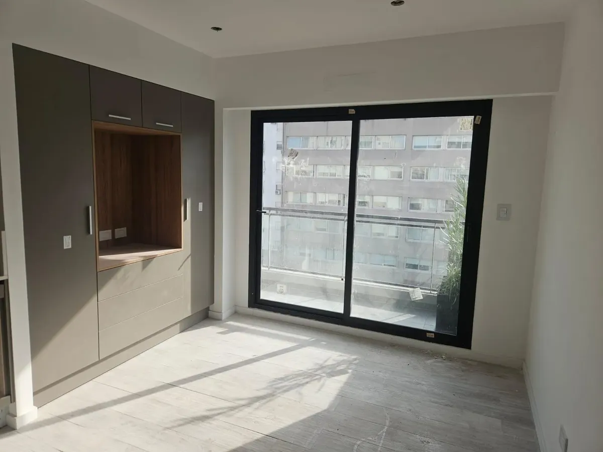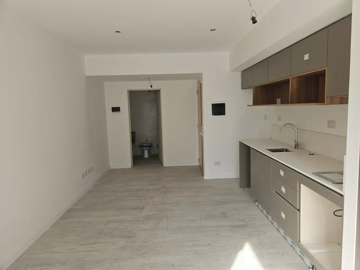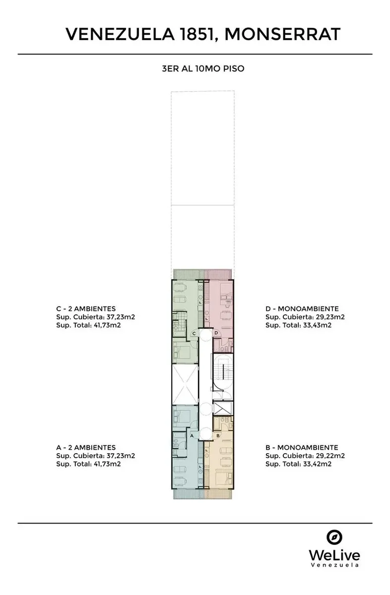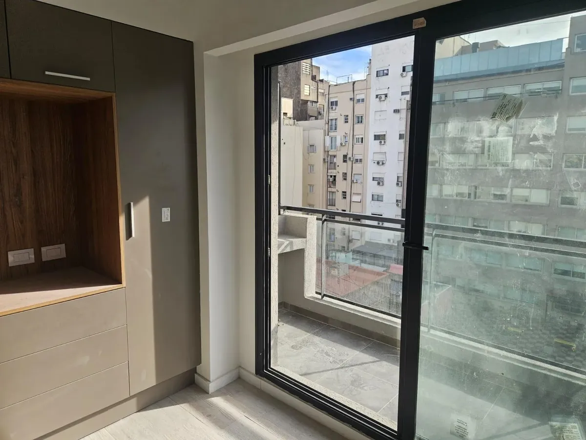 Квартира-студия в WeLive Venezuela в Monserrat. Окна на фасад, предусмотрены балконы и приватные террасы. Установлена кухонная столешница из purastone blanco nube, мойка из нержавеющей стали; нижние шкафы и навесные шкафы из меламина texturada; электрическая плита с 4 конфорками и электрическая духовка. Пол в зоне Estar - Comedor - Dormitorio — плавающий, под дерево; раздвижные фасады шкафов от пола до потолка с направляющими из алюминия; окна и балконные двери с алюминиевыми профилями чёрного ц